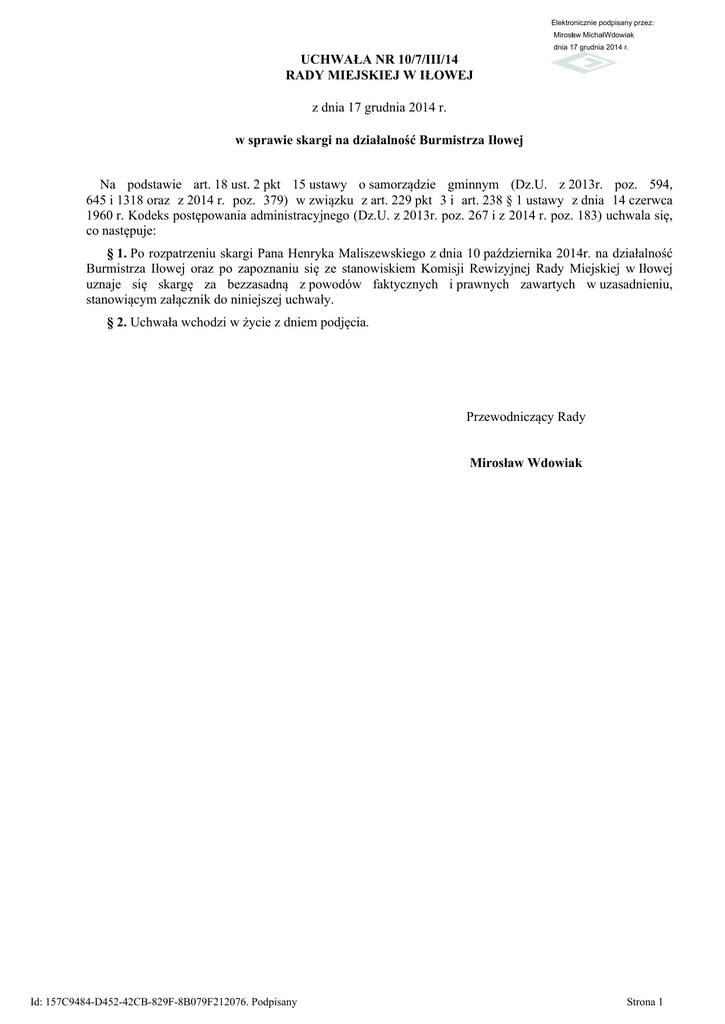 Elektronicznie podpisany przez: Mirosław Michał Wdowiak dnia 17 grudnia 2014 r. UCHWAŁA NR 10/7/III/14 RADY MIEJSKIEJ W IŁOWEJ z dnia 17 grudnia 2014 r. w sprawie skargi na działalność Burmistrza Iłowej Na podstawie art. 18 ust. 2 pkt 15 ustawy o samorządzie gminnym (Dz.U. z 2013r. poz. 594, 645 i 1318 oraz z 2014 r. poz. 379) w związku z art. 229 pkt 3 i art. 238 § 1 ustawy z dnia 14 czerwca 1960 r. Kodeks postępowania administracyjnego (Dz.U. z 2013r. poz. 267 i z 2014 r. poz. 183) uchwala się, co następuje: § 1. Po rozpatrzeniu skargi Pana Henryka Maliszewskiego z dnia 10 października 2014r. na działalność Burmistrza Iłowej oraz po zapoznaniu się ze stanowiskiem Komisji Rewizyjnej Rady Miejskiej w Iłowej uznaje się skargę za bezzasadną z powodów faktycznych i prawnych zawartych w uzasadnieniu, stanowiącym załącznik do niniejszej uchwały. § 2. Uchwała wchodzi w życie z dniem podjęcia. Przewodniczący Rady Mirosław Wdowiak Id: 157C9484-D452-42CB-829F-8B079F212076. Podpisany Strona 1 Załącznik do Uchwały Nr 10/7/III/14 Rady Miejskiej w Iłowej z dnia 17 grudnia 2014 r. Uzasadnienie do uchwały W toku analizy i rozpatrywania skargi Pana Henryka Maliszewskiego, na wniosek Komisji Rewizyjnej, Rada Miejska w Iłowej uznała skargę z dnia 10 października 2014 roku jako bezzasadną. Uzasadnienie faktyczne Pan Henryk Maliszewski w dniu 28 sierpnia 2014 r. zwrócił się z wnioskiem do Burmistrza Iłowej o wykup mieszkania komunalnego, położonego w miejscowości Czyżówek 19. W piśmie tym Pan Maliszewski stwierdza, że mieszkanie położone pod tym adresem zajmuje wraz z rodziną od 1977 r. „z mocy prawa” a od 1993 r. „jako najemca” oraz stwierdza, że jest głównym najemcą lokalu mieszkalnego. Ponadto zaznacza w piśmie, że składał ofertę kupna już kilkakrotnie oraz że nie zalega z opłatami czynszowymi. Ponadto prosi o podanie przyczyny ewentualnej odmowy sprzedaży mieszkania. Na powyższe pismo Pan Henryk Maliszewski nie otrzymał odpowiedzi. W dniu 10 października 2014 r. Pan Henryk Maliszewski skierował pismo do Wydziału Nadzoru i Kontroli Lubuskiego Urzędu Wojewódzkiego w Gorzowie Wielkopolskim sygnowane nagłówkiem „Monit”, w którym to piśmie podnosi brak odpowiedzi Burmistrza Iłowej na pismo z dnia 28 sierpnia 2014 r. a także poinformował Wydział Nadzoru o postępowaniu prowadzonym przez Zakład Gospodarki Komunalnej i Mieszkaniowej w Iłowej (administrator budynków mieszkalnych gminnego zasobu nieruchomości) na zlecenie Burmistrza Iłowej polegającym na nakazaniu opuszczenia w ciągu 7 dni działki przydomowej i wycięciu nasadzonych przez Pana Henryka Maliszewskiego drzew owocowych pod rygorem wszczęcia postępowania przed sądem. Ponadto Pan Henryk Maliszewski wyjaśnia, że według sporządzonego operatu szacunkowego nieruchomości z 2001 r., po wykupie mieszkania będzie posiadał prawo do 70% udziałów w gruncie, stosownie do posiadanych udziałów w budynku. Kończąc pismo Pan Henryk Maliszewski poinformował Wydział Nadzoru i Kontroli LUW między innymi o braku odpowiedzi Burmistrza na pismo z dnia 28 sierpnia 2014 r. 14 października 2014 r. Wojewoda Lubuski (znak sprawy: NK-II.1411.132.2014.JSeń) na podstawie art. 229 pkt 3 Kodeksu postępowania administracyjnego (Dz.U. z 2013 r. poz. 267 z późn. zm.) przekazał pismo Pana Henryka Maliszewskiego z dnia 10 października 2014 r. do Rady Miejskiej w Iłowej w celu rozpatrzenia skargi na działalność Burmistrza Iłowej według przysługującej jej kompetencji do rozpatrywania skargi na burmistrza. Rada Miejska w Iłowej uchwałą Nr 336/6/XLII/14 z dnia 12 listopada 2014 r. przekazała przedmiotową sprawę do Komisji Rewizyjnej. Uzasadnienie prawne Zarówno ustawa z dnia 21 sierpnia 1997 r. o gospodarce nieruchomościami (Dz.U. z 2014 r. poz. 518 z późn. zm.) jak też ustawa z dnia 8 marca 1990 r. o samorządzie gminnym (Dz.U. z 2013 r. poz. 594 z późn. zm.) ani też inny przepis prawa nie zawiera przepisu, który wyznaczał by termin odpowiedzi w sprawach toczących się w związku z wykupem mieszkania – nie można więc zarzucać bezczynność w działaniu, skoro żadna norma prawna nie wyznacza takiego terminu. Jeżeli chodzi o prawo do korzystania z działki, na której położony jest budynek w którym zamieszkuje Pan Henryk Maliszewski razem ze swoją rodziną należy stwierdzić, że skarżący może korzystać z tej działki jedynie w takim zakresie, w jakim reguluje to umowa najmu mieszkania (jako najemca mieszkania nie posiada Pan Maliszewski prawa do swobodnego korzystania z 70% udziału w działce – takie prawo dopiero może powstać po sprzedaży mieszkania). Ponieważ Pan Maliszewski nie podpisał do dnia obecnego umowy najmu mieszkania (informacja otrzymana z Zakładu Gospodarki Komunalnej i Mieszkaniowej w Iłowej), nie ma i nie miał więc podstawy do zagospodarowania w sposób trwały działki (trwałe zasadzenia, trwałe elementy małej architektury). Żądanie ze strony administratora budynku (Kierownika Zakładu Gospodarki Komunalnej i Mieszkaniowej w Iłowej) na „zlecenie” Id: 157C9484-D452-42CB-829F-8B079F212076. Podpisany Strona 1 Burmistrza likwidacji elementów trwałego zagospodarowania działki „przydomowej” jest zasadne i nie stanowi naruszenia prawa. Powołując się na wyżej przytoczone uzasadnienie prawne Rada Miejska w Iłowej po analizie dokonanej na sesji w dniu 17 grudnia 2014 r. nie znalazła w podjętych przez Burmistrza Iłowej działaniach przesłanek wskazujących na zaniedbanie lub nienależyte wykonywanie zadań albo naruszenie praworządności lub interesów skarżącego, a także przewlekłe załatwianie sprawy. W związku z powyższym podjęto rozstrzygnięcie o treści jak na wstępie niniejszego uzasadnienia. Id: 157C9484-D452-42CB-829F-8B079F212076. Podpisany Strona 2