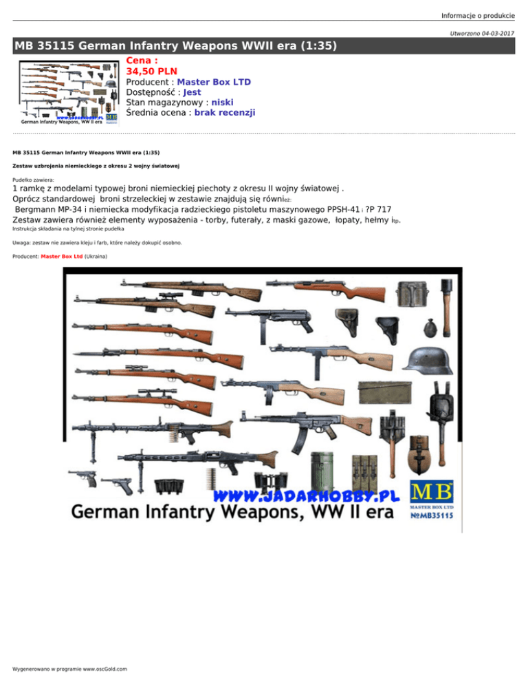 Informacje o produkcie Utworzono 04-03-2017 MB 35115 German Infantry Weapons WWII era (1:35) Cena : 34,50 PLN Producent : Master Box LTD Dostępność : Jest Stan magazynowy : niski Średnia ocena : brak recenzji MB 35115 German Infantry Weapons WWII era (1:35) Zestaw uzbrojenia niemieckiego z okresu 2 wojny światowej Pudełko zawiera: 1 ramkę z modelami typowej broni niemieckiej piechoty z okresu II wojny światowej . Oprócz standardowej broni strzeleckiej w zestawie znajdują się również: Bergmann MP-34 i niemiecka modyfikacja radzieckiego pistoletu maszynowego PPSH-41 i ?P 717 Zestaw zawiera również elementy wyposażenia - torby, futerały, z maski gazowe, łopaty, hełmy itp. Instrukcja składania na tylnej stronie pudełka Uwaga: zestaw nie zawiera kleju i farb, które należy dokupić osobno. Producent: Master Box Ltd (Ukraina) Wygenerowano w programie www.oscGold.com Informacje o produkcie Polecamy! Ważne informacje: Prosimy o dokładne zapoznanie się z zasadami działania naszego sklepu. To bardzo ważne i pozwoli na uniknięcie nieporozumień związanych z koniecznością oczekiwania na przesyłkę. Wszystkie zamówienia realizujemy w kolejności zgłoszeń. Wybranie "przesyłka priorytetowa" jako sposobu wysyłki nie oznacza, że paczka zostanie wysłana na drugi dzień. To tylko rodzaj usługi pocztowej. Firma Jadar-Model jest właścicielem dwóch sklepów. Jeden z nich to sklep internetowy, drugi zaś jest prawdziwy i mieści się w Warszawie, stolicy Polski. Te same modele i akcesoria oferowane w sklepie internetowym sprzedawane są w jednocześnie w obu sklepach. Ponieważ nasza oferta jest bardzo duża nie mamy magazynu z wielką ilością tych samych przedmiotów. Może zdarzyć się, że model, który chcesz kupić został sprzedany w drugim sklepie. Wtedy zostaniesz powiadomiony emailem, że realizacja Twojego zamówienia będzie dłuższa, ponieważ musimy uzupełnić magazyn i czekamy na dostawę od producenta. Prosimy o cierpliwość i wyrozumiałość. Nie ponosimy odpowiedzialności za różnicę w zawartości pudełka w stosunku do prezentowanego zdjęcia. Zdjęcia są zazwyczaj reklamówkami i mogą zawierać również inne części, które nie wchodzą w skład danego produktu. Salon Modelarski Jadar-Model Ul. Jagiellońska 58, 03-468 Warszawa (przy Pl.Hallera) tel.(22) 403-34-30 (w sprawie zamówień prosimy dzwonić: (22) 620-05-39) Tutaj jesteśmy - kliknij poniższy link: Warszawa, Jagiellońska 58 sklep jest czynny w godz.: pon.-pt. 11.oo 19.oo sobota 10.oo 14.oo Master Box Ltd (Ukraina) - Modele plastikowe do sklejania - Master Box Ltd (Ukraina) Wygenerowano w programie www.oscGold.com