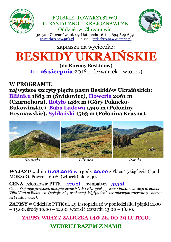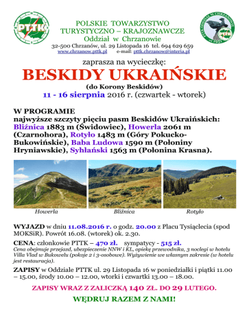 POLSKIE TOWARZYSTWO TURYSTYCZNO – KRAJOZNAWCZE Oddział w Chrzanowie 32-500 Chrzanów, ul. 29 Listopada 16 tel. 694 629 659 www.chrzanow.pttk.pl e-mail: [email protected] zaprasza na wycieczkę: BESKIDY UKRAIŃSKIE (do Korony Beskidów) 11 - 16 sierpnia 2016 r. (czwartek - wtorek) W PROGRAMIE najwyższe szczyty pięciu pasm Beskidów Ukraińskich: Bliźnica 1883 m (Świdowiec), Howerla 2061 m (Czarnohora), Rotyło 1483 m (Góry PokuckoBukowińskie), Baba Ludowa 1590 m (Połoniny Hryniawskie), Syhłański 1563 m (Połonina Krasna). Howerla Bliźnica Rotyło WYJAZD w dniu 11.08.2016 r. o godz. 20.00 z Placu Tysiąclecia (spod MOKSiR). Powrót 16.08. (wtorek) ok. 2.30. CENA: członkowie PTTK – 470 zł. sympatycy - 515 zł. Cena obejmuje przejazd, ubezpieczenie NNW i KL, opiekę przewodnika, 3 noclegi w hotelu Villa Vlad w Bukowelu (pokoje 2 i 3-osobowe). Wyżywienie we własnym zakresie (w hotelu jest restauracja). ZAPISY w Oddziale PTTK ul. 29 Listopada 16 w poniedziałki i piątki 11.00 – 15.00, środy 10.00 – 12.00, wtorki i czwartki 13.00 – 18.00. ZAPISY WRAZ Z ZALICZKĄ 140 ZŁ. DO 29 LUTEGO. WĘDRUJ RAZEM Z NAMI!