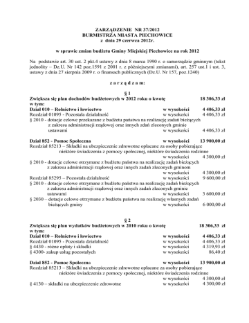 ZARZĄDZENIE NR 37/2012 BURMISTRZA MIASTA PIECHOWICE z dnia 29 czerwca 2012r. w sprawie zmian budżetu Gminy Miejskiej Piechowice na rok 2012 Na podstawie art. 30 ust. 2 pkt.4 ustawy z dnia 8 marca 1990 r. o samorządzie gminnym (tekst jednolity – Dz.U. Nr 142 poz.1591 z 2001 r. z późniejszymi zmianami), art. 257 ust.1 i ust. 3, ustawy z dnia 27 sierpnia 2009 r. o finansach publicznych (Dz.U. Nr 157, poz.1240) z a r z ą d z a m: §1 Zwiększa się plan dochodów budżetowych w 2012 roku o kwotę 18 306,33 zł w tym: Dział 010 – Rolnictwo i łowiectwo w wysokości 4 406,33 zł Rozdział 01095 - Pozostała działalność w wysokości 4 406,33 zł § 2010 - dotacje celowe przekazane z budżetu państwa na realizację zadań bieżących z zakresu administracji rządowej oraz innych zdań zleconych gminie ustawami w wysokości 4 406,33 zł Dział 852 - Pomoc Społeczna w wysokości 13 900,00 zł Rozdział 85213 – Składki na ubezpieczenie zdrowotne opłacane za osoby pobierające niektóre świadczenia z pomocy społecznej, niektóre świadczenia rodzinne w wysokości 4 300,00 zł § 2010 - dotacje celowe otrzymane z budżetu państwa na realizację zadań bieżących z zakresu administracji rządowej oraz innych zadań zleconych gminom 4 300,00 zł w wysokości Rozdział 85295 – Pozostała działalność w wysokości 9 600,00 zł § 2010 - dotacje celowe otrzymane z budżetu państwa na realizację zadań bieżących z zakresu administracji rządowej oraz innych zadań zleconych gminie ustawami w wysokości 3 600,00 zł § 2030 – dotacje celowe otrzymane z budżetu państwa na realizację własnych zadań bieżących gminy w wysokości 6 000,00 zł §2 Zwiększa się plan wydatków budżetowych w 2010 roku o kwotę w tym: Dział 010 – Rolnictwo i łowiectwo w wysokości Rozdział 01095 - Pozostała działalność w wysokości § 4430 - różne opłaty i składki w wysokości § 4300- zakup usług pozostałych w wysokości 18 306,33 zł 4 406,33 zł 4 406,33 zł 4 319,93 zł 86,40 zł Dział 852 - Pomoc Społeczna w wysokości 13 900,00 zł Rozdział 85213 – Składki na ubezpieczenie zdrowotne opłacane za osoby pobierające niektóre świadczenia z pomocy społecznej, niektóre świadczenia rodzinne w wysokości 4 300,00 zł 4 300,00 zł § 4130 – składki na ubezpieczenie zdrowotne w wysokości Rozdział 85295 – Pozostała działalność § 4300 – zakup usług pozostałych § 3110 – świadczenia społeczne w wysokości w wysokości w wysokości 9 600,00 zł 6 000,00 zł 3 600,00 zł §3 Dokonuje się zmian w planie wydatków budżetowych 2012 roku miedzy rozdziałami i paragrafami zgodnie z załącznikiem nr 1 do niniejszego zarządzenia. §4 Budżet Gminy Miejskiej Piechowice po wprowadzeniu zmian niniejszym Zarządzeniem osiąga następujące wielkości: dochody budżetowe – 18 067 642,79 zł z tego: - dochody bieżące – 16 454 346,79 zł - dochody majątkowe – 1 613 296,00 zł wydatki budżetowe – 19 245 196,64 zł wydatki bieżące 16 181 016,64 zł wydatki majątkowe - 3 064 180,00 zł §5 Zarządzenie wchodzi w życie w dniu podpisania. Uzasadnienie do Zarządzenia nr 37/2012 Burmistrza Miasta Piechowice z dnia 29 czerwca 2012r. w sprawie zmian budżetu Gminy Miejskiej Piechowice na rok 2012 1. Na podstawie pisma Wojewody Dolnośląskiego z dnia 16.04.2011r. nr FB.BP.3111.39.11 zwiększony został plan dotacji w dziale 010 – Rolnictwo i łowiectwo, rozdział 01095 o kwotę 4 406,33 zł z przeznaczeniem na zwrot podatku akcyzowego zawartego w cenie oleju napędowego wykorzystywanego do produkcji rolnej. 2. Na podstawie pisma Wojewody Dolnośląskiego z dnia 12.06.2012r. nr PS.ZSL.3146.71.2012 przyznana została dotacja w rozdziale 85213 § 2010 w wysokości 4 300 zł, z przeznaczeniem na opłacenie składki na ubezpieczenie zdrowotne za osoby pobierające świadczenia pielęgnacyjne i tym samym, zwiększone zostały wydatki w rozdziale 85213 o kwotę dotacji. 3. Na podstawie pism Wojewody Dolnośląskiego z dnia 18.06.2012r. nr PS-ZSL-3146-77/2012 przyznana została dotacja w rozdziale 85295 § 2010 w wysokości 3 600 zł, która przeznaczona została na wspieranie osób pobierających świadczenie pielęgnacyjne. 4. Na podstawie pisma Wojewody Dolnośląskiego z dnia 26.06.2012r. znak: PS-ZSI-314685/2012 zwiększony został plan finansowy Gminy Miejskiej Piechowice w dziale 852 – Opieka społeczna rozdział 85295 – pozostała działalność o kwotę 6 000 zł z przeznaczeniem jej na realizację wieloletniego programu „Pomoc państwa w zakresie dożywiania”. 5. Zmiany dokonane w załączniku do zarządzenia wynikają z koniecznością dostosowania klasyfikacji budżetowej do charakteru ekonomicznego wydatków. Załącznik Nr 1 do Zarządzenia nr 37/2012 z dnia 29 czerwca 2012r. DZIAŁ ROZDZ. § WYSZCZEGÓLNIENIE 3 4 KWOTA ZMNIEJSZENIA ZWIĘKSZENIA 1 2 600 60078 TRANSPORT i ŁĄCZNOŚĆ Usuwanie skutków klęsk żywiołowych 4270 Zakup usług remontowych 5 6 5 000,00 5 000,00 5 000,00 4300 Zakup usług pozostałych 750 75023 75075 900 90001 921 92195 926 92605 ADMINISTRACJA PUBLICZNA Urząd Miasta 5 000,00 3 440,00 3 200,00 4610 koszty postępowania sądowego i prokurator. 4360 Zakup usług telefonii komórkowej 3 200,00 Promocja jednostek samorządu teryt. 240,00 4300 Zakup usług pozostałych 4260 Zakup energii GOSPOD.KOMUNALNA I OCHR.ŚROD. Gospod.Ściekowa o ochrona wód 4300 Zakup usług pozostałych 4580 Pozostałe odsetki KULTURA I OCHRONA DZIEDZICTWA NAROD Pozostała działalność 4177 Wynagrodzenia bezosobowe 4179 Wynagrodzenia bezosobowe 4307 Zakup usług pozostałych 4309 Zakup usług pozostałych KULTURA FIZYCZNA Zadania w zakresie kultury fizycznej 4300 Zakup usług pozostałych 4170 Wynagrodzenia bezosobowe 4210 Zakup materiałów i wyposażenia Ogółem 5 000,00 5 000,00 3 440,00 3 200,00 3 200,00 240,00 240,00 5,00 5,00 240,00 5,00 5,00 5,00 1 463,00 1 463,00 5,00 1 463,00 1 463,00 1 243,55 219,45 1 000,00 1 000,00 1 243,55 2