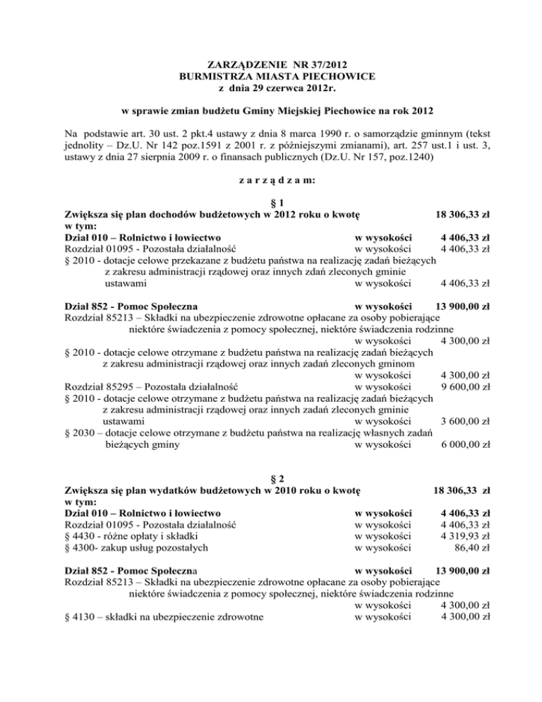 Zarządzenie nr 37/2012 w sprawie zmian budżetu