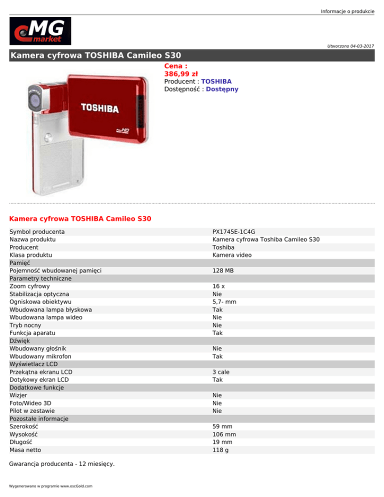 Informacje o produkcie Utworzono 04-03-2017 Kamera cyfrowa TOSHIBA Camileo S30 Cena : 386,99 zł Producent : TOSHIBA Dostępność : Dostępny Kamera cyfrowa TOSHIBA Camileo S30 Symbol producenta Nazwa produktu Producent Klasa produktu Pamięć Pojemność wbudowanej pamięci Parametry techniczne Zoom cyfrowy Stabilizacja optyczna Ogniskowa obiektywu Wbudowana lampa błyskowa Wbudowana lampa wideo Tryb nocny Funkcja aparatu Dźwięk Wbudowany głośnik Wbudowany mikrofon Wyświetlacz LCD Przekątna ekranu LCD Dotykowy ekran LCD Dodatkowe funkcje Wizjer Foto/Wideo 3D Pilot w zestawie Pozostałe informacje Szerokość Wysokość Długość Masa netto Gwarancja producenta - 12 miesięcy. Wygenerowano w programie www.oscGold.com PX1745E-1C4G Kamera cyfrowa Toshiba Camileo S30 Toshiba Kamera video 128 MB 16 x Nie 5,7- mm Tak Nie Nie Tak Nie Tak 3 cale Tak Nie Nie Nie 59 mm 106 mm 19 mm 118 g