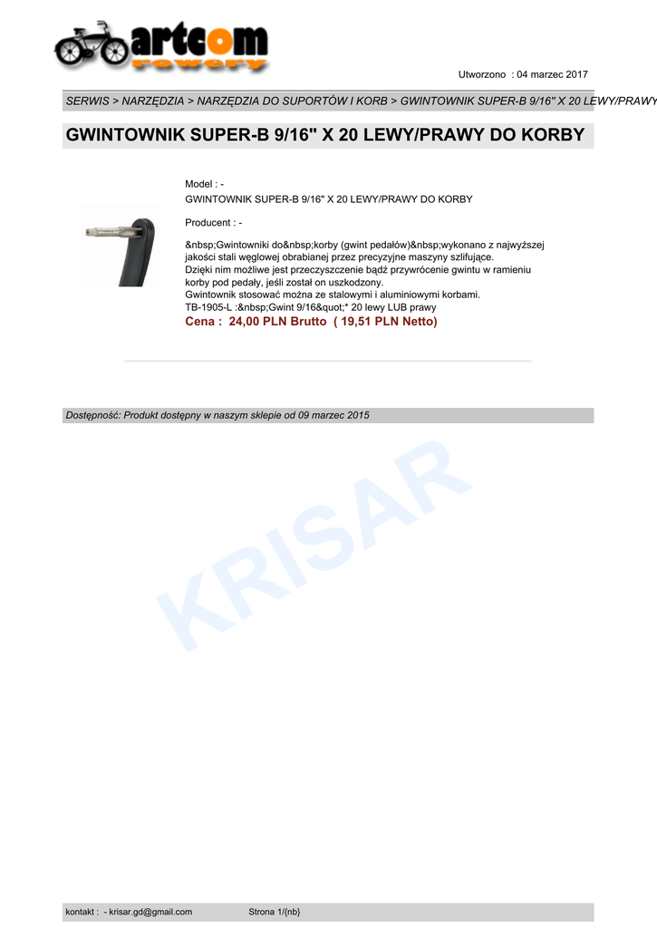 Utworzono : 04 marzec 2017 SERWIS > NARZĘDZIA > NARZĘDZIA DO SUPORTÓW I KORB > GWINTOWNIK SUPER-B 9/16" X 20 LEWY/PRAWY GWINTOWNIK SUPER-B 9/16" X 20 LEWY/PRAWY DO KORBY Model : GWINTOWNIK SUPER-B 9/16" X 20 LEWY/PRAWY DO KORBY Producent : Gwintowniki do korby (gwint pedałów) wykonano z najwyższej jakości stali węglowej obrabianej przez precyzyjne maszyny szlifujące. Dzięki nim możliwe jest przeczyszczenie bądź przywrócenie gwintu w ramieniu korby pod pedały, jeśli został on uszkodzony. Gwintownik stosować można ze stalowymi i aluminiowymi korbami. TB-1905-L : Gwint 9/16"* 20 lewy LUB prawy Cena : 24,00 PLN Brutto ( 19,51 PLN Netto) Dostępność: Produkt dostępny w naszym sklepie od 09 marzec 2015 R A K kontakt : - [email protected] S I R Strona 1/{nb}
