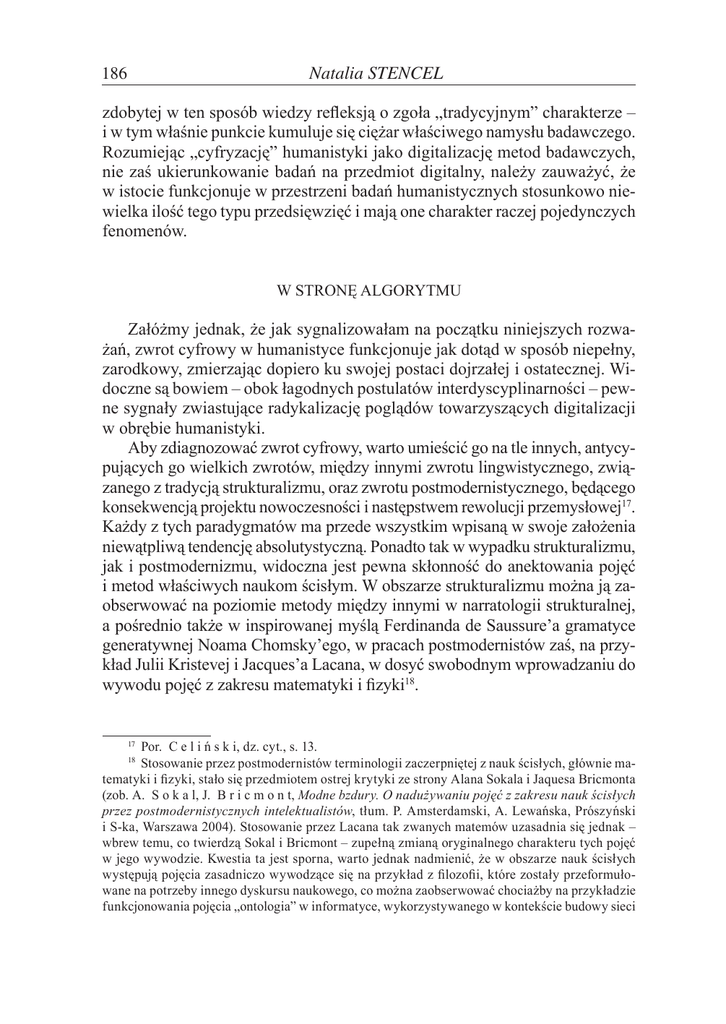 Natalia STENCEL 186 zdobytej w ten sposób wiedzy refleksją o zgoła „tradycyjnym” charakterze – i w tym właśnie punkcie kumuluje się ciężar właściwego namysłu badawczego. Rozumiejąc „cyfryzację” humanistyki jako digitalizację metod badawczych, nie zaś ukierunkowanie badań na przedmiot digitalny, należy zauważyć, że w istocie funkcjonuje w przestrzeni badań humanistycznych stosunkowo niewielka ilość tego typu przedsięwzięć i mają one charakter raczej pojedynczych fenomenów. W STRONĘ ALGORYTMU Załóżmy jednak, że jak sygnalizowałam na początku niniejszych rozważań, zwrot cyfrowy w humanistyce funkcjonuje jak dotąd w sposób niepełny, zarodkowy, zmierzając dopiero ku swojej postaci dojrzałej i ostatecznej. Widoczne są bowiem – obok łagodnych postulatów interdyscyplinarności – pewne sygnały zwiastujące radykalizację poglądów towarzyszących digitalizacji w obrębie humanistyki. Aby zdiagnozować zwrot cyfrowy, warto umieścić go na tle innych, antycypujących go wielkich zwrotów, między innymi zwrotu lingwistycznego, związanego z tradycją strukturalizmu, oraz zwrotu postmodernistycznego, będącego konsekwencją projektu nowoczesności i następstwem rewolucji przemysłowej17. Każdy z tych paradygmatów ma przede wszystkim wpisaną w swoje założenia niewątpliwą tendencję absolutystyczną. Ponadto tak w wypadku strukturalizmu, jak i postmodernizmu, widoczna jest pewna skłonność do anektowania pojęć i metod właściwych naukom ścisłym. W obszarze strukturalizmu można ją zaobserwować na poziomie metody między innymi w narratologii strukturalnej, a pośrednio także w inspirowanej myślą Ferdinanda de Saussure’a gramatyce generatywnej Noama Chomsky’ego, w pracach postmodernistów zaś, na przykład Julii Kristevej i Jacques’a Lacana, w dosyć swobodnym wprowadzaniu do wywodu pojęć z zakresu matematyki i fizyki18. Por. C e l i ń s k i, dz. cyt., s. 13. Stosowanie przez postmodernistów terminologii zaczerpniętej z nauk ścisłych, głównie matematyki i fizyki, stało się przedmiotem ostrej krytyki ze strony Alana Sokala i Jaquesa Bricmonta (zob. A. S o k a l, J. B r i c m o n t, Modne bzdury. O nadużywaniu pojęć z zakresu nauk ścisłych przez postmodernistycznych intelektualistów, tłum. P. Amsterdamski, A. Lewańska, Prószyński i S-ka, Warszawa 2004). Stosowanie przez Lacana tak zwanych matemów uzasadnia się jednak – wbrew temu, co twierdzą Sokal i Bricmont – zupełną zmianą oryginalnego charakteru tych pojęć w jego wywodzie. Kwestia ta jest sporna, warto jednak nadmienić, że w obszarze nauk ścisłych występują pojęcia zasadniczo wywodzące się na przykład z filozofii, które zostały przeformułowane na potrzeby innego dyskursu naukowego, co można zaobserwować chociażby na przykładzie funkcjonowania pojęcia „ontologia” w informatyce, wykorzystywanego w kontekście budowy sieci 17 18 Iluzja postępu? 187 Pod tymi dwoma względami zwrot cyfrowy wykazuje zasadnicze podobieństwo do swoich wielkich antenatów – w punkcie docelowym i ostatecznym cyfryzacja musi okazać się systemem o ambicjach idących w stronę budowy holistycznego projektu nowej humanistyki. Digitalizacja procesu poznawczego w naukach humanistycznych w oczywisty sposób pociąga za sobą poważną zmianę w pojmowaniu humanistyki w ogóle i zmierza do upodobnienia jej do nauk ścisłych: posługiwanie się narzędziami cyfrowymi wiąże się z preferowaniem w obrębie dyskursu badawczego kształtów generatywnych, rizomatycznych, poddanych logice algorytmicznej19, ukierunkowanych raczej nie na skomplikowanie i wielowymiarowość danego tekstu, a na prostotę obrazu, schematu, siatki. W systemie podległym cyfryzacji zachodzi potrzeba anulowania, pominięcia i zdekonstruowania wypracowanego przez tradycyjną humanistykę aparatu pojęciowego, który ze swej natury opiera się algorytmizacji. Tym samym – zachodzi konieczność stosowania radykalnego uproszczenia. Konsekwencją dążenia do algorytmu dyktowanego przez narzędzia cyfrowe jest zaniknięcie kompensacyjnej funkcji humanistyki – funkcji, która stanowi pewną przeciwwagę dla mechanizmu coraz szybszego i gwałtowniejszego zapominania jako konsekwencji ciągłej i nieustannej modernizacji. Jakkolwiek obowiązywanie w obrębie nauk humanistycznych mechanizmów właściwych strukturom digitalnym determinuje lub wspiera po części proces szybkiego zapominania20, paradoksalnie cyfryzacja wraz ze swoim algorytmem musi okazać się niewydolna, gdy podejmie badania tejże utraty pamięci w procesach kulturotwórczych; oznacza to mniej więcej tyle, że „cyfrowa” humanistyka nie będzie w stanie pełnowymiarowo diagnozować samej siebie jako konkretnego tworu powstałego w granicach kultury. Przez tę niewydolność najprawdopodobniej odrzuci potrzebę wprowadzania jakiejkolwiek refleksji czy pytań z tego zakresu, co zasadniczo wydaje się niepokojące. Trzeba bowiem pamiętać, że doświadczenie kultury jest w równym stopniu oparte na procesie pamiętania i zapominania, aktywność tych procesów można zaś opisać jako „nieidentyczną dynamikę zmienności”21: z jednej strony funkcjonuje „długie trwanie”22, z drugiej zaś pojawiają się zjawiska pokoleniowe i efemeryczne, których wzajemne relacje i przenikanie świadczą o istnieniu semantycznych oraz w badaniach nad sztuczną inteligencją (zob. A.M. G a d o m s k i, Ontology and Knowledge: Meta-ontological Perspective, http://erg4146.casaccia.enea.it/Ont-know.htm). 19 Por. C e l i ń s k i, dz. cyt., s. 13. 20 Dzieje się tak między innymi przez wprowadzenie iluzji szybkiego, a jednocześnie ostatecznego zrozumienia i objęcia kontrolą określonych zjawisk, a zatem przez coraz szybsze wyczerpywanie się aktualności dotyczącego ich dyskursu naukowego. Towarzyszy temu potoczne i intuicyjne rozumienie pojęcia innowacyjności. 21 P. B y t n i e w s k i, Funkcje i cele n