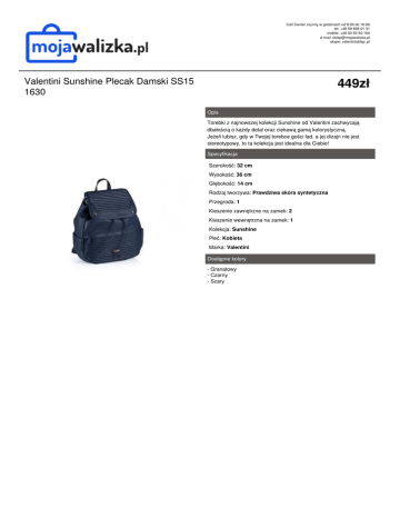 Call Center czynny w godzinach od 8:00 do 16:00 tel. +48 58 668 01 31 mobile: +48 50 50 50 164 e-mail: [email protected] skype: valentinisklep_pl 449zł Valentini Sunshine Plecak Damski SS15 1630 Opis Torebki z najnowszej kolekcji Sunshine od Valentini zachwycają dbałością o każdy detal oraz ciekawą gamą kolorystyczną. Jeżeli lubisz, gdy w Twojej torebce gości ład, a jej dizajn nie jest stereotypowy, to ta kolekcja jest idealna dla Ciebie! Specyfikacja Szerokość: 32 cm Wysokość: 36 cm Głębokość: 14 cm Rodzaj tworzywa: Prawdziwa skóra syntetyczna Przegroda: 1 Kieszenie zawnętrzne na zamek: 2 Kieszenie wewnętrzna na zamek: 1 Kolekcja: Sunshine Płeć: Kobieta Marka: Valentini Dostępne kolory - Granatowy - Czarny - Szary Powered by TCPDF (www.tcpdf.org)