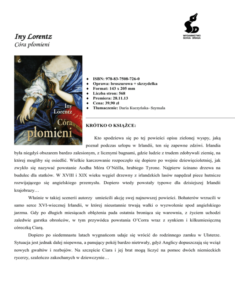 Iny Lorentz Córa płomieni ISBN: 978-83-7508-726-0 Oprawa: broszurowa + skrzydełka Format: 143 x 205 mm Liczba stron: 568 Premiera: 28.11.13 Cena: 39,90 zł Tłumaczenie: Daria Kuczyńska- Szymala KRÓTKO O KSIĄŻCE: Kto spodziewa się po tej powieści opisu zielonej wyspy, jaką poznał podczas urlopu w Irlandii, ten się zapewne zdziwi. Irlandia była niegdyś obszarem bardzo zalesionym, z licznymi bagnami, gdzie ludzie z trudem zdobywali ziemię, na której mogliby się osiedlić. Wielkie karczowanie rozpoczęło się dopiero po wojnie dziewięcioletniej, jak zwykło się nazywać powstanie Aodha Móra O’Néilla, hrabiego Tyrone. Najpierw ścinano drzewa na budulec dla statków. W XVIII i XIX wieku węgiel drzewny z irlandzkich lasów napędzał piece hutnicze rozwijającego się angielskiego przemysłu. Dopiero wtedy powstały typowe dla dzisiejszej Irlandii krajobrazy… Właśnie w takiej scenerii autorzy umieścili akcję swej najnowszej powieści. Bohaterów wrzucili w samo serce XVI-wiecznej Irlandii, w której nieustannie trwają walki o wyzwolenie spod angielskiego jarzma. Gdy po długich miesiącach oblężenia pada ostatnia broniąca się warownia, z życiem uchodzi zaledwie garstka obrońców, w tym przywódca powstania O’Corra wraz z synkiem i kilkumiesięczną córeczką Ciarą. Dopiero po siedemnastu latach wygnańcom udaje się wrócić do rodzinnego zamku w Ulsterze. Sytuacja jest jednak dalej niepewna, a panujący pokój bardzo nietrwały, gdyż Anglicy dopuszczają się wciąż nowych gwałtów i rozbojów. Na szczęście Ciara i jej brat mogą liczyć na pomoc dwóch niemieckich rycerzy, szaleńczo zakochanych w dziewczynie… O AUTORACH: Iny Lorentz to pseudonim pary autorskiej Iny Lorentz i Elmara Marona. Już ich pierwsza książka Die Kastratin stała się w krótkim czasie bestsellerem. Natomiast prawdziwą sławę przyniosła Iny Lorentz Nierządnica, zajmująca od momentu ukazania czołowe miejsca na listach bestsellerów w Niemczech. Książka doczekała się niedawno ekranizacji, zdobywając nagrodę filmową DIVA. Każdy z odcinków „Nierządnicy” obejrzało w Niemczech niemal 11 milionów widzów. Równie spektakularny sukces odniosły następne tomy: Kasztelanka, Testament nierządnicy oraz Córka nierządnicy, a ich śladem poszły kolejne powieści: Płomienna narzeczona, Córka tatarskiego chana, Uciekinierka, Handlarka złotem, Córy grzechu oraz Róża Asturii. RECENZJE: „To doskonała książka dla wielbicieli powieści historycznych. Idealna na długie jesienne i zimowe wieczory”. Radio Arabella „Świetny materiał na hollywoodzką produkcję”. Denglers-buchkritik.de „Romantyczne bohaterki, dzielni rycerze, fascynująca epoka – wszystkie znamiona bestsellera”. Petra-Buch Special „Pełna napięcia i dramatu, wzruszająca powieść historyczna”. Bücherstadt Kurier „Tej książki nie sposób odłożyć, nie doczytawszy do końca”. Tina „Niezwykle obrazowy, soczysty język świetnie charakteryzujący irlandzkich rebeliantów i ich dusze”. Donaukurier „Powieść, która budzi głód czytania i tęsknotę za dawnymi czasami”. HitRadio RT 1 Sonia Draga Sp. z o.o., Pl. Grunwaldzki 8–10, 40-127 Katowice, Tel.: 327826477, 7826037, Fax: 032/ 2537728 Dział handlowy: Danuta Czarnowska, 693420384, [email protected] Promocja: Agnieszka Jedlińska, 695672067, [email protected] Redakcja: Katarzyna Procner-Chlebowska, 693520384, [email protected]