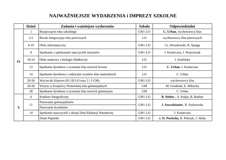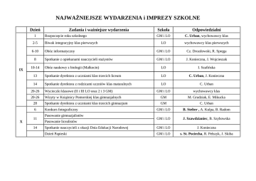 NAJWAŻNIEJSZE WYDARZENIA i IMPREZY SZKOLNE Dzień 1 X Rozpoczęcie roku szkolnego Szkoła Odpowiedzialni GM i LO C. Urban, wychowawcy klas LO wychowawcy klas pierwszych 2-5 Biwak integracyjny klas pierwszych 6-10 Obóz informatyczny GM i LO Cz. Drozdowski, R. Spręga Spotkanie z opiekunami nauczycieli stażystów GM i LO J. Konieczna, J. Wojcieszak Obóz naukowy z biologii (Małkocin) LO I. Szafińska 13 Spotkanie dyrektora z uczniami klas trzecich liceum LO C. Urban, J. Konieczna 14 Spotkanie dyrektora z rodzicami uczniów klas maturalnych LO C. Urban GM i LO wychowawcy klas 8 IX Zadania i ważniejsze wydarzenia 10-14 20-26 Wycieczki klasowe (II i III LO oraz 2 i 3 GM) 20-26 Wizyty w Książnicy Pomorskiej klas gimnazjalnych GM M. Grudziak, E. Mikucka 28 Spotkanie dyrektora z uczniami klas trzecich gimnazjum GM C. Urban 6 Konkurs fotograficzny GM i LO B. Stelter , A. Kulpa, B. Radom GM i LO J. Szawdzianiec, B. Szybowska Spotkanie nauczycieli z okazji Dnia Edukacji Narodowej GM i LO J. Konieczna Dzień Papieski GM i LO s. St. Pociecha, R. Pełszyk, J. Skiba 11 14 Pasowanie gimnazjalistów Pasowanie licealistów Helloween, Andrzejki GM i LO A. Styś Obóz astronomiczny GM i LO T. Skowron Konkurs „Prawa człowieka w filmie” LO J. Konieczna 21, 22 Wystawa historyczna „Sierpień, grudzień” Szachowe Mistrzostwa Szczecina Egzamin DSD C1 Obrona prac olimpijskich z języka polskiego Wycieczka „Berlin zimą” Konkurs piosenki angielskiej Kiermasz ozdób świątecznych Spotkania wigilijne klas LO LO LO GM i LO GM i LO GM i LO GM i LO M. Kopeć, A. Lindner M.Gofroń, M. Gruca B. Stelter, A. Kulpa J. Wojcieszak, A. Sosnowska J. Leśnik, J. Kłopotowska J. Skowroński R. Pełszyk, J. Skiba, M. Żerko samorządy klasowe, wychowawcy klas 22 godz. 17.00 Szkolne spotkanie wigilijne GM i LO J. Konieczna, J. Szawdzianiec Studniówka Debaty młodzieżowe „Jugend debattiert” (I etap) Ogólnopolskie Seminarium Astronomiczne LO LO LO wychowawcy klas trzecich B. Stelter, A. Kulpa T. Skowron XI XII I II III Finał III Konkursu Historycznego dla SP SP J. Szawdzianiec Finał II Konkursu Języka Angielskiego dla SP SP J. Skowroński Finał X Konkursu Humanistycznego dla SP SP J. Wojcieszak Finał XI Konkursu Matematycznego dla SP SP B. Bogdańska Sprawdzian uzdolnień matematycznych dla kandydatów do klas I GM 16 SP A. Maczan, Ł. Maczan Sprawdzian dla kandydatów do klas ogólnych GM 16 SP A. Łuszczek, E. Łukasiewicz Rekrutacja elektroniczna do GM 16 GM Cz. Drozdowski Konkurs „Poliglota” GM J. Kłopotowska Deutschquiz – Turniej wiedzy o krajach niemieckojęzycznych GM i LO J. Klimowicz, D.Polkowski, J.Kłopotowska 30.03-01.04 Rekolekcje wielkopostne GM i LO s. St. Pociecha, ks. M. Gajowiecki Egzamin DSD I GM B. Radom. A. Kulpa 11 IV 12 13 14 do 30 V od 4 17 17 17,18 20 VI 20 21 godz.17.00 22 24-25 VII 22-29 VIII VII Mistrzostwa SPG w Pływaniu o Puchar Dyrektora XIII LO Debaty młodzieżowe „Jugend debattiert” (II etap) Egzamin Gimnazjalny część humanistyczna Egzamin Gimnazjalny część matematyczno – przyrodnicza Egzamin Gimnazjalny z języka obcego Finał III Małej Olimpiady Wiedzy o Polsce i Świecie Współczesnym Spotkanie dyrektora z uczniami klas trzecich Pożegnanie trzecich LO LO GM GM GM GM GM LO Przygotowanie sal do egzaminu maturalnego LO Wycieczka szkolna do Londynu Wymiana młodzieży – wyjazd do Hamburga Egzaminy maturalne Konkurs Przyrodniczy GM 16 i ZSO nr 2 Spektakl Szkolnego Koła Teatralnego Dzień Sportu Bal klas trzecich Drukowanie świadectw Dzień Sportu Aukcja prac plastycznych International Day LO LO LO GM GM i LO GM GM GM i LO LO GM i LO 2 GM D. Czekała, M. Gruca, M. Gofroń B. Stelter, A. Kulpa J. Konieczna, W. Jasińska J. Konieczna, W. Jasińska J. Konieczna, W. Jasińska J. Konieczna, J. Szawdzianiec C. Urban B. Stelter A. Lindner J. Wojcieszak B. Bogdańska, R Fabiańska-Grzybowska A. Styś, A. Boniecka B.Stelter, A.Kulpa J. Konieczna I. Szafińska, M. Kępińska-Żerko W. Świtała D.Czekała wychowawcy klas III GM wychowawcy klas, informatycy J. Krzepota R. Fabiańska-Grzybowska J. Gościmińska, A. Kotula GM wychowawcy klas II GM GM i LO GM i LO LO GM i LO GM GM i LO GM i LO C. Urban, wychowawcy C. Urban R. Spręga J. Konieczna J. Konieczna nauczyciele J. Konieczna GM i LO C. Urban Pożegnanie klas 3trzecich Zakończenie roku szkolnego Rada pedagogiczna Rekrutacja elektroniczna do XIII LO Szkolne obozy letnie Obóz integracyjny klas pierwszych Konferencje metodyczne Egzaminy poprawkowe 29 30 Rada pedagogiczna (wtorek)