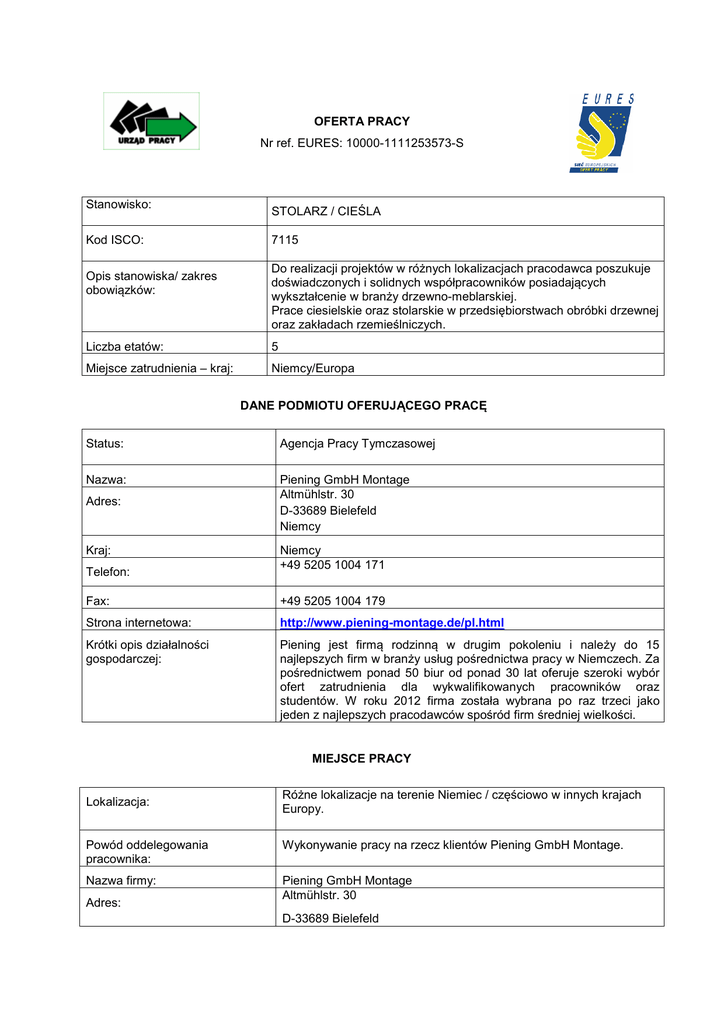 OFERTA PRACY Nr ref. EURES: 10000-1111253573-S Stanowisko: Kod ISCO: Opis stanowiska/ zakres obowiązków: STOLARZ / CIEŚLA 7115 Do realizacji projektów w różnych lokalizacjach pracodawca poszukuje doświadczonych i solidnych współpracowników posiadających wykształcenie w branży drzewno-meblarskiej. Prace ciesielskie oraz stolarskie w przedsiębiorstwach obróbki drzewnej oraz zakładach rzemieślniczych. Liczba etatów: 5 Miejsce zatrudnienia – kraj: Niemcy/Europa DANE PODMIOTU OFERUJĄCEGO PRACĘ Status: Agencja Pracy Tymczasowej Nazwa: Piening GmbH Montage Altmühlstr. 30 D-33689 Bielefeld Niemcy Adres: Kraj: Telefon: Niemcy +49 5205 1004 171 Fax: +49 5205 1004 179 Strona internetowa: http://www.piening-montage.de/pl.html Krótki opis działalności gospodarczej: Piening jest firmą rodzinną w drugim pokoleniu i należy do 15 najlepszych firm w branży usług pośrednictwa pracy w Niemczech. Za pośrednictwem ponad 50 biur od ponad 30 lat oferuje szeroki wybór ofert zatrudnienia dla wykwalifikowanych pracowników oraz studentów. W roku 2012 firma została wybrana po raz trzeci jako jeden z najlepszych pracodawców spośród firm średniej wielkości. MIEJSCE PRACY Lokalizacja: Różne lokalizacje na terenie Niemiec / częściowo w innych krajach Europy. Powód oddelegowania pracownika: Wykonywanie pracy na rzecz klientów Piening GmbH Montage. Nazwa firmy: Piening GmbH Montage Altmühlstr. 30 Adres: D-33689 Bielefeld Kraj: Niemcy WYMAGANIA Wymagane wykształcenie kierunkowe. Mile widziane. Kandydaci z wcześniejszym doświadczeniem w pracy na tym stanowisku nie mogą mieć przerwy w wykonywaniu zawodu dłuższej niż 5 lat. Znajomość języków: Język Poziom 1. język niemiecki 1. B1 (dobry) Uprawnienia/ dyplomy/ dokumenty Wymagane dokumenty potwierdzające kwalifikacje zawodowe: świadectwa (np. prawo jazdy): pracy, dyplom ukończenia szkoły. Prawo jazdy kat. B oraz referencje od poprzednich pracodawców – mile widziane. Inne istotne wymagania: Gotowość do podróży służbowych na terenie Niemiec i terenie Europy oraz nauki języka niemieckiego. Kandydaci, którzy nie znają języka niemieckiego, ale spełniają inne Dodatkowe informacje: wymagania – mogą również wziąć udział w procesie rekrutacji. Pracodawca ma możliwość zaoferowania wybranym przez siebie kandydatom kurs nauki języka niemieckiego, który odbędzie się na terenie Polski. WYNAGRODZENIE I WARUNKI ZATRUDNIENIA Wysokość pensji brutto: 10,61 € na godzinę brutto Zgodne z taryfikatorami iGZ / DGB (Izba branżowa zrzeszająca agencje pracy tymczasowej w Niemczech / Niemieckie Zrzeszenie Związków Zawodowych) stosownie do posiadanych kwalifikacji. Waluta, w jakiej wypłacana jest pensja: Euro. Rodzaj stawki wynagrodzenia: godzinowa Premie: Możliwe premie, 25% za pracę w nadgodzinach, 25% za pracę w nocy, 50% za pracę w niedziele, 100% za pracę w święta. Dodatkowe świadczenia: Pracodawca oferuje pomoc w znalezieniu zakwaterowania, załatwieniu formalności związanych z podjęciem pracy. Podczas odbywania podróży służbowych pracodawca oferuje zakwaterowanie w Niemczech lub zagranicą, przeloty lub wynajem samochodu. Ponadto pracodawca zabezpiecza bezpłatnie ubranie robocze oraz środki ochrony osobistej. Nazwa firmy, z którą zostanie podpisana Piening GmbH Montage umowa: Rodzaj umowy: Umowa o pracę. Wymiar czasu pracy Pełny etat. (praca na pełen etat/ część etatu): Czas trwania umowy: Umowa na czas Data wygaśnięcia (nieokreślony/ określony) nieokreślony. umowy (w przypadku umowy na czas określony): Liczba godzin tygodniowo: Minimum 35 godzin tygodniowo, przeciętnie 40 - 50 godzin tygodniowo, możliwa praca w soboty. Zmiany i praca w dni wolne: Według zapotrzebowania: możliwa praca w dni wolne oraz na zmiany. Data rozpoczęcia: Tak szybko jak to będzie możliwe – do ustalenia z pracodawcą. SPOSÓB SKŁADANIA WNIOSKU CV + skan dokumentów potwierdzających posiadane kwalifikacje Wymagane dokumenty (list motywacyjny, CV itp.): (świadectwa pracy, dyplom ukończenia szkoły, inne dokumenty potwierdzające kwalifikacje). niemiecki lub polski Język, w którym muszą być sporządzone przedkładane dokumenty: Do kogo należy wysłać dokumenty: do doradcy EURES z WUP w Katowicach (do pracodawcy/ doradcy EURES) Gdzie należy wysłać dokumenty: Na adres e-mail: [email protected] (adres, adres e-mail, nr faksu z kodem kraju podając w tytule wiadomości nazwę stanowiska oraz kraju. itp.) Dane teleadresowe doradcy EURES lub Aleksandra Kopczyk – doradca EURES przedstawiciela pracodawcy: [email protected] (nazwisko, adres, telefon, fax, e-mail itp.) Małgorzata Gościniak – asystent EURES [email protected] tel. 32 757 33- 91 DODATKOWE INFORMACJE Wykształcenie: Doświadczenie zawodowe: Pracodawca przewiduje organizację rozmów kwalifikacyjnych, które prawdopodobnie odbędą się na początku kwietnia 2014 r. w Katowicach. Wybrani przez pracodawcę kandydaci zostaną poinformowani o dokładnym terminie i miejscu spotkania rekrutacyjnego. Pracodawca będzie także obecny podczas Transgranicznego Dnia Informacyjno – Rekrutacyjnego, który odbędzie się 11.04.2014 r. w Miejskim Domu Kultury przy ul. Parkowej 1 w Zgorzelcu (w godz. od 11:00 do 15:00). WAŻNOŚĆ Data publikacji: 26.03.2014 r. Termin przedkładania podań o pracę / Do odwołania zakończenia ważności oferty: Agencja Pracy Tymczasowej Piening GmbH Montage oświadczyła, że prowadzi działalność zgodnie z przepisami obowiązującymi w Niemczech. Uprzejmie informujemy, że skontaktujemy się wyłącznie z wybranymi kandydatami. UWAGA: 1. Umowa z zagranicznym pracodawcą zostanie zawarta zgodnie z prawem kraju zatrudnienia. Oznacza to, że wszystkie roszczenia odnośnie do warunków, które obejmuje umowa, można kierować wyłącznie do odpowiedniego sądu w kraju zatrudnienia. Publiczne służby zatrudnienia (EURES) nie mogą pośredniczyć ani 2. 3. reprezentować pracownika w sądzie kr
