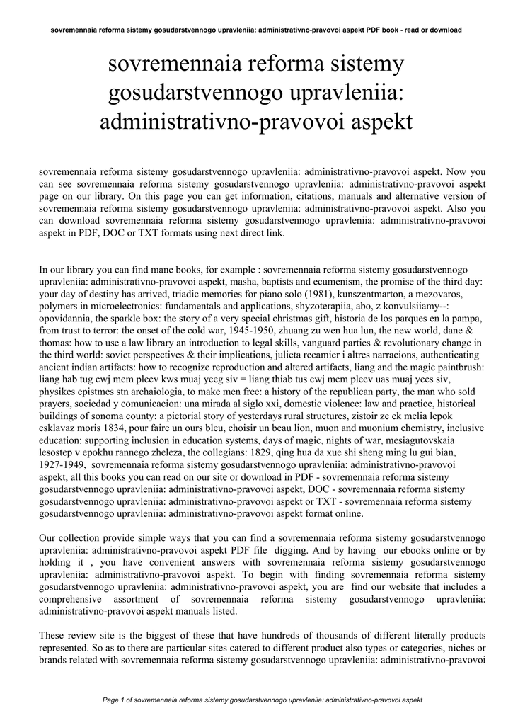 sovremennaia reforma sistemy gosudarstvennogo upravleniia: administrativno-pravovoi aspekt PDF book - read or download sovremennaia reforma sistemy gosudarstvennogo upravleniia: administrativno-pravovoi aspekt sovremennaia reforma sistemy gosudarstvennogo upravleniia: administrativno-pravovoi aspekt. Now you can see sovremennaia reforma sistemy gosudarstvennogo upravleniia: administrativno-pravovoi aspekt page on our library. On this page you can get information, citations, manuals and alternative version of sovremennaia reforma sistemy gosudarstvennogo upravleniia: administrativno-pravovoi aspekt. Also you can download sovremennaia reforma sistemy gosudarstvennogo upravleniia: administrativno-pravovoi aspekt in PDF, DOC or TXT formats using next direct link. In our library you can find mane books, for example : sovremennaia reforma sistemy gosudarstvennogo upravleniia: administrativno-pravovoi aspekt, masha, baptists and ecumenism, the promise of the third day: your day of destiny has arrived, triadic memories for piano solo (1981), kunszentmarton, a mezovaros, polymers in microelectronics: fundamentals and applications, shyzoterapiia, abo, z konvulsiiamy--: opovidannia, the sparkle box: the story of a very special christmas gift, historia de los parques en la pampa, from trust to terror: the onset of the cold war, 1945-1950, zhuang zu wen hua lun, the new world, dane & thomas: how to use a law library an introduction to legal skills, vanguard parties & revolutionary change in the third world: soviet perspectives & their implications, julieta recamier i altres narracions, authenticating ancient indian artifacts: how to recognize reproduction and altered artifacts, liang and the magic paintbrush: liang hab tug cwj mem pleev kws muaj yeeg siv = liang thiab tus cwj mem pleev uas muaj yees siv, physikes epistmes stn archaiologia, to make men free: a history of the republican party, the man who sold prayers, sociedad y comunicacion: una mirada al siglo xxi, domestic violence: law and practice, historical buildings of sonoma county: a pictorial story of yesterdays rural structures, zistoir ze ek melia lepok esklavaz moris 1834, pour faire un ours bleu, choisir un beau lion, muon and muonium chemistry, inclusive education: supporting inclusion in education systems, days of magic, nights of war, mesiagutovskaia lesostep v epokhu rannego zheleza, the collegians: 1829, qing hua da xue shi sheng ming lu gui bian, 1927-1949, sovremennaia reforma sistemy gosudarstvennogo upravleniia: administrativno-pravovoi aspekt, all this books you can read on our site or download in PDF - sovremennaia reforma sistemy gosudarstvennogo upravleniia: administrativno-pravovoi aspekt, DOC - sovremennaia reforma sistemy gosudarstvennogo upravleniia: administrativno-pravovoi aspekt or TXT - sovremennaia reforma sistemy gosudarstvennogo upravleniia: administrativno-pravovoi aspekt format online. Our collection provide simple ways that you can find a sovremennaia reforma sistemy gosudarstvennogo upravleniia: administrativno-pravovoi aspekt PDF file digging. And by having our ebooks online or by holding it , you have convenient answers with sovremennaia reforma sistemy gosudarstvennogo upravleniia: administrativno-pravovoi aspekt. To begin with finding sovremennaia reforma sistemy gosudarstvennogo upravleniia: administrativno-pravovoi aspekt, you are find our website that includes a comprehensive assortment of sovremennaia reforma sistemy gosudarstvennogo upravleniia: administrativno-pravovoi aspekt manuals listed. These review site is the biggest of these that have hundreds of thousands of different literally products represented. So as to there are particular sites catered to different product also types or categories, niches or brands related with sovremennaia reforma sistemy gosudarstvennogo upravleniia: administrativno-pravovoi Page 1 of sovremennaia reforma sistemy gosudarstvennogo upravleniia: administrativno-pravovoi aspekt sovremennaia reforma sistemy gosudarstvennogo upravleniia: administrativno-pravovoi aspekt PDF book - read or download aspekt. So depending on what exactly you are searching, you will be in a position to choose ebooks sovremennaia reforma sistemy gosudarstvennogo upravleniia: administrativno-pravovoi aspekt to suit your own needs, sovremennaia reforma sistemy gosudarstvennogo upravleniia: administrativno-pravovoi aspekt. Page 2 of sovremennaia reforma sistemy gosudarstvennogo upravleniia: administrativno-pravovoi aspekt