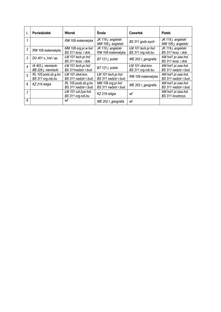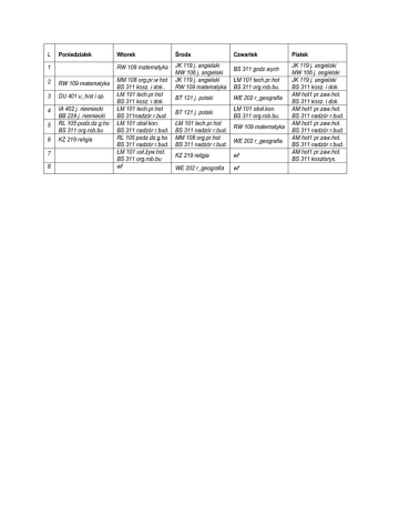 L Poniedziałek 1 2 RW 109 matematyka 3 DU 401 u_hist i sp. 4 IA 402 j. niemiecki BB 229 j. niemiecki RL 105 podz.dz.g.ho BS 311 org.rob.bu KZ 219 religia 5 6 7 8 Wtorek Środa RW 109 matematyka JK 119 j. angielski MW 106 j. angielski JK 119 j. angielski RW 109 matematyka MM 108 org.pr.w hot BS 311 kosz. i dok.. ŁM 101 tech.pr.hot BS 311 kosz. i dok. ŁM 101 tech.pr.hot BS 311nadzór r.bud. ŁM 101 obsł.kon. BS 311 nadzór r.bud. RL 105 podz.dz.g.ho BS 311 nadzór r.bud. ŁM 101 usł.żyw.hot. BS 311 org.rob.bu wf Czwartek BS 311 godz.wych ŁM 101 tech.pr.hot BS 311 org.rob.bu. BT 121 j. polski WE 202 r_geografia BT 121 j. polski ŁM 101 obsł.kon. BS 311 org.rob.bu. ŁM 101 tech.pr.hot RW 109 matematyka BS 311 nadzór r.bud. MM 108 org.pr.hot WE 202 r_geografia BS 311 nadzór r.bud. KZ 219 religia wf WE 202 r_geografia wf Piatek JK 119 j. angielski MW 106 j. angielski JK 119 j. angielski BS 311 kosz. i dok. AM hot1 pr.zaw.hot. BS 311 kosz. i dok. AM hot1 pr.zaw.hot. BS 311 nadzór r.bud. AM hot1 pr.zaw.hot. BS 311 nadzór r.bud. AM hot1 pr.zaw.hot. BS 311 nadzór r.bud. AM hot1 pr.zaw.hot. BS 311 kosztorys.