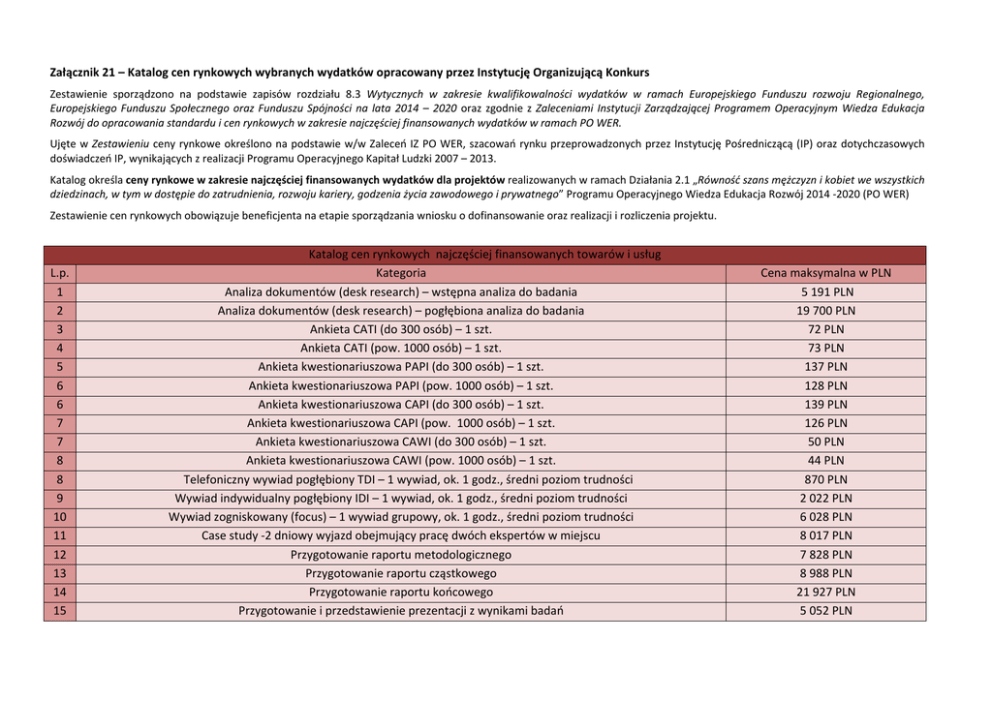 Załącznik 21 – Katalog cen rynkowych wybranych wydatków opracowany przez Instytucję Organizującą Konkurs Zestawienie sporządzono na podstawie zapisów rozdziału 8.3 Wytycznych w zakresie kwalifikowalności wydatków w ramach Europejskiego Funduszu rozwoju Regionalnego, Europejskiego Funduszu Społecznego oraz Funduszu Spójności na lata 2014 – 2020 oraz zgodnie z Zaleceniami Instytucji Zarządzającej Programem Operacyjnym Wiedza Edukacja Rozwój do opracowania standardu i cen rynkowych w zakresie najczęściej finansowanych wydatków w ramach PO WER. Ujęte w Zestawieniu ceny rynkowe określono na podstawie w/w Zaleceń IZ PO WER, szacowań rynku przeprowadzonych przez Instytucję Pośredniczącą (IP) oraz dotychczasowych doświadczeń IP, wynikających z realizacji Programu Operacyjnego Kapitał Ludzki 2007 – 2013. Katalog określa ceny rynkowe w zakresie najczęściej finansowanych wydatków dla projektów realizowanych w ramach Działania 2.1 „Równość szans mężczyzn i kobiet we wszystkich dziedzinach, w tym w dostępie do zatrudnienia, rozwoju kariery, godzenia życia zawodowego i prywatnego” Programu Operacyjnego Wiedza Edukacja Rozwój 2014 ‐2020 (PO WER) Zestawienie cen rynkowych obowiązuje beneficjenta na etapie sporządzania wniosku o dofinansowanie oraz realizacji i rozliczenia projektu. L.p. 1 2 3 4 5 6 6 7 7 8 8 9 10 11 12 13 14 15 Katalog cen rynkowych najczęściej finansowanych towarów i usług Kategoria Analiza dokumentów (desk research) – wstępna analiza do badania Analiza dokumentów (desk research) – pogłębiona analiza do badania Ankieta CATI (do 300 osób) – 1 szt. Ankieta CATI (pow. 1000 osób) – 1 szt. Ankieta kwestionariuszowa PAPI (do 300 osób) – 1 szt. Ankieta kwestionariuszowa PAPI (pow. 1000 osób) – 1 szt. Ankieta kwestionariuszowa CAPI (do 300 osób) – 1 szt. Ankieta kwestionariuszowa CAPI (pow. 1000 osób) – 1 szt. Ankieta kwestionariuszowa CAWI (do 300 osób) – 1 szt. Ankieta kwestionariuszowa CAWI (pow. 1000 osób) – 1 szt. Telefoniczny wywiad pogłębiony TDI – 1 wywiad, ok. 1 godz., średni poziom trudności Wywiad indywidualny pogłębiony IDI – 1 wywiad, ok. 1 godz., średni poziom trudności Wywiad zogniskowany (focus) – 1 wywiad grupowy, ok. 1 godz., średni poziom trudności Case study ‐2 dniowy wyjazd obejmujący pracę dwóch ekspertów w miejscu Przygotowanie raportu metodologicznego Przygotowanie raportu cząstkowego Przygotowanie raportu końcowego Przygotowanie i przedstawienie prezentacji z wynikami badań Cena maksymalna w PLN 5 191 PLN 19 700 PLN 72 PLN 73 PLN 137 PLN 128 PLN 139 PLN 126 PLN 50 PLN 44 PLN 870 PLN 2 022 PLN 6 028 PLN 8 017 PLN 7 828 PLN 8 988 PLN 21 927 PLN 5 052 PLN