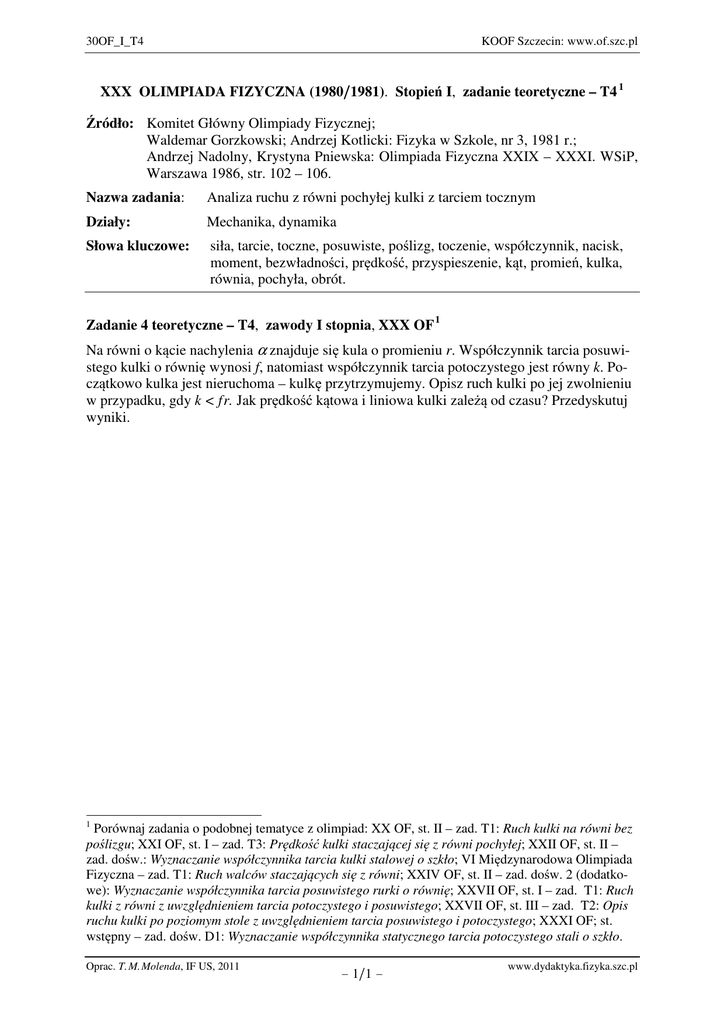 30OF_I_T4 KOOF Szczecin: www.of.szc.pl XXX OLIMPIADA FIZYCZNA (1980/1981). Stopień I, zadanie teoretyczne – T4 1 Źródło: Komitet Główny Olimpiady Fizycznej; Waldemar Gorzkowski; Andrzej Kotlicki: Fizyka w Szkole, nr 3, 1981 r.; Andrzej Nadolny, Krystyna Pniewska: Olimpiada Fizyczna XXIX – XXXI. WSiP, Warszawa 1986, str. 102 – 106. Nazwa zadania: Analiza ruchu z równi pochyłej kulki z tarciem tocznym Działy: Mechanika, dynamika Słowa kluczowe: siła, tarcie, toczne, posuwiste, poślizg, toczenie, współczynnik, nacisk, moment, bezwładności, prędkość, przyspieszenie, kąt, promień, kulka, równia, pochyła, obrót. Zadanie 4 teoretyczne – T4, zawody I stopnia, XXX OF 1 Na równi o kącie nachylenia α znajduje się kula o promieniu r. Współczynnik tarcia posuwistego kulki o równię wynosi f, natomiast współczynnik tarcia potoczystego jest równy k. Początkowo kulka jest nieruchoma – kulkę przytrzymujemy. Opisz ruch kulki po jej zwolnieniu w przypadku, gdy k < fr. Jak prędkość kątowa i liniowa kulki zależą od czasu? Przedyskutuj wyniki. 1 Porównaj zadania o podobnej tematyce z olimpiad: XX OF, st. II – zad. T1: Ruch kulki na równi bez poślizgu; XXI OF, st. I – zad. T3: Prędkość kulki staczającej się z równi pochyłej; XXII OF, st. II – zad. dośw.: Wyznaczanie współczynnika tarcia kulki stalowej o szkło; VI Międzynarodowa Olimpiada Fizyczna – zad. T1: Ruch walców staczających się z równi; XXIV OF, st. II – zad. dośw. 2 (dodatkowe): Wyznaczanie współczynnika tarcia posuwistego rurki o równię; XXVII OF, st. I – zad. T1: Ruch kulki z równi z uwzględnieniem tarcia potoczystego i posuwistego; XXVII OF, st. III – zad. T2: Opis ruchu kulki po poziomym stole z uwzględnieniem tarcia posuwistego i potoczystego; XXXI OF; st. wstępny – zad. dośw. D1: Wyznaczanie współczynnika statycznego tarcia potoczystego stali o szkło. Oprac. T. M. Molenda, IF US, 2011 - 1/1 - www.dydaktyka.fizyka.szc.pl