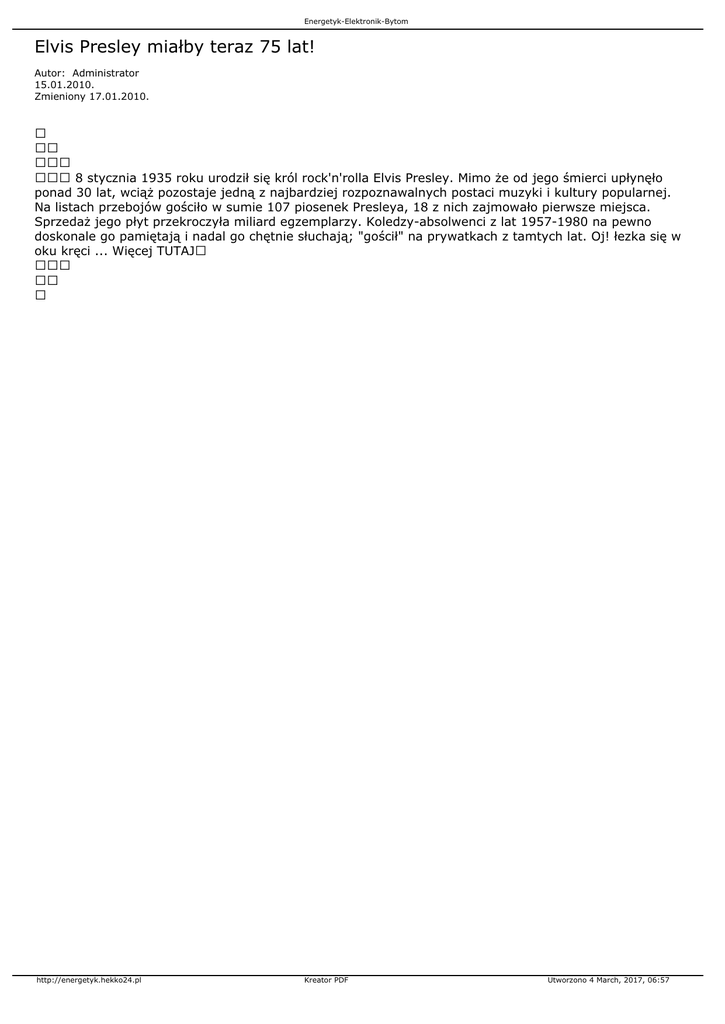 Energetyk-Elektronik-Bytom Elvis Presley miałby teraz 75 lat! Autor: Administrator 15.01.2010. Zmieniony 17.01.2010. 8 stycznia 1935 roku urodził się król rock'n'rolla Elvis Presley. Mimo że od jego śmierci upłynęło ponad 30 lat, wciąż pozostaje jedną z najbardziej rozpoznawalnych postaci muzyki i kultury popularnej. Na listach przebojów gościło w sumie 107 piosenek Presleya, 18 z nich zajmowało pierwsze miejsca. Sprzedaż jego płyt przekroczyła miliard egzemplarzy. Koledzy-absolwenci z lat 1957-1980 na pewno doskonale go pamiętają i nadal go chętnie słuchają; "gościł" na prywatkach z tamtych lat. Oj! łezka się w oku kręci ... Więcej TUTAJ http://energetyk.hekko24.pl Kreator PDF Utworzono 4 March, 2017, 06:57