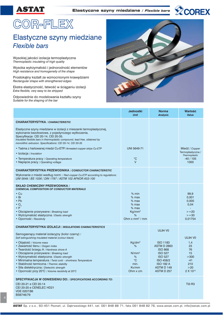 Elastyczne szyny miedziane / Flexible bars Elastyczne szyny miedziane Flexible bars Wysokiej jako!ci izolacja termoplastyczna Thermoplastic insulating of high quality Wysoka wytrzyma o!& i jednorodno!& elementów High resistance and homogeneity of the shape Prostok$tny kszta t ze wzmocnionymi kraw#dziami Rectangular shape with strengthened edges Ekstra elastyczno!&, atwo!& w !ci$ganiu izolacji Extra ßexible, very easy to be stripped Odpowiednie do modelowania kszta tu szyny Suitable for the shaping of the bar Jednostki Norma Warto ! Unit Analysis Value CHARAKTERYSTYKA / CHARACTERISTIC Elastyczne szyny miedziane w izolacji z mieszanki termoplastycznej, wykonanie bezo owiowe, z pojedynczego wyt oczenia. SpecyÞkacje: CEI 20-14, CEI 20-35. Insulated ßexible bars in thermoplastic compound, lead free, obtained by monolithic extrusion. SpeciÞcations: CEI 20-14, CEI 20-35 • Ta!ma z hartowanej miedzi Cu-ETP/ Annealed copper strips Cu-ETP UNI 5649-71 Mied" / Copper Termoplastyczna / • Izolacja / Insulation • Temperatura pracy / Operating temperature • Napi#cie pracy / Operating voltage Thermoplastic °C V -40 / 105 1000 % min % max % max % max % max Kg/mm2 % Ohm x mm2 / mm 99,9 0,001 0,005 0,04 >=20 >=30 0,01754 CHARAKTERYSTYKA PRZEWODNIKA / CONDUCTOR CHARACTERISTIC Wykonanie z miedzi wed ug norm: / Red copper Cu-ETP according to regulations: UNI 5649 / BS 1036 / DIN 1787 / ASTM 102 AFNOR A53-100 SK"AD CHEMICZNY PRZEWODNIKA / CHEMICAL COMPOSITION OF CONDUCTOR MATERIALS • Cu • Bi • Pb • O2 •P • Obci$%enie przerywane / Breaking load • Wytrzyma o!& elastyczna / Elastic strength • Oporno!& / Resistivity CHARAKTERYSTYKA IZOLACJI / INSULATIONS CHARACTERISTICS UL94 V0 Samogasn$cy materia izolacyjny (kolor czarny) / UL94 V0 Self extinguishing insulated material (colour black) • Obj#to!& / Volume mass • Zawarto!& tlenu / Oxigen index • Twardo!& brzegu A / Hardness shore A • Obci$%enie przerywane / Breaking load • Wytrzyma o!& elastyczna / Elastic strength • Minimalna temperatura / Twist cold – shortness Temperature • Stabilno!& termiczna / Thermic stability • Si a dielektryczna / Dielectric strength • Oporno!& przy 20°C / Volume resistivity at 20°C Kg/dm3 % N/mm2 % °C min. Kv/mm Ohm x cm ISO 1183 ASTM D 2863 ISO 868 ISO 527 ISO 527 ISO 458/2 ISO 182 A ASTM D 149 ASTM D 257 1,4 23 76 15 >300 -41 210 >20 2 X 1013 SPECYFIKACJA W ODNIESIENIU DO: / SPECIFICATIONS ACCORDING TO: CEI 20-21 e CEI 20-14 CEI 20-20 e CENELEC HD21 VDE 0207/86 BS6746/79 TI2-R3 4 ASTAT Sp. z o.o., 60-451 Pozna , ul. D!browskiego 441, tel. 061 848 88 71, faks 061 848 82 76, www.astat.com.pl, [email protected] Elastyczne szyny miedziane / Flexible bars Zakres pracy, pr$dy dopuszczalne / Przewodnik standardowy: paski miedziane g adkie / ocynowane / Standard conductor: E-copper strips bare / tinned Standardowa d ugo!&: 2 m / Standard length: 2 m Standard range, admissible currents Przekrój poprzeczny: 25 do 1440 mm2 / Cross section: 25 to 1440 sq. mm Kolor izolacji: czarny / Insulation colour: black Przekrój Wymiary / poprzeczny / Dimensions Cross section [mm] 9 9 [mm] (3) (4) Wymiary / Dimensions [mm] (5) 4 6 28,8 43,2 120 160 180 230 210 270 x 0,8 x 2 x 0,8 x 3 x 0,8 x 4 x 0,8 x 6 x 0,8 x 10 24,8 37,2 49,6 74,4 124 125 160 195 225 300 175 210 265 320 420 200 240 295 360 480 20 20 20 20 20 20 x1 x1 x1 x1 x1 x1 x x x x x x 2 3 4 5 6 10 40 60 80 100 120 200 170 230 270 300 330 420 240 320 380 430 470 580 270 360 440 490 530 650 24 24 24 24 24 24 24 x1 x1 x1 x1 x1 x1 x1 x x x x x x x 2 3 4 5 6 8 10 48 72 96 120 144 192 240 200 250 280 330 360 420 500 280 360 410 470 510 590 700 320 410 460 530 570 670 790 32 32 32 32 32 32 32 x x x x x x x 1 1 1 1 1 1 1 x 2 x 3 x 4 x 5 x 6 x 8 x 10 64 96 128 160 192 256 320 230 280 320 390 440 510 600 320 410 460 550 620 720 840 360 460 520 610 700 800 930 40 40 40 40 40 40 x x x x x x 1 1 1 1 1 1 x 3 x 4 x 5 x 6 x 8 x 10 120 160 200 240 320 400 330 400 450 480 600 670 480 560 630 680 830 920 540 630 710 750 920 1030 15,5 15,5 15,5 15,5 15,5 x 0,8 x x 0,8 x Obci !enie pr dowe / Current-load [A] t 50°C t 40°C t 20°C 1) Wymiary: Dimensions: 2) Obci$%enie pr$dowe: Current-load: 3) t 20°C: Przekrój poprzeczny / Cross section [mm] Obci !enie pr dowe / Current-load [A] t 50°C t 40°C t 20°C (3) (5) (4) 50 50 50 50 50 50 x x x x x x 1 1 1 1 1 1 x 3 x 4 x 5 x 6 x 8 x 10 150 200 250 300 400 500 400 490 540 590 680 750 570 700 780 840 1000 1100 650 790 880 950 1130 1300 63 63 63 63 63 63 x x x x x x 1 1 1 1 1 1 x 4 x 5 x 6 x 8 x 10 x 12 252 315 378 504 630 756 550 650 690 840 920 1050 780 900 980 1200 1300 1450 880 1000 1100 1350 1450 1600 80 80 80 80 80 80 x x x x x x 1 1 1 1 1 1 x 4 x 5 x 6 x 8 x 10 x 12 320 400 480 640 800 864 600 700 780 950 1090 1200 950 1100 1210 1400 1550 1680 1090 1230 1360 1570 1730 1880 100 100 100 100 100 100 x x x x x x 1 1 1 1 1 1 x 4 x 5 x 6 x 8 x 10 x 12 400 500 600 800 1000 1200 700 860 950 1100 1220 1300 1100 1250 1380 1580 1710 1800 1250 1400 1530 1760 1920 2010 120 120 120 120 120 120 x x x x x x 1 1 1 1 1 1 x 4 x 5 x 6 x 8 x 10 x 12 480 600 720 960 1200 1440 900 1000 1070 1250 1360 1500 1300 1450 1530 1760 1880 2030 1450 1600 1720 1950 2110 2200 miedziane paski, numer x wymiar, grubo!& 1,5-2 mm. Copper-strips, number x dimensions, thickness 1,5-2 mm. pr$dy dopuszczalne przy temperaturze otoczenia 20°C. Acceptable currents with an ambiental temperature of 20°C. pr$dy dopuszczalne przy wzro!cie temperatury o 20°C. Acceptable currents with 20°C temperature rise. 4) t 40°C: pr$dy dopuszczalne przy wzro!cie temperatury o 40°C. Acceptable currents with 40°C temperature rise. 5) t 50°C: pr$dy dopuszczalne przy wzro!cie temperatury o 50 ºC. Korzystaj$c z systemu wentylacji istnieje mo%liwo!& zwi#kszenia warto!ci pr$du dopuszczalnego o 20-25%. Acceptable currents with 50°C temperature rise. By using a ventilated system it is possible to raise the current-load by approximately 20-25%. Informacje dotycz$ce dopuszczalnych pr$d