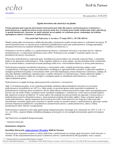 echo www.roedl.pl Rzeczpospolita z 24.06.2016 Zgoda inwestora nie musi być na piśmie Forma pisemna pod rygorem nieważności zastrzeżona jest tylko dla umowy zawieranej przez wykonawcę z podwykonawcą, a zgoda inwestora na jej zawarcie może być wyrażona przez każde zachowanie, które ujawnia ją w sposób dostateczny. Inwestor nie może uchylać się od zapłaty za wykonane prace, zasłaniając się brakiem egzemplarza umowy wykonawcy z podwykonawcą. Tak uznał Sąd Najwyższy w wyroku z 27 maja 2015 r., II CSK 483/14. Między gminą (jako inwestorem) a spółką akcyjną (jako wykonawcą) została zawarta umowa o wykonanie inwestycji. W umowie postanowiono, że zlecenie przez wykonawcę jakiejkolwiek części prac podwykonawcy wymaga uprzedniej akceptacji inwestora na zasadach określonych w kodeksie cywilnym (k.c.). Wykonawca zawarł ze spółką z o.o. (podwykonawcą) umowę o wykonanie inwestycji o tej samej nazwie i zakresie przedmiotowym, z wyłączeniem określonej części robót. Wykonawca nie wystąpił o wyrażenie zgody oraz nie przedstawił tej umowy inwestorowi. Pracownicy podwykonawcy rozpoczęli prace. Kombinezony pracowników nie zawierały oznaczeń firmy, w dzienniku budowy nie ujawniono podwykonawcy. Wójt, inspektor nadzoru ze strony gminy i jej inni przedstawiciele wielokrotnie byli na terenie budowy, rozmawiali na temat przebiegu robót m.in. z kierownikiem budowy ze strony podwykonawcy. Podwykonawca pismem zawiadomił wykonawcę o wstrzymaniu robót i zażądał niezwłocznej zapłaty części wynagrodzenia, wskazując na jego niewypłacalność wynikającą ze zgłoszenia kilku wniosków o ogłoszenie upadłości, a następnie poinformował gminę o wstrzymaniu robót z powodu niepokojącej sytuacji finansowej wykonawcy, żądając od niej, jako dłużnika solidarnego, zabezpieczenia i wypłaty należności za wykonane prace. Gmina odmówiła zapłaty i podniosła, że wykonawca nigdy nie wystąpił o wymaganą zgodę na zatrudnienie podwykonawcy, co wyłącza odpowiedzialność gminy. Podwykonawca wystąpił na drogę sądową przeciwko wykonawcy i inwestorowi. Sądy I i II instancji przyjęły, że nie zachodzą przesłanki solidarnej odpowiedzialności inwestora za roszczenia podwykonawcy na podstawie art. 6471 k.c. Sądy uznały, że pozwana gmina miała wprawdzie świadomość, że podwykonawca wykonuje prace na budowie, ale nie znała zakresu wykonywanych przez niego robót, przynajmniej przez pewien czas nie miała wiedzy o podstawowych warunkach współpracy z wykonawcą, a treść umowy poznała dopiero, gdy zakończył on prace na budowie. W ocenie sądów obu instancji inwestor powinien się zapoznać z treścią umowy z podwykonawcą przed wykonaniem umowy, zatem przed powstaniem obowiązku zapłaty. Samo wyrażenie zgody na osobę podwykonawcy, ogólna znajomość powierzonych mu robót i brak sprzeciwu nie mogą być traktowane jako dorozumiane wyrażenie zgody przez inwestora w sposób czynny na zawarcie umowy z podwykonawcą, gdyż jego wiedza powinna obejmować podmiotowe i przedmiotowe postanowienia umowy o podwykonawstwo, zakres i rodzaj przekazanych robót, należne wynagrodzenie. Podwykonawca zaskarżył wyrok sądu apelacyjnego skargą kasacyjną, zarzucając m.in. naruszenie art. 6471 § 2 zd. 1 w zw. z art. 60 k.c. poprzez błędną wykładnię polegającą na przyjęciu, że nie nastąpiła dorozumiana zgoda inwestującej gminy. Sąd Najwyższy uwzględnił skargę kasacyjną. —Karolina Sieraczek Komentarz eksperta Karolina Sieraczek, radca prawny Wrocław Rödl & Partner Zawarcie przez wykonawcę umowy o roboty budowlane z podwykonawcą wymaga zgody inwestora. Jeżeli inwestor, w terminie 14 dni od przedstawienia mu przez wykonawcę umowy z podwykonawcą lub jej projektu, wraz z częścią echo informuje Państwa o wizerunku Rödl & Partner w mediach. W Polsce osobą odpowiedzialną za echo jest Radosław Cichoń Rödl & Partner ul. Sienna 73, 00-833 Warszawa, tel. +48 22 696 28 00 E-mail: [email protected] dokumentacji dotyczącą wykonania robót określonych w umowie lub projekcie, nie zgłosi na piśmie sprzeciwu lub zastrzeżeń, uważa się, że wyraził zgodę na zawarcie umowy. Wyrażenie takiej zgody oznacza, iż inwestor i wykonawca ponoszą solidarną odpowiedzialność za zapłatę wynagrodzenia za roboty budowlane wykonane przez podwykonawcę. Następstwem zgody inwestora na zawarcie umowy między wykonawcą a podwykonawcą jest zatem powstanie po jego stronie ustawowej, solidarnej odpowiedzialności za cudzy dług (tj. dług wykonawcy). Odpowiedzialności tej nie można wolą stron wyłączyć. Odpowiedzialność ta nie obejmuje spełnienia świadczenia przez wykonawcę – inwestor nie jest współdłużnikiem w wykonaniu zobowiązania. Zgodnie z art. 6471 § 4 k.c. umowa wykonawcy z podwykonawcą powinna być zawarta w formie pisemnej pod rygorem nieważności. Wobec tego powstaje pytanie, czy również zgoda inwestora na zawarcie tej umowy wymaga formy pisemnej pod rygorem nieważności, jak stanowi bowiem art. 63 § 2 k.c., jeżeli do ważności czynności prawnej wymagana jest forma szczególna, oświadczenie obejmujące zgodę osoby trzeciej powinno być złożone w tej samej formie. W uchwale z 29 kwietnia 2008 r. (III CZP 6/08) podjętej w składzie 7 sędziów Sąd Najwyższy uznał, że do zgody inwestora nie stosuję się tej zasady, tzn. zgoda ta może być wyrażona przez każde zachowanie, które ujawnia ją w sposób dostateczny (art. 60 k.c.). Niezależnie od tego zgodę uważa się za wyrażoną w razie ziszczenia się przesłanek określonych w art. 6471 § 2 zdanie drugie k.c. tj. w przypadku zgody biernej wyrażającej się w braku pisemnego sprzeciwu inwestora w terminie 14 dni od przedstawienia mu umowy lub jej projektu. Wykładania ta została potwierdzona w wyrokach SN z 4 lutego 2011 r. (III CSK 152/10); z 24 stycznia 2014 r. (V CSK 124/13); z 16 kwietnia 2014 r. (V CSK 296/13). Warto prz