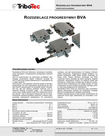 ROZDZIELACZ PROGRESYWNY BVA KARTA KATALOGOWA ROZDZIELACZ PROGRESYWNY BVA Charakterystyka wyrobu Rozdzielacz BVA jest blokowym, tłoczkowym rozdzielaczem dozującym o progresywnej (postępowej) zasadzie działania. Jest on przeznaczony do dozowania w układach centralnego smarowania olejów o lepkości powyżej 50 2 mm /s (cSt) oraz smarów plastycznych o konsystencji do 2. klasy wg NLGI. Samoczynnie, pod wpływem ciśnienia środka smarnego, podawanego na wlot rozdzielacza dystrybuuje ten środek smarny sekwencyjnie na wszystkie wyloty. Rozdzielacz ten, gdy jest zasilany środkiem smarnym pod ciśnieniem pracuje w sposób ciągły - po zakończeniu ruchu przez ostatni tłoczek swój ruch rozpoczyna pierwszy tłoczek i cykl smarowania rozpoczyna się od nowa. Przerwanie zasilania środkiem smarnym w trakcie cyklu, powoduje zatrzymanie rozdzielacza. Po wznowieniu zasilania, cykl jest kontynuowany od miejsca w którym został zatrzymany. Progresywna zasada działania, zapewnia podawanie stałej dawki środka smarnego na każdy wylot. Wpływ ciśnienia zwrotnego (na które w głównej mierze składają się opory płynięcia, długość przewodu, temperatura smaru) na wielkość dawki jest nieznaczny. Dzięki temu możliwe jest skuteczne monitorowanie pracy rozdzielacza oraz całego układu. W cyklu smarowania nie jest możliwe pominiecie żadnego punktu, który jest przyłączony do rozdzielacza. Rozdzielacz BVA może być stosowany jako rozdzielacz główny (pierwszego stopnia) lub rozdzielacz drugiego stopnia w progresywnym układzie smarowania. Podane powyżej typowe przeznaczenie rozdzielacza nie wyklucza innych jego zastosowań po konsultacji z dostawcą. Zastrzega się możliwość zmian Dane techniczne Liczba wylotów ..... nominalna (maksymalna) / minimalna BVA 3 ........................................................................6 / 1 BVA 4 ........................................................................8 / 1 BVA 5 ......................................................................10 / 2 BVA 6 ......................................................................12 / 2 Nominalna dawka środka smarnego 3 na wyjście, na cykl................................................0,2 cm Ciśnienie maksymalne......................................... 350 bar Ciśnienie robocze ................................................ 250 bar Maksymalna różnica ciśnień pomiędzy dwoma wylotami.................................. 100 bar 2 Środek smarny ....................olej powyżej 50 mm /s (cSt) lub.......................... smar plastyczny do 2. klasy wg NLGI Temperatura pracy ...................................- 25 do + 80 °C Port wlotowy ......................................................M10x1 (f) Porty wylotowe ..................................................M10x1 (f) Materiał korpusu.......................................... stal węglowa .....................powierzchnia zabezpieczona przed korozją Waga................................................. zależnie od modelu BVA 3 ................................................................... 0,75 kg BVA 4 ..................................................................... 1,0 kg BVA 5 ................................................................... 1,25 kg BVA 6 ..................................................................... 1,5 kg Elektroniczna sygnalizacja ruchu tłoczka (opcja) indukcyjny czujnik zbliżeniowy ...................... 24 VDC, 2A Wymiary ...........zależnie od modelu - podano na rysunku KK BVA v02 / 10-2006 str. 1 z 4 ROZDZIELACZ PROGRESYWNY BVA KARTA KATALOGOWA Informacje uzupełniające Wyposażenie dodatkowe (opcje): • elektroniczna sygnalizacja pracy rozdzielacza - zbliżeniowy czujnik ruchu tłoczka (dotyczy rozdzielaczy typu BVA _ PA i BVA _ PB) • wizualna sygnalizacja pracy rozdzielacza - trzpień wskaźnikowy (dotyczy rozdzielaczy typu BVA _ V) Mocowanie rozdzielacza Rozdzielacz może być zamontowany w dowolnej pozycji. Również miejsce montażu jest dowolne, należy jednak pamiętać, że wskazane jest pozostawienie dostępu do rozdzielacza w celu kontroli jego pracy oraz ewentualnej wymiany. Zaleca się przy tym, by przewody zasilające punkty smarowania były możliwie najkrótsze. Do mocowania rozdzielacza służą otwory montażowe wg rysunku. Kontrola pracy rozdzielacza Rozdzielacze progresywne nie wymagają kontroli pracy, jednak w celu zwiększenia pewności smarowania oraz jego pełniejszego monitorowania możliwe jest zastosowanie elementów kontroli pracy rozdzielacza. Rozdzielacze można monitorować: • wizualnie poprzez obserwację ruchu trzpienia wskaźnikowego będącego przedłużeniem jednego z tłoczków roboczych rozdzielacza, • elektronicznie poprzez czujnik zbliżeniowy, sygnalizujący ruch trzpienia wskaźnikowego, będącego przedłużeniem tłoczka roboczego. Uzbrojenie wylotów rozdzielaczy Rozdzielacz musi być odpowiednio uzbrojony, by mógł właściwie dozować środek smarny. Każdy wylot, z którego środek smarny będzie zasilał punkt smarowania musi być uzbrojony w łącznik wyjściowy - zawór zwrotny. Każdy wylot rozdzielacza, który nie będzie bezpośrednio zasilał punktu smarowania musi być zaślepiony lub uzbrojony w mostek do grupowania wylotów. Nie jest zalecane pozostawienie jakiegokolwiek wylotu bez wkręcenia weń zaworu zwrotnego, mostka do grupowania wylotów albo zaślepki. Może to spowodować niepoprawną pracę lub dozowanie rozdzielacza. Każda modyfikacja uzbrojenia może skutkować zmianą dawkowania środka smarnego na poszczególne wyloty. Grupowanie wylotów Na każdy wylot rozdzielacza BVA podawana jest stała porcja środka smarnego. Istnieją jednak dwa sposoby zwiększenia dawki środka smarnego podawanego do poszczególnych punktów smarowania w jednym cyklu pracy rozdzielacza. 1/ wewnętrzne połączenie dwóch wylotów poprzez zaślepienie jednego wylotu i skierowania podwójnej dawki środka smarnego 