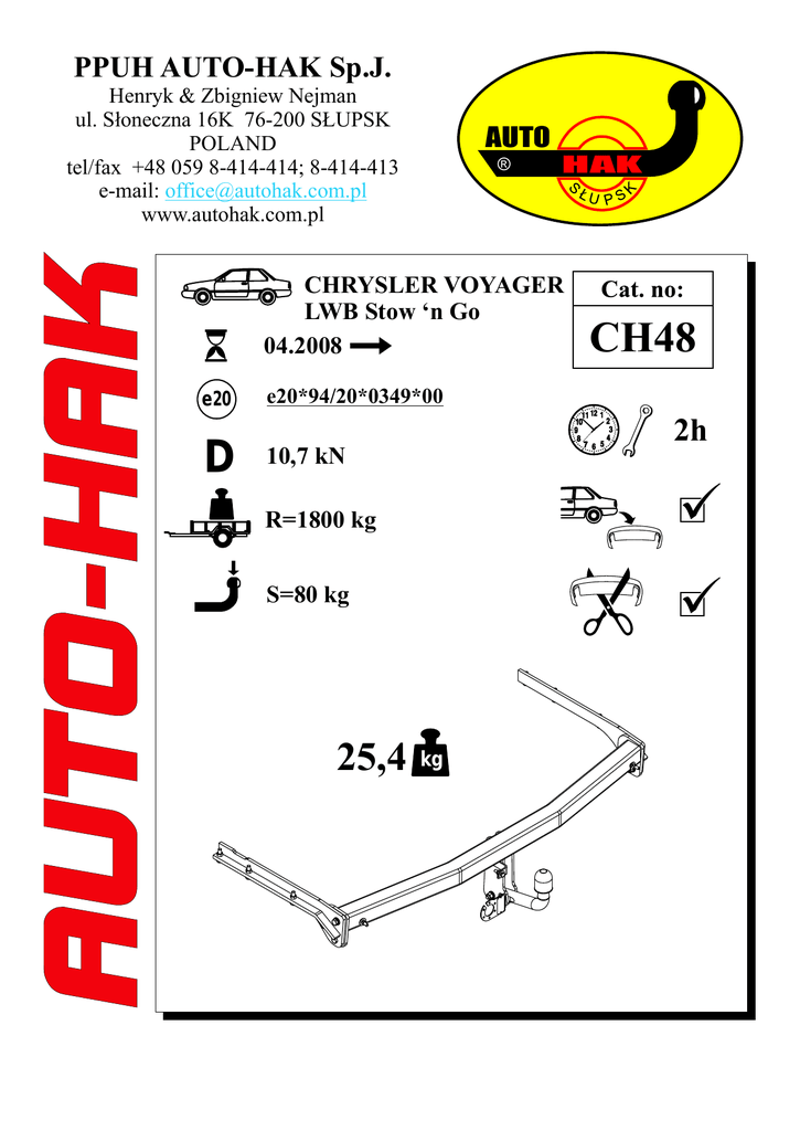 PPUH AUTO-HAK Sp.J. Henryk & Zbigniew Nejman ul. Słoneczna 16K 76-200 SŁUPSK POLAND tel/fax +48 059 8-414-414; 8-414-413 e-mail: [email protected] www.autohak.com.pl AUTO ® HAK CHRYSLER VOYAGER LWB Stow ‘n Go 04.2008 e 20 D CH48 e20*94/20*0349*00 2h 10,7 kN R=1800 kg S=80 kg 25,4 kg OD PRODUCENTA: PL Dziękujemy za wybór produkowanego przez naszą firmę zaczepu kulowego. Jego niezawodność została potwierdzona licznymi testami oraz opiniami zadowolonych klientów. Jednakże niezawodność zaczepów kulowych jest zależna również od prawidłowego montażu oraz prawidłowej eksploatacji. Z tego powodu prosimy Państwa o staranne przeczytanie niniejszej instrukcji montażu oraz przestrzeganie właściwych wskazówek. Zaczep należy zamontować w miejscach do tego celu przeznaczonych przez producenta samochodu. FROM MANUFACTURER: GB Thank you for buying our product. Their reliability has been confirmed in many tests. Reliability of towbar depends also on correct assembly and right operation. For this reasons we kindly ask to read carefully this instruction and apply to hints. The towbar should be install in points described by a car producer. VON DEM HERSTELLER: D Die Zuverlässigkeit der Anhängekupplung ist jedoch auch von der ordnungsgemäßen Montage und der richtigen Nutzung abhängig. Daher werden Sie gebeten, sorgfältig die folgende Montageanleitung zu lesen und sich an die entsprechenden Anweisungen zu halten. Die Anhängekupplung muss an den vom Fahrzeughersteller vorgeschriebenen Befestigungsstellen montiert werden. DE LA PART DU FABRICANT: F Merci d'avoir choisi le dispositif d'attelage à boule produit par notre société. Son fiabilité a été confirmée dans de nombreux tests et par les opinions des clients satisfaits. Toutefois, la fiabilité des dispositifs d'attelage à boule dépend aussi d'installation et d'exploitation correcte. Pour cette raison, nous vous demandons de lire attentivement cette instruction de montage et de respecter les conseils. Le dispositif d'attelage à boule doit être monté dans des emplacements prévus a ce but par le fabricant de voiture. FRA PRODUCENTEN: DK Tak fordi De har valgt vores anhængertræk. Dets pålidelighed er blevet bekræftet i mange undersøgelser samt af tilfredse kunder. Vores anhængertræks pålidelighed er også afhængig af korrekt montering og korrekt betjening. Af denne grund beder vi Dem at læse denne instruktion grundigt og overholde de korrekte anvisninger. DE PRODUCTOR: E Gracias por la elección del enganche de bola producido por nuestra empresa. Su fiabilidad fue confirmada por numerosos testos y opiniones de los clientes quienes estuvieron contentos. Sin embargo la fiabilidad de enganche de bola depende también de un montaje adecuado y su explotación adecuada. Por esa causa por favor leer atentamente la instrucción del montaje y observar adecuadas indicadoras. VAN DE FABRIKANT: NL Bedankt voor de aanschaf van onze kogeltrekhaak. Hoe betrouwbaar die is blijkt wel uit vele tests en meningen van tevreden klanten. Toch is de betrouwbaarheid van een kogeltrekhaak er mede van afhankelijk dat deze correct gemonteerd is en op de juiste manier wordt gebruikt. Daarom wordt u verzocht deze montagehandleiding zorgvuldig te lezen en de aanwijzingen te volgen. FRA PRODUSENTEN: N Takk for at dere har valgt kulefestet produsert av vårt firma. Driftssikkerheten på kulefestet har blitt bekreftet av flere tester og tilbakemeldinger fra fornøyde kunder. Allikevel er driftssikkerheten også avhengig av en korrekt montering og riktig bruk. Derfor ber vi dere om å lese denne monteringsinstruksen nøye og anbefaler at dere følger veiledningen. ETT BUDSKAP FRÅN TILLVERKAREN: S Vi skulle vilja tacka er för ert val och inköp. Våra dragkrokars pålitlighet har bevisats av olika tester samt referenser från nöjda kunder. Man får inte glömma att dragkrokars pålitlighet beror också på rätt installation och rätt bruk. Därför skulle vi vilja be att ni läser noga denna installationsanvisning och följer alla regler och tips som den anger. Dragkroken ska installeras i ett ställe som blivit påpekade av biltillverkaren. DAL FABBRICANTE: IT Vi ringraziamo per aver scelto il gancio di traino a sfera prodotto dalla nostra azienda. La sua affidabilità è stata confermata da numerosi test e dalle opinioni positive dei clienti. Tuttavia, il perfetto funzionamento dei ganci di traino a sfera dipende anche dalla correttezza del montaggio e dall'utilizzo appropriato. Per questo motivo, Vi preghiamo di leggere attentamente le presenti istruzioni di montaggio e di attenervi alle indicazioni in esse contenute. Il gancio di traino deve essere montato nei punti predisposti a tal fine dal fabbricante del veicolo. -2- PL GB D F Należy zagwarantować przestrzeń swobodną według załącznika VII, ilustracja 30 wytycznej 94/20/WE przy dopuszczalnym ciężarze całkowitym pojazdu. The clearance specified in appendix VII, diagram 30 of guideline 94/20/EC must be guaranteed at laden weight of the vehicle. Der Freiraum nach Anhang VII,Abbildung 30 der Richtlinie94/20/EG ist zu gewährleistenbei zulässigem Gesamtgewichtdes Fahrzeuges. L’ e s p a c e l i b r e d o i t ê t r e garanticonformément à l’annexe VII,illustration 30 de la directive94/20/CE pour poids total encharge autorisé du véhicule. A-A DK I overensstemmelse med bilag VII, figur 30 til retningslinie 94/20/EF for køretøjets tilladte totalvægt skal der garanteres en friplads. E Hay que garantizar un espacio suelto según archivo adjunto VII, ilustración 30 trazado 94/20/WE de peso admisible y total del vehículo. NL N Det skal sørges for fritt rom ifølge vedlegget VII, illustrasjon 30 retningslinjen 94/20/WE ved den tillatte totale vekten av fartøyet. S Man ska garantera ett fritt tillgängligt utrymme - se bilaga VII, diagram 30 enligt riktlinjer 94/20/WE vid ett fordons maximala belastning. IT B-B De in bijlage VII afbeelding 30 van richtlijn 94/20/EU g