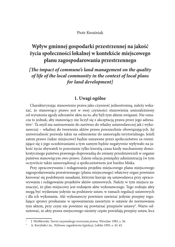 Piotr Kwaśniak Wpływ gminnej gospodarki przestrzennej na jakość życia społeczności lokalnej w kontekście miejscowego planu zagospodarowania przestrzennego [The impact of commune’s land management on the quality of life of the local community in the context of local plans for land development] 1. Uwagi ogólne Charakteryzując stanowienie prawa jako czynność jednostronną, należy wskazać, że stanowiący prawo jest w swej czynności stanowienia uniezależniony od wyrażenia zgody adresatów aktu na to, aby byli tym aktem związani. Nie oznacza to jednak, aby stanowiący nie liczył się z akceptacją prawa przez jego adresatów1. Ta myśl ma zastosowanie do zarówno do władzy ustawodawczej jak i wykonawczej – władnej do tworzenia aktów prawa powszechnie obowiązujących. Jej uniwersalność pozwala także na odniesienie do samorządu terytorialnego. Jeżeli zatem prawo (także miejscowe) będzie uznawane przez społeczeństwo za rozmijające się z jego oczekiwaniami a tym samym będzie negatywnie wpływało na jakość życia obywateli to pozostanie tylko kwestią czasu kiedy mechanizmy demokratycznego państwa prawnego doprowadzą do zmiany przedstawicieli w organie państwa stanowiącym owo prawo. Zatem relacja pomiędzy administracją (w tym oczywiście także samorządową) a społeczeństwem jest bardzo bliska. Przy opracowywaniu i redagowaniu projektu miejscowego planu miejscowego zagospodarowania przestrzennego (planu miejscowego) właściwy organ powinien kierować się podobnymi zasadami, którymi kieruje się ustawodawca przy opracowywaniu i redagowaniu projektów aktów ustawowych. Należy w tym miejscu zaznaczyć, że plan miejscowy jest rodzajem aktu wykonawczego. Tego rodzaju akty mogą być wydawane jedynie na podstawie ustaw, w ramach regulacji ustawowych i dla ich wykonania. Akt wykonawczy powinien zawierać jedynie przepisy regulujące sprawy przekazane w upoważnieniu zawartym w ustawie do normowania tym aktem, przy czym nie powinno się powtarzać przepisów ustawy2. Warto odnotować, że akty prawa miejscowego niestety często powielają przepisy ustaw, lecz 1 2 J. Wróblewski, Teoria racjonalnego tworzenia prawa, Wrocław 1985, s. 36. A. Korybski i in., Wybrane zagadnienia legislacji, Lublin 1993, s. 42-43. 70 Piotr Kwaśniak w przypadku planów miejscowych nie jest to raczej możliwe. Plany bowiem wykonują i konkretyzują przepisy ustawy. Nie ma w nich miejsca na powielanie treści w niej zawartych, gdyż mają dostosować do istniejących potrzeb (związanych z przeznaczeniem i zagospodarowaniem określonych terenów) wytyczne aktów wyższego rzędu. Plany miejscowe mają zatem, w pewnym sensie, autonomiczny wpływ na jakość życia społeczności lokalnej. Ich stosunkowa niezależność polega na tym, że to w ich treści przenoszone są na obszary gmin regulacje ustawy z dnia 27 marca 2003 r. o planowaniu i zagospodarowaniu przestrzennym (Dz. U. z 2003 r., Nr 80, poz. 717 ze zm.), w takim zakresie w jakim rady gmin uznają je za optymalne dla określonego terenu. Nie oznacza to jednak dowolności właściwych organów gmin w interpretacji i stosowaniu przepisów ustawowych ale raczej np.: opracowywanie planów miejscowych dla konkretnie wyznaczonych terenów (co uczyni bardziej przejrzystym nimi gospodarowanie) czy korzystanie z instytucji uznania administracyjnego. W odniesieniu do aktów prawa miejscowego Konstytucja nie wymaga, aby były one uchwalane w „celu wykonania ustawy”, nie wskazuje też konkretnego podmiotu upoważnionego do ich stanowienia ani formy prawnej tych aktów. Właściwą formą ich stanowienia jest uchwała3, a procedury prawotwórcze przedstawicielskich władz lokalnych wzorowane są na procedurze parlamentarnej, na ogół ze złagodzonymi regułami. Bardziej szczegółowe normy proceduralne wynikają z określonej hierarchii władz przedstawicielskich, a w ślad za tym określonej hierarchii aktów prawnych oraz charakteru struktury państwowej4. U podstaw regulacji dotyczących planowania i zagospodarowania przestrzennego, a w szczególności umocowania planu miejscowego w systemie aktów normatywnych, jako aktu prawa miejscowego, leży wola dostosowania planowania i zagospodarowania przestrzennego do wymogów gospodarki rynkowej i rozwiązań powszechnie przyjętych. Oznacza to konieczność respektowania zasady ochrony własności, równego traktowania różnych form własności, a przez to oddzielenia prawa własności od prawa zabudowy i poddania tego drugiego znacznym ograniczeniom w ramach obowiązujących ustaw. Taka konstrukcja gminnej gospodarki przestrzennej podyktowana jest dążeniem do zapewnienia możliwie najwyższej jakości życia społeczności lokalnej. Władze lokalne mają w tym względzie bardzo trudne zadanie, ponieważ muszą pogodzić różne interesy obywateli, które bardzo często krzyżują się z interesem publicznym. Tak więc dążenie do realizacji interesu publicznego przez organy lokalnej administracji samorządowej związane jest z próbą godzenia sprzecznych ze sobą racji wielu uczestników procesu zagospodarowania przestrzennego. 3 4 E. Gdulewicz, Konstytucyjny system źródeł prawa, [w:] Polskie prawo konstytucyjne, (red.) W. Skrzydło, Lublin 2004, s. 181-182. R. Tokarczyk, Współczesne kultury prawne, Kraków 2000, s. 135. Wpływ gminnej gospodarki przestrzennej na jakość życia... 71 Uwzględniając odmienność innych regulacji, ustawa z dnia 27 marca 2003 r. o planowaniu i zagospodarowaniu przestrzennym nie koliduje z regulacjami prawodawstwa unijnego. W tym miejscu należy podkreślić, że poszczególne kraje mają różne rozwiązania szczegółowe5. Jednakże podstawową funkcję w planowaniu i zagospodarowaniu przestrzennym w ramach Unii Europejskiej pełnią gminy. Ich udział sprowadza się głównie do najważniejszej – lokalnej aktywności w tej materii, a kompetencja znajduje najważniejszą, bo konstytucyjną ochronę6. Podobnie w Polsce ustalenie 