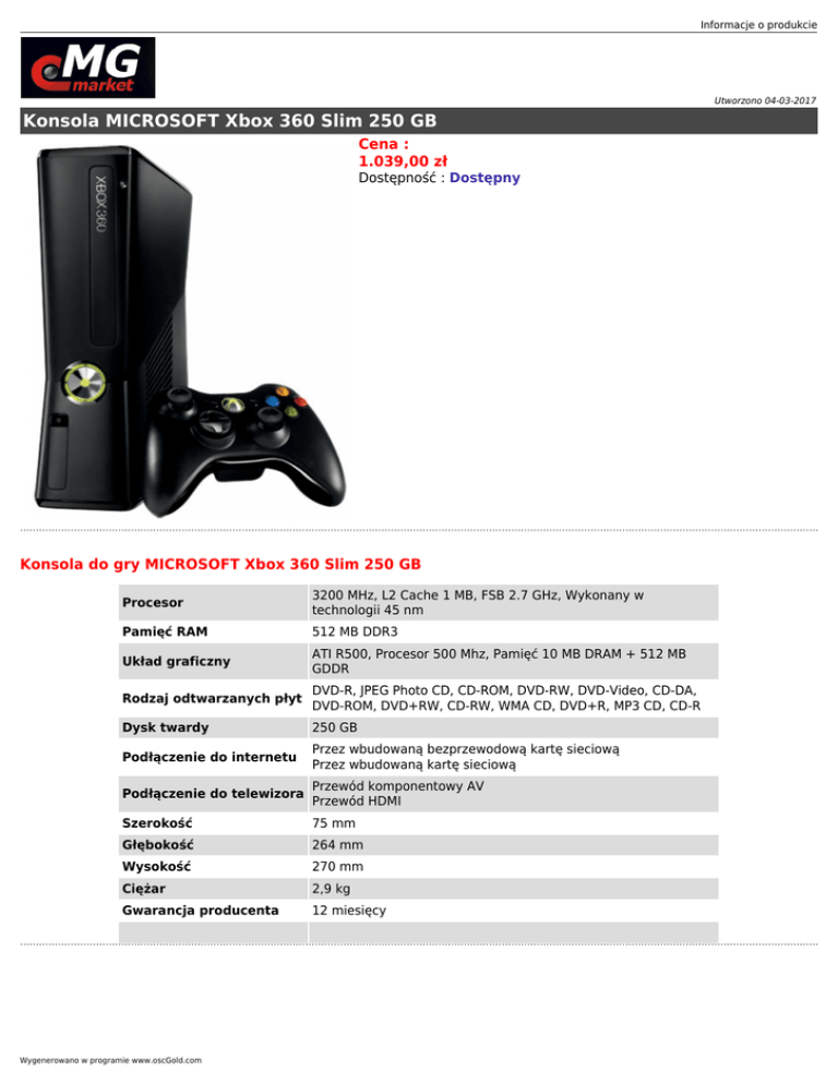 Informacje o produkcie Utworzono 04-03-2017 Konsola MICROSOFT Xbox 360 Slim 250 GB Cena : 1.039,00 zł Dostępność : Dostępny Konsola do gry MICROSOFT Xbox 360 Slim 250 GB Procesor 3200 MHz, L2 Cache 1 MB, FSB 2.7 GHz, Wykonany w technologii 45 nm Pamięć RAM 512 MB DDR3 Układ graficzny ATI R500, Procesor 500 Mhz, Pamięć 10 MB DRAM + 512 MB GDDR Rodzaj odtwarzanych płyt DVD-R, JPEG Photo CD, CD-ROM, DVD-RW, DVD-Video, CD-DA, DVD-ROM, DVD+RW, CD-RW, WMA CD, DVD+R, MP3 CD, CD-R Dysk twardy 250 GB Podłączenie do internetu Przez wbudowaną bezprzewodową kartę sieciową Przez wbudowaną kartę sieciową Podłączenie do telewizora Przewód komponentowy AV Przewód HDMI Szerokość 75 mm Głębokość 264 mm Wysokość 270 mm Ciężar 2,9 kg Gwarancja producenta 12 miesięcy Wygenerowano w programie www.oscGold.com