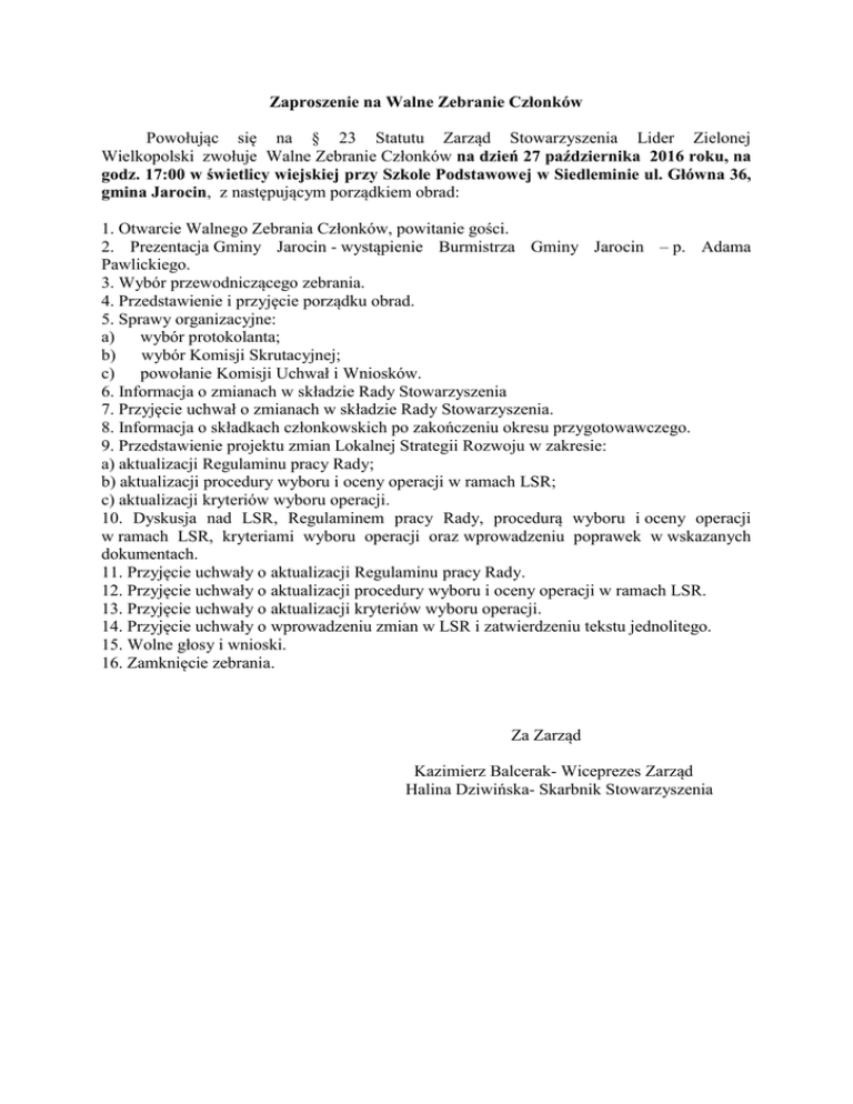 Zaproszenie na Walne Zebranie Członków Powołując się na § 23 Statutu Zarząd Stowarzyszenia Lider Zielonej Wielkopolski zwołuje Walne Zebranie Członków na dzień 27 października 2016 roku, na godz. 17:00 w świetlicy wiejskiej przy Szkole Podstawowej w Siedleminie ul. Główna 36, gmina Jarocin, z następującym porządkiem obrad: 1. Otwarcie Walnego Zebrania Członków, powitanie gości. 2. Prezentacja Gminy Jarocin - wystąpienie Burmistrza Gminy Jarocin – p. Adama Pawlickiego. 3. Wybór przewodniczącego zebrania. 4. Przedstawienie i przyjęcie porządku obrad. 5. Sprawy organizacyjne: a) wybór protokolanta; b) wybór Komisji Skrutacyjnej; c) powołanie Komisji Uchwał i Wniosków. 6. Informacja o zmianach w składzie Rady Stowarzyszenia 7. Przyjęcie uchwał o zmianach w składzie Rady Stowarzyszenia. 8. Informacja o składkach członkowskich po zakończeniu okresu przygotowawczego. 9. Przedstawienie projektu zmian Lokalnej Strategii Rozwoju w zakresie: a) aktualizacji Regulaminu pracy Rady; b) aktualizacji procedury wyboru i oceny operacji w ramach LSR; c) aktualizacji kryteriów wyboru operacji. 10. Dyskusja nad LSR, Regulaminem pracy Rady, procedurą wyboru i oceny operacji w ramach LSR, kryteriami wyboru operacji oraz wprowadzeniu poprawek w wskazanych dokumentach. 11. Przyjęcie uchwały o aktualizacji Regulaminu pracy Rady. 12. Przyjęcie uchwały o aktualizacji procedury wyboru i oceny operacji w ramach LSR. 13. Przyjęcie uchwały o aktualizacji kryteriów wyboru operacji. 14. Przyjęcie uchwały o wprowadzeniu zmian w LSR i zatwierdzeniu tekstu jednolitego. 15. Wolne głosy i wnioski. 16. Zamknięcie zebrania. Za Zarząd Kazimierz Balcerak- Wiceprezes Zarząd Halina Dziwińska- Skarbnik Stowarzyszenia