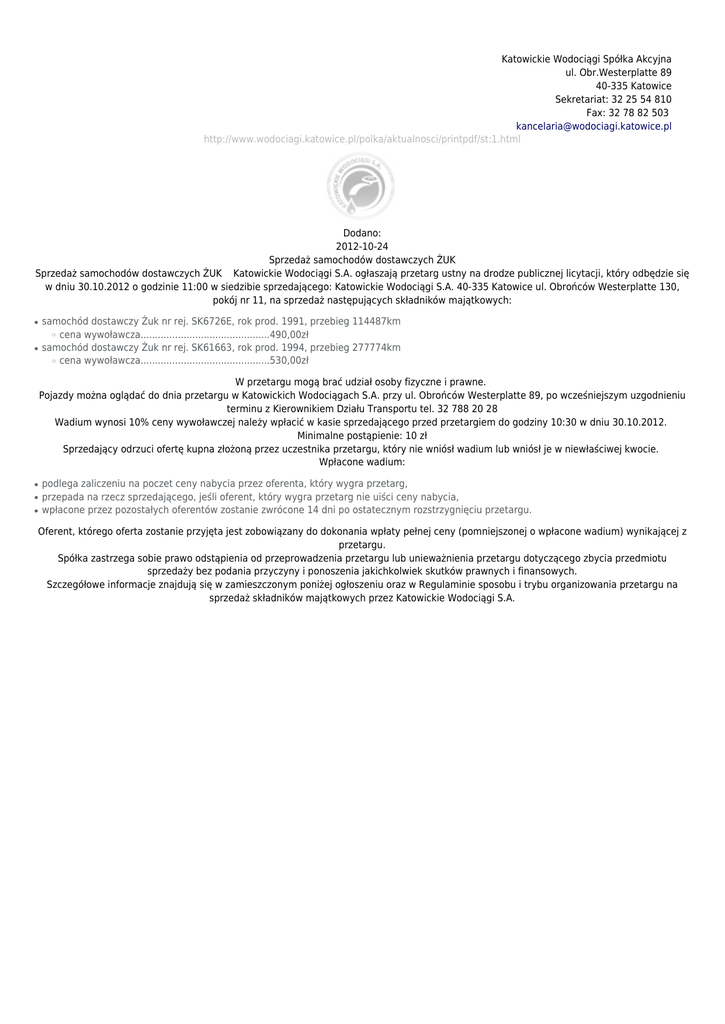 Katowickie Wodociągi Spółka Akcyjna ul. Obr.Westerplatte 89 40-335 Katowice Sekretariat: 32 25 54 810 Fax: 32 78 82 503 [email protected] http://www.wodociagi.katowice.pl/polka/aktualnosci/printpdf/st:1.html Dodano: 2012-10-24 Sprzedaż samochodów dostawczych ŻUK Sprzedaż samochodów dostawczych ŻUK Katowickie Wodociągi S.A. ogłaszają przetarg ustny na drodze publicznej licytacji, który odbędzie się w dniu 30.10.2012 o godzinie 11:00 w siedzibie sprzedającego: Katowickie Wodociągi S.A. 40-335 Katowice ul. Obrońców Westerplatte 130, pokój nr 11, na sprzedaż następujących składników majątkowych: ● samochód dostawczy Żuk nr rej. SK6726E, rok prod. 1991, przebieg 114487km cena wywoławcza.............................................490,00zł samochód dostawczy Żuk nr rej. SK61663, rok prod. 1994, przebieg 277774km cena wywoławcza.............................................530,00zł ❍ ● ❍ W przetargu mogą brać udział osoby fizyczne i prawne. Pojazdy można oglądać do dnia przetargu w Katowickich Wodociągach S.A. przy ul. Obrońców Westerplatte 89, po wcześniejszym uzgodnieniu terminu z Kierownikiem Działu Transportu tel. 32 788 20 28 Wadium wynosi 10% ceny wywoławczej należy wpłacić w kasie sprzedającego przed przetargiem do godziny 10:30 w dniu 30.10.2012. Minimalne postąpienie: 10 zł Sprzedający odrzuci ofertę kupna złożoną przez uczestnika przetargu, który nie wniósł wadium lub wniósł je w niewłaściwej kwocie. Wpłacone wadium: ● ● ● podlega zaliczeniu na poczet ceny nabycia przez oferenta, który wygra przetarg, przepada na rzecz sprzedającego, jeśli oferent, który wygra przetarg nie uiści ceny nabycia, wpłacone przez pozostałych oferentów zostanie zwrócone 14 dni po ostatecznym rozstrzygnięciu przetargu. Oferent, którego oferta zostanie przyjęta jest zobowiązany do dokonania wpłaty pełnej ceny (pomniejszonej o wpłacone wadium) wynikającej z przetargu. Spółka zastrzega sobie prawo odstąpienia od przeprowadzenia przetargu lub unieważnienia przetargu dotyczącego zbycia przedmiotu sprzedaży bez podania przyczyny i ponoszenia jakichkolwiek skutków prawnych i finansowych. Szczegółowe informacje znajdują się w zamieszczonym poniżej ogłoszeniu oraz w Regulaminie sposobu i trybu organizowania przetargu na sprzedaż składników majątkowych przez Katowickie Wodociągi S.A.
