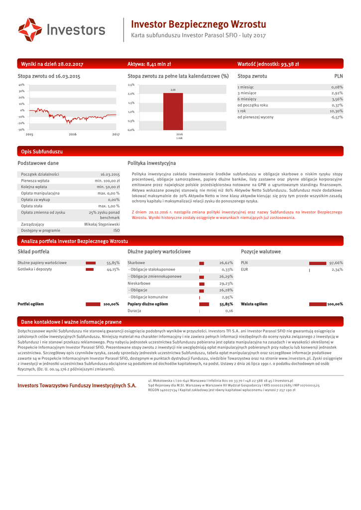 Investor Bezpiecznego Wzrostu Karta subfunduszu Investor Parasol SFIO - luty 2017 Wyniki na dzień 28.02.2017 Stopa zwrotu od 16.03.2015 Aktywa: 8,41 mln zł Wartość jednostki: 93,38 zł Stopa zwrotu za pełne lata kalendarzowe (%) Stopa zwrotu 1 miesiąc 3 miesiące 6 miesięcy od początku roku 1 rok od pierwszej wyceny PLN 0,08% 2,92% 3,56% 0,37% 10,30% -6,57% Opis Subfunduszu Podstawowe dane Początek działalności Polityka inwestycyjna min. 100,00 zł Kolejna wpłata min. 50,00 zł Opłata manipulacyjna max. 0,00 % Opłata za wykup Opłata stała Opłata zmienna od zysku Zarządzający Dostępny w programie Polityka inwestycyjna zakłada inwestowanie środków subfunduszu w obligacje skarbowe o niskim ryzyku stopy procentowej, obligacje samorządowe, papiery dłużne banków, listy zastawne oraz płynne obligacje korporacyjne emitowane przez największe polskie przedsiębiorstwa notowane na GPW o ugruntowanym standingu finansowym. Aktywa wskazane powyżej stanowią nie mniej niż 80% Aktywów Netto Subfunduszu. Subfundusz może dodatkowo lokować maksymalnie do 20% Aktywów Netto w inne klasy aktywów kierując się przy tym przede wszystkim zasadą ochrony kapitału i maksymalizacji relacji zysku do ponoszonego ryzyka. 16.03.2015 Pierwsza wpłata 0,00% max. 1,00 % Z dniem 20.12.2016 r. nastąpiła zmiana polityki inwestycyjnej oraz nazwy Subfunduszu na Investor Bezpiecznego Wzrostu. Wyniki historyczne zostały osiągnięte w warunkach niemających już zastosowania. 25% zysku ponad benchmark Mikołaj Stępniewski ISO Analiza portfela Investor Bezpiecznego Wzrostu Skład portfela Dłużne papiery wartościowe Dłużne papiery wartościowe 55,85% Skarbowe Gotówka i depozyty 44,15% - Obligacje stałokuponowe - Obligacje zmiennokuponowe Portfel ogółem 100,00% Pozycje walutowe 26,62% PLN 97,66% 0,33% EUR 2,34% 26,29% Nieskarbowe 29,23% - Obligacje 26,28% - Obligacje komunalne 2,95% Papiery dłużne ogółem 55,85% Duracja Waluta ogółem 100,00% 0,16 Dane kontaktowe i ważne informacje prawne Dotychczasowe wyniki Subfunduszu nie stanowią gwarancji osiągnięcia podobnych wyników w przyszłości. Investors TFI S.A. ani Investor Parasol SFIO nie gwarantują osiągnięcia założonych celów inwestycyjnych Subfunduszu. Niniejszy materiał ma charakter informacyjny i nie zawiera pełnych informacji niezbędnych do oceny ryzyka związanego z inwestycją w Subfundusz i nie stanowi przekazu reklamowego. Przy nabyciu jednostek uczestnictwa Subfunduszu pobierana jest opłata manipulacyjna na zasadach i w wysokości określonej w Prospekcie Informacyjnym Investor Parasol SFIO. Prezentowane stopy zwrotu z inwestycji nie uwzględniają opłat manipulacyjnych pobieranych przy nabyciu lub konwersji jednostek uczestnictwa. Szczegółowy opis czynników ryzyka, zasady sprzedaży jednostek uczestnictwa Subfunduszu, tabela opłat manipulacyjnych oraz szczegółowe informacje podatkowe zawarte są w Prospekcie Informacyjnym Investor Parasol SFIO, dostępnym w punktach dystrybucji Funduszu, siedzibie Towarzystwa oraz na stronie www.investors.pl. Zyski osiągnięte z inwestycji w jednostki uczestnictwa Subfunduszu obciążone są podatkiem od dochodów kapitałowych, na podst. Ustawy z dnia 26 lipca 1991 r. o podatku dochodowym od osób fizycznych, (Dz. U. 00.14.176 z późniejszymi zmianami). Investors Towarzystwo Funduszy Inwestycyjnych S.A. ul. Mokotowska 1 I 00-640 Warszawa I Infolinia 801 00 33 70 I +48 22 588 18 45 I investors.pl Sąd Rejonowy dla M.St. Warszawy w Warszawie XII Wydział Gospodarczy I KRS 0000227685 I NIP 1070001525 REGON 140027134 I Kapitał zakładowy jest równy kapitałowi wpłaconemu i wynosi 7 257 190 zł