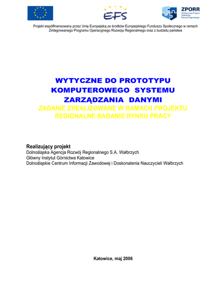 Projekt współfinansowany przez Unię Europejską ze środków Europejskiego Funduszu Społecznego w ramach Zintegrowanego Programu Operacyjnego Rozwoju Regionalnego oraz z budżetu państwa WYTYCZNE DO PROTOTYPU KOMPUTEROWEGO SYSTEMU ZARZĄDZANIA DANYMI ZADANIE ZREALIZOWANE W RAMACH PROJEKTU REGIONALNE BADANIE RYNKU PRACY Realizujący projekt Dolnośląska Agencja Rozwój Regionalnego S.A. Wałbrzych Główny Instytut Górnictwa Katowice Dolnośląskie Centrum Informacji Zawodowej i Doskonalenia Nauczycieli Wałbrzych Katowice, maj 2006 Projekt współfinansowany przez Unię Europejską ze środków Europejskiego Funduszu Społecznego w ramach Zintegrowanego Programu Operacyjnego Rozwoju Regionalnego oraz z budżetu państwa Spis treści: 1. Uwagi wprowadzające........................................................................................................ 4 2. Główne cele budowy i aplikacji komputerowego systemu zarządzania danymi .............. 5 2.1. Zakres przedmiotowy pracy ...................................................................................... 5 2.2. Przestrzenny zakres pracy ......................................................................................... 6 2.3. Czasowy zakres pracy............................................................................................... 6 2.4. Problemowy zakres pracy ......................................................................................... 6 3. Założenia funkcjonalne w układzie wielowariantowych i szczegółowych charakterystyk komputerowego systemu zarządzania danymi ....................................... 8 4. Parametry pracy komputerowego systemu zarządzania danymi (KSZD) ......................11 5. Struktura aplikacyjna komputerowego systemu zarządzania danymi w układzie danych źródłowych wtórnych i pierwotnych...................................................................14 6. Powiązanie poszczególnych elementów komputerowego systemu zarządzania danymi w logiczną całość w układzie użytkownik – beneficjent.....................................17 6.1. Uwagi wprowadzające .............................................................................................17 6.2. Struktura baz danych................................................................................................17 6.3. Ustalenie parametrów pracy komputerowego systemy zarządzania danymi..............18 6.4. Bank danych o odpadach stałych........................... Błąd! Nie zdefiniowano zakładki. 7. Moduły i algorytmy odzwierciedlające przyjęte metody i techniki realizacji zadań stawianych przed komputerowym systemem zarządzania danymi ................................19 7.1. Uwagi wprowadzające .............................................................................................19 7.2. Klasyfikacja algorytmów .........................................................................................20 7.3. Błędy w implementacji ............................................................................................21 7.4. Ograniczenia algorytmów ........................................................................................22 7.5. Wymagania systemowe............................................................................................18 7.6. Zasady współpracy w układzie aplikacja – użytkownik ............................................25 8. Metody i techniki służące do rozwiązywania postawionych przed aplikacją komputerowego systemu zarządzania danymi celów poznawczych i aplikacyjnych .....26 8.1. Uwagi wprowadzające .............................................................................................26 8.2. Miary średnie...........................................................................................................27 8.3. Miary średnie pozycyjne ..........................................................................................28 8.4. Miary rozproszenia ..................................................................................................28 8.5. Miary asymetrii........................................................................................................29 8.6. Miary koncentracji ...................................................................................................30 9. Współzależność zjawisk.....................................................................................................31 9.1. Uwagi wprowadzające .............................................................................................31 9.2. Test niezależności chi-kwadrat.................................................................................31 9.3. Współczynnik kontyngencji C Pearsona...................................................................32 9.4. Uwagi podsumowujące ............................................................................................32 10. Struktura aplikacji komputerowego systemu zarządzania danymi w układzie danych źródłowych wtórnych i pierwotnych – słowniki podstawowych pojęć używanych w systemie......................................................................................................36 10.1. Uwagi wprowadzające .............................................................................................36 10.2. Słowniki podstawowych pojęć .................................................................................37 10.3. Słownik nr 2 – klasyfikacja zawodów i specjalności – KZiS ....................................39 Projekt: „Regionalne badanie rynku pracy”. Realizujący: Dolnośląska Agencja Rozwój Regionalnego S.A. Wałbrzych, Główny Instytut Górnictwa Katowice, Dolnośląskie Centrum Informacji Zawodowej i Doskonalenia Nauczycieli Wałbrzych 2- Projekt współfinansowany przez Unię Europejską ze środków Europejskiego Funduszu Społecznego w ramach Zintegrowanego Programu Operacyjne