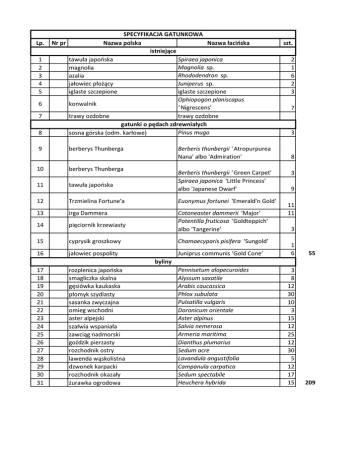 Lp. 1 2 3 4 5 6 7 8 9 SPECYFIKACJA GATUNKOWA Nr pr Nazwa polska Nazwa łacińska istniejące Spiraea japonica tawuła japońska Magnolia sp. magnolia Rhododendron sp. azalia Juniperus sp. jałowiec płożący iglaste szczepione iglaste szczepione Ophiopogon planiscapus konwalnik ' Nigrescens' trawy ozdobne trawy ozdobne gatunki o pędach zdrewniałych Pinus mugo sosna górska (odm. karłowe) Berberis thunbergii ' Atropurpurea Nana' albo 'Admiration' berberys Thunberga 10 berberys Thunberga 11 tawuła japońska 12 Trzmielina Fortune'a Euonymus fortunei 'Emerald'n Gold' 13 irga Dammera 14 pięciornik krzewiasty Cotoneaster dammerii 'Major' Potentilla fruticosa 'Goldteppich' albo 'Tangerine' 15 cyprysik groszkowy Chamaecyparis pisifera ‘Sungold’ 16 jałowiec pospolity Juniprus communis ‘Gold Cone’ 17 18 19 20 21 22 23 24 25 26 27 28 29 30 31 rozplenica japońska smagliczka skalna gęsiówka kaukaska płomyk szydlasty sasanka zwyczajna omieg wschodni aster alpejski szałwia wspaniała zawciąg nadmorski goździk pierzasty rozchodnik ostry lawenda wąskolistna dzwonek karpacki rozchodnik okazały żurawka ogrodowa Berberis thunbergii ' Green Carpet' Spiraea japonica 'Little Princess' albo 'Japanese Dwarf' szt. 2 1 6 2 3 7 3 8 3 9 11 11 3 1 6 55 3 8 12 30 10 3 15 12 25 12 30 5 12 17 15 209 byliny Pennisetum alopecuroides Alyssum saxatile Arabis caucassica Phlox subulata Pulsatilla vulgaris Doronicum orientale Aster alpinus Salvia nemerosa Armeria maritima Dianthus plumarius Sedum acre Lavandula angustifolia Campanula carpatica Sedum spectabile Heuchera hybrida