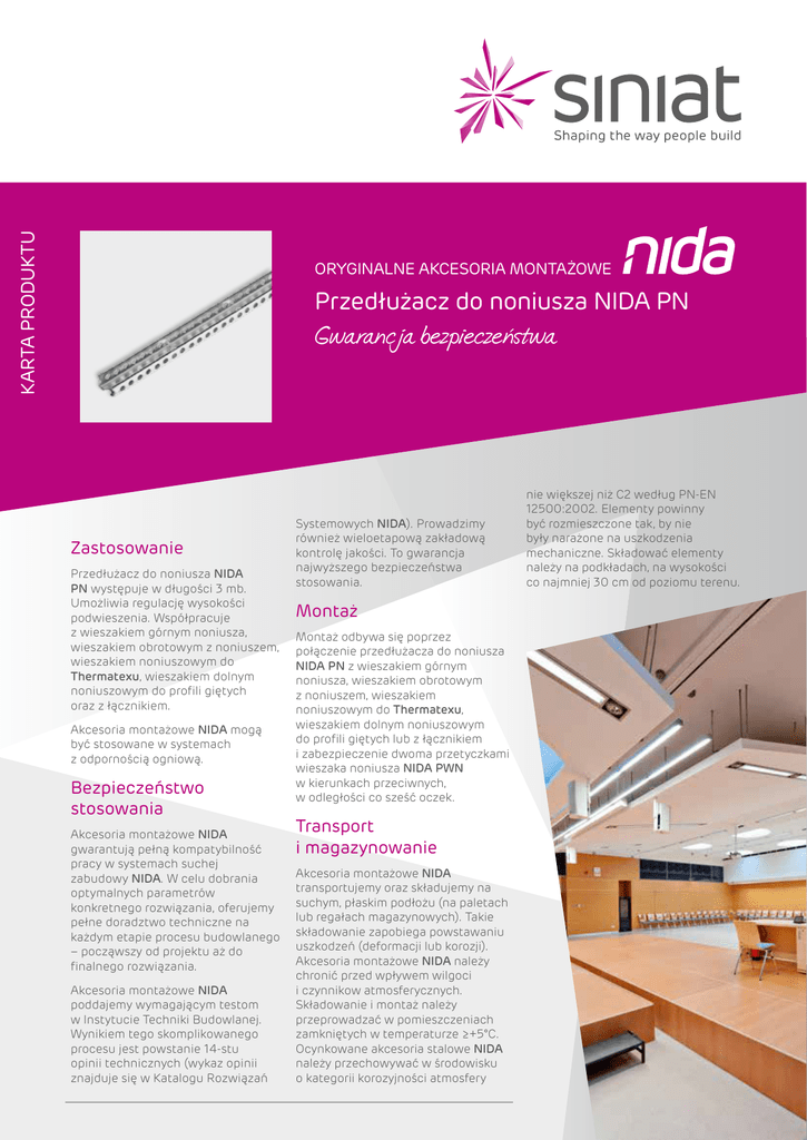 KARTA PRODUKTU ORYGINALNE AKCESORIA MONTAŻOWE Przedłużacz do noniusza NIDA PN Gwarancja bezpieczenstwa Zastosowanie Przedłużacz do noniusza NIDA PN występuje w długości 3 mb. Umożliwia regulację wysokości podwieszenia. Współpracuje z wieszakiem górnym noniusza, wieszakiem obrotowym z noniuszem, wieszakiem noniuszowym do Thermatexu, wieszakiem dolnym noniuszowym do profili giętych oraz z łącznikiem. Akcesoria montażowe NIDA mogą być stosowane w systemach z odpornością ogniową. Bezpieczeństwo stosowania Akcesoria montażowe NIDA gwarantują pełną kompatybilność pracy w systemach suchej zabudowy NIDA. W celu dobrania optymalnych parametrów konkretnego rozwiązania, oferujemy pełne doradztwo techniczne na każdym etapie procesu budowlanego – począwszy od projektu aż do finalnego rozwiązania. Akcesoria montażowe NIDA poddajemy wymagającym testom w Instytucie Techniki Budowlanej. Wynikiem tego skomplikowanego procesu jest powstanie 14-stu opinii technicznych (wykaz opinii znajduje się w Katalogu Rozwiązań Systemowych NIDA). Prowadzimy również wieloetapową zakładową kontrolę jakości. To gwarancja najwyższego bezpieczeństwa stosowania. Montaż Montaż odbywa się poprzez połączenie przedłużacza do noniusza NIDA PN z wieszakiem górnym noniusza, wieszakiem obrotowym z noniuszem, wieszakiem noniuszowym do Thermatexu, wieszakiem dolnym noniuszowym do profili giętych lub z łącznikiem i zabezpieczenie dwoma przetyczkami wieszaka noniusza NIDA PWN w kierunkach przeciwnych, w odległości co sześć oczek. Transport i magazynowanie Akcesoria montażowe NIDA transportujemy oraz składujemy na suchym, płaskim podłożu (na paletach lub regałach magazynowych). Takie składowanie zapobiega powstawaniu uszkodzeń (deformacji lub korozji). Akcesoria montażowe NIDA należy chronić przed wpływem wilgoci i czynnikow atmosferycznych. Składowanie i montaż należy przeprowadzać w pomieszczeniach zamkniętych w temperaturze ≥+5°C. Ocynkowane akcesoria stalowe NIDA należy przechowywać w środowisku o kategorii korozyjności atmosfery nie większej niż C2 według PN-EN 12500:2002. Elementy powinny być rozmieszczone tak, by nie były narażone na uszkodzenia mechaniczne. Składować elementy należy na podkładach, na wysokości co najmniej 30 cm od poziomu terenu. Oryginalne akcesoria montażowe NIDA – przedłużacz do noniusza NIDA PN Dane techniczne DX51D+Z Wymiary: Grubość nominalna blachy w mm Ocynk w g/m2 wg PN-EN 10346 Kategoria korozyjności wg PN EN 12944 Średnie obciążenie niszczące Fu [kN] Obciążenie dopuszczalne (obliczeniowe) Fu5% [kN] ф 3,0-ф 4,5 3 mb 10-15,4 mm 1 mm ±0,06 Z100 = 7μm (± 2μm)* C1, C2* 0,780-1,082 0,25-0,36 *Przedłużacz do noniusza NIDA PN dostępny jest również w klasie korozyjności C3 z ocynkiem o wartości Z275 oraz klasie korozyjności C5 z ocynkiem Z275 i malowaniem obustronnym 60 mikrometrów. Dokumentacja związana 5-7 Atesty i certyfikaty 3000 Długość Szerokość ROZWINIĘCIE A1 5-7 Klasa reakcji na ogień 14 R1 3000 Rodzaj blachy PN-EN 14195:2015 6,5-9,2 Norma PN-EN 14195:2015 Deklaracja właściwości użytkowych (DoP) 3-4,5 Karta techniczna 6-9 Markowanie produktu CE Blacha DX51D w I gatunku 17-19 24-26 Siniat Sp. z o.o. gwarantuje bezpieczeństwo użytkowania systemowych przedłużaczy do noniusza NIDA PN pod warunkiem zastosowania zgodnie z odpowiednimi dokumentami ITB w szczególności w zakresie rozstawów elementów konstrukcyjnych: –Klasyfikacja ogniowa ITB nr 1060/13/R54 NP, –Opinia techniczna ITB nr 1060/12/R14NK, –Klasyfikacja ogniowa ITB nr LBO-302-K/12. W celu uzyskania dokładnych wytycznych technicznych skonsultuj się Doradcą Technicznym – mapa doradców na www.siniat.pl/kontakt Producent nie ponosi odpowiedzialności za skutki powstałe w wyniku użycia wyrobu niezgodnie z powyższymi zaleceniami oraz zasadami sztuki budowlanej. SINIAT Sp. z o.o. ul. Przecławska 8 03-879 Warszawa www.siniat.pl Data wydania: listopad 2016