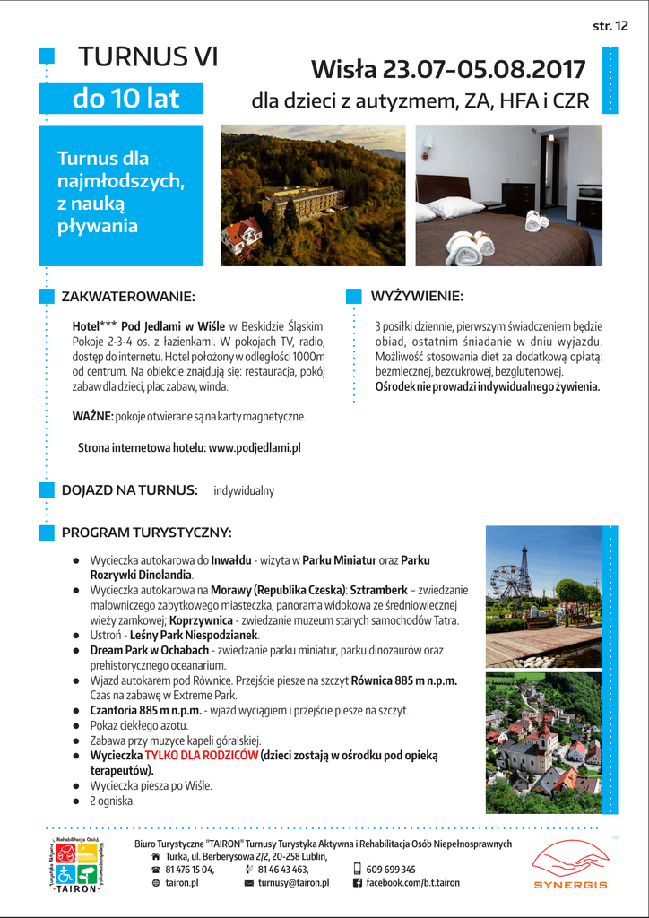 str. 12 TURNUS VI do 10 lat Wisła 23.07-05.08.2017 dla dzieci z autyzmem, ZA, HFA i CZR Turnus dla najmłodszych, z nauką pływania WYŻYWIENIE: ZAKWATEROWANIE: Hotel*** Pod Jedlami w Wiśle w Beskidzie Śląskim. Pokoje 2-3-4 os. z łazienkami. W pokojach TV, radio, dostęp do internetu. Hotel położony w odległości 1000m od centrum. Na obiekcie znajdują się: restauracja, pokój zabaw dla dzieci, plac zabaw, winda. 3 posiłki dziennie, pierwszym świadczeniem będzie obiad, ostatnim śniadanie w dniu wyjazdu. Możliwość stosowania diet za dodatkową opłatą: bezmlecznej, bezcukrowej, bezglutenowej. Ośrodeknie prowadzi indywidualnego żywienia. WAŻNE: pokoje otwierane są na kartymagnetyczne. Strona internetowa hotelu: www.podjedlami.pl DOJAZD NA TURNUS: indywidualny PROGRAM TURYSTYCZNY: l l l l l l l l l l l Wycieczka autokarowa do Inwałdu - wizyta w Parku Miniatur oraz Parku Rozrywki Dinolandia. Wycieczka autokarowa na Morawy (Republika Czeska): Sztramberk – zwiedzanie malowniczego zabytkowego miasteczka, panorama widokowa ze średniowiecznej wieży zamkowej; Koprzywnica - zwiedzanie muzeum starych samochodów Tatra. Ustroń - Leśny Park Niespodzianek. Dream Park w Ochabach - zwiedzanie parku miniatur, parku dinozaurów oraz prehistorycznego oceanarium. Wjazd autokarem pod Równicę. Przejście piesze na szczyt Równica 885 m n.p.m. Czas na zabawę w Extreme Park. Czantoria 885 m n.p.m. - wjazd wyciągiem i przejście piesze na szczyt. Pokaz ciekłego azotu. Zabawa przy muzyce kapeli góralskiej. Wycieczka TYLKO DLA RODZICÓW (dzieci zostają w ośrodku pod opieką terapeutów). Wycieczka piesza po Wiśle. 2 ogniska. Biuro Turystyczne "TAIRON" Turnusy Turystyka Aktywna i Rehabilitacja Osób Niepełnosprawnych Turka, ul. Berberysowa 2/2, 20-258 Lublin, 81 476 15 04, 81 46 43 463, 609 699 345 tairon.pl [email protected] facebook.com/b.t.tairon str. 13 PROGRAM TERAPEUTYCZNY TURNUSU: Zajęcia prowadzą terapeuci z Centrum Terapii SYNERGIS z Warszawy 12 dzieci w wieku 5-10 lat z Zespołem Aspergera lub HFA (wysokofunkcjonujący autyzm) 2 h 40 min terapii grupowej dziennie (26 h 40 min w trakcie trwania turnusu) - trening umiejętności społecznych i komunikacji zajęcia muzyczno - ruchowe dla rodziców z dziećmi (6 godzin wtrakcietrwaniaturnusu) nauka pływania (30 min. dziennie, 5 godzin wtrakcietrwaniaturnusu) - w czasie wyjazdów na basen całych rodzin 20 dzieci w wieku do lat 5 z autyzmem, ZA i CZR 50 minterapii indywidualnej dziennie (8 h 20 min wtrakcietrwaniaturnusu) 50 min zajęć grupowych dziennie (8 h 20 min godzin wtrakcietrwaniaturnusu) zajęcia muzyczno - ruchowe dla rodziców z dziećmi (6 godzin wtrakcietrwaniaturnusu) opieka indywidualnego tutora - terapeuty obejmująca tutoring w trakcie sytuacji codziennych, posiłków, spacerów - w zależności od zgłaszanych przez rodziców potrzeb nauka pływania (30 min. dziennie, 5 godzin wtrakcietrwaniaturnusu) - w czasie wyjazdów na basen całych rodzin Rodzice z całego turnusu warsztatytematyczne dla rodziców - 4 godzinywtrakcietrwaniaturnusu - zajęcia dodatkowe spotkania podsumowujące zajęcia naturnusie opracowanie opisu przebiegu zajęć Dla wszystkich uczestników turnusu wyjazdyna basen do Skoczowa - 10 razywtrakcieturnusu (po 1 godz.) Zajęcia odbywają się od poniedziałku do piątku (10 dni na turnusie). Ostateczna decyzja o kwalifikacji na turnus należy do terapeutów CT Synergis. Turnus dla 32 dzieci objętych terapią + opiekunowie CENA TURNUSU: Rodzina (2 os.): 5700 zł, w tym: Dziecko objęte terapią: 3700 zł Opiekun dziecka: 2000 zł Dodatkowa osoba w wieku powyżej 12 lat: 1800 zł Dodatkowe dziecko w wieku 4-11: 1450 zł Dodatkowe dziecko w wieku 4-11, bez własnego łóżka: 1150 zł Dodatkowe dziecko do lat 3, bez świadczeń: gratis Dopłata do diety bezcukrowej: 75 zł /os./turnus Dopłata do diety bezmlecznej: 75 zł /os./turnus Dopłata do diety bezglutenowej: 125 zł /os./turnus Istnieje możliwość dodatkowego ubezpieczenia od kosztów rezygnacji z turnusu. Biuro Turystyczne "TAIRON" Turnusy Turystyka Aktywna i Rehabilitacja Osób Niepełnosprawnych Turka, ul. Berberysowa 2/2, 20-258 Lublin, 81 476 15 04, 81 46 43 463, 609 699 345 tairon.pl [email protected] facebook.com/b.t.tairon Niniejsza propozycja nie stanowi oferty w rozumieniu przepisów Kodeksu Cywilnego.