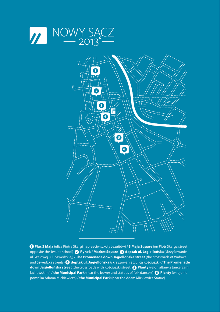 1 3 4 6 1 Plac 3 Maja (ulica Piotra Skargi naprzeciw szkoły Jezuitów) / 3 Maja Square (on Piotr Skarga street opposite the Jesuits school) 2 Rynek / Market Square 3 deptak ul. Jagiellońska (skrzyżowanie ul. Wałowej i ul. Szwedzkiej) / The Promenade down Jagiellońska street (the crossroads of Wałowa and Szwedzka streets) 4 deptak ul. Jagiellońska (skrzyżowanie z ulicą Kościuszki) / The Promenade down Jagiellońska street (the crossroads with Kościuszki street) 5 Planty (rejon altany z tancerzami lachowskimi) / the Municipal Park (near the bower and statues of folk dancers) 6 Planty (w rejonie pomnika Adama Mickiewicza) / the Municipal Park (near the Adam Mickiewicz Statue) Europejski Festiwal Pasteli – Małopolska, VI Międzynarodowe Biennale Pasteli – Nowy Sącz 2013 European Pastel Festival – Małopolska, 6th International Biennial Pastel Exhibition – Nowy Sącz 2013 Międzynarodowy Plener Malarstwa Pastelowego i Fotografii International Pastel and Photography Plein-air Meeting Cyprian Biełaniec, Polska / Poland • Menachem Chalif, Izrael / Israel • Katarzyna Czuchnowska, Polska / Poland• Ivan Didyk, Ukraina / Ukraine • Jolenta Dorszewska-Pötting, Niemcy / Germany • Laura Ghinea, Rumunia / Romania • Jan Mattheus de Grauw, Holandia / The Netherlands • Ewa Jablonsky, Austria / Austria • Stanisław Kusiak, Polska / Poland • Nadia Lavrova, Rosja/Russia • Jørgen Lisborg, Dania / Denmark • Krystyna Miller-Gawrzyńska, Austria / Austria • Sorin Olimpiu Nicodim, Rumunia / Romania • Barbara Pierzgalska, Polska / Poland • Florica Prevenda, Rumunia / Romania • José Del Riego Garcia-Argüelles, Hiszpania / Spain • Ewa Siemińska, Polska / Poland • Daryna Skrynnyk-Myśka, Ukraina / Ukraine • Pierre Tchakhotine, Włochy / Italy • Goście Pleneru: / The Plein-air Guests: Krzysztof Bojarczuk • Iwona Bugajska-Bigos • Wacław Jagielski • Bogdan Kiwak • Krzysztof Kuliś • Radek Kuliś • Ryszard Miłek • Andrzej Naściszewski • Katarzyna Zwolińska, Polska / Poland Kurator pleneru / The Plein-air Curator: Bernadetta Stępień, Polska / Poland Wystawa będzie prezentowana w dniach od 6 września do 13 października 2013 roku w Galerii SOKÓŁ w Nowym Sączu przy ul. Długosza 3 The exhibition will be presented at SOKÓŁ Gallery in Nowy Sącz at Długosza 3 from September 6th to October 13th, 2013. Reprodukcje prac poplenerowych będzie można również obejrzeć w przestrzeni miasta Nowego Sącza w miejscach zaznaczonych na mapce. Reproductions of the post-plein air pastel works will be on display outdoors in the public space of Nowy Sącz at the sites shown on the map. Projekt jest współfinansowany przez Unię Europejską w ramach Małopolskiego Regionalnego Programu Operacyjnego na lata 2007–2013 The project is co-financed by the European Union through Małopolska Regional Operational Programme for the years 2007–2013. Fundusze Europejskie dla Małopolski European Funds for Małopolska
