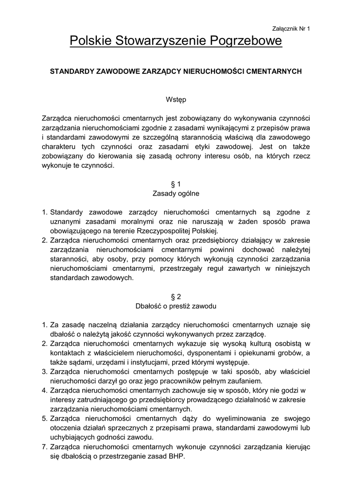 Załącznik Nr 1 Polskie Stowarzyszenie Pogrzebowe STANDARDY ZAWODOWE ZARZĄDCY NIERUCHOMOŚCI CMENTARNYCH Wstęp Zarządca nieruchomości cmentarnych jest zobowiązany do wykonywania czynności zarządzania nieruchomościami zgodnie z zasadami wynikającymi z przepisów prawa i standardami zawodowymi ze szczególną starannością właściwą dla zawodowego charakteru tych czynności oraz zasadami etyki zawodowej. Jest on także zobowiązany do kierowania się zasadą ochrony interesu osób, na których rzecz wykonuje te czynności. §1 Zasady ogólne 1. Standardy zawodowe zarządcy nieruchomości cmentarnych są zgodne z uznanymi zasadami moralnymi oraz nie naruszają w żaden sposób prawa obowiązującego na terenie Rzeczypospolitej Polskiej. 2. Zarządca nieruchomości cmentarnych oraz przedsiębiorcy działający w zakresie zarządzania nieruchomościami cmentarnymi powinni dochować należytej staranności, aby osoby, przy pomocy których wykonują czynności zarządzania nieruchomościami cmentarnymi, przestrzegały reguł zawartych w niniejszych standardach zawodowych. §2 Dbałość o prestiż zawodu 1. Za zasadę naczelną działania zarządcy nieruchomości cmentarnych uznaje się dbałość o należytą jakość czynności wykonywanych przez zarządcę. 2. Zarządca nieruchomości cmentarnych wykazuje się wysoką kulturą osobistą w kontaktach z właścicielem nieruchomości, dysponentami i opiekunami grobów, a także sądami, urzędami i instytucjami, przed którymi występuje. 3. Zarządca nieruchomości cmentarnych postępuje w taki sposób, aby właściciel nieruchomości darzył go oraz jego pracowników pełnym zaufaniem. 4. Zarządca nieruchomości cmentarnych zachowuje się w sposób, który nie godzi w interesy zatrudniającego go przedsiębiorcy prowadzącego działalność w zakresie zarządzania nieruchomościami cmentarnych. 5. Zarządca nieruchomości cmentarnych dąży do wyeliminowania ze swojego otoczenia działań sprzecznych z przepisami prawa, standardami zawodowymi lub uchybiających godności zawodu. 7. Zarządca nieruchomości cmentarnych wykonuje czynności zarządzania kierując się dbałością o przestrzeganie zasad BHP. 8. Zarządca nie podejmuje się wykonania czynności, które wykraczają poza jego wiedzę i kompetencje zawodowe, a w szczególności są sprzeczne z obowiązującymi normami prawnymi i społecznymi. 9. Zarządca nieruchomości cmentarnych uczestniczy w pracach organizacji zawodowych, wspiera ich działalność, a swoją postawą przyczynia się do integracji środowiska zarządców nieruchomości cmentarnych oraz zapewnienia wysokiej pozycji zawodu. §3 Współpraca między zarządcami 1. Stosunki między zarządcami nieruchomościami cmentarnych powinny być oparte na koleżeństwie i współpracy. 2. Działania marketingowe zarządców nieruchomości cmentarnych powinny świadczyć o ich profesjonalizmie popartym referencjami, a materiały promocyjne i sposób ich prezentacji nie mogą wywoływać wrażenia negatywnego co do jakości usług oferowanych przez innych zarządców nieruchomości cmentarnych. 3. Zarządca nieruchomości cmentarnych ma prawo w celach reklamowych informować o zarządzaniu daną nieruchomością, jeżeli właściciele nieruchomości wyrazili na to pisemną zgodę. §4 Tajemnica zawodowa 1. Zarządcę nieruchomości cmentarnych obowiązuje tajemnica zawodowa obejmująca wszelkie informacje związane z zarządzaniem nieruchomościami, które mogłyby w jakikolwiek sposób naruszyć interesy właścicieli i użytkowników nieruchomości. Obowiązek ten spoczywa na zarządcy również po ustaniu wykonywania czynności, chyba że z tego obowiązku zwolnił go sąd lub inny właściwy organ, albo właściciele nieruchomości. 2. Zarządca nieruchomości cmentarnych obowiązany jest zapewnić właścicielom nieruchomości warunki do swobodnego składania oświadczeń, zachowania tajemnicy, a także obowiązany jest zapewnić bezpieczne przechowywanie całej dokumentacji dotyczącej dokonywanych czynności, gwarantujące zachowanie tajemnicy zawodowej, w tym ochronę danych osobowych. 3. Obowiązkiem zarządcy jest dbanie o zachowanie tajemnicy zawodowej przez jego pracowników, na zasadach obowiązujących jego samego. §5 Obowiązek informowania klienta 1. Zarządca nieruchomości jest zobowiązany do udzielania właścicielom informacji na temat zarządzanej nieruchomości oraz udostępniania do kontroli dokumentów dotyczących zarządzanej nieruchomości. Swoim zachowaniem zarządca nieruchomości cmentarnych powinien dążyć do stworzenia warunków do wzajemnej wymiany informacji. 2. Wszelkie informacje dotyczące zarządzanej nieruchomości, udzielane przez zarządcę, powinny być zgodne ze znanym mu stanem faktycznym. 3. Zarządca nieruchomości cmentarnych nie może zatajać przed osobą, na rzecz której świadczy usługi zarządzania, istotnych i znanych faktów związanych z zarządzaną nieruchomością ani nie może osoby takiej wprowadzać w błąd co do faktów i praw dotyczących zarządzanej nieruchomości. §6 Konflikt interesów 1. Zarządca nieruchomości cmentarnych dołoży wszelkich starań aby jakiekolwiek sytuacje konfliktowe, spory dotyczące zapisu umowy o zarządzaniu i sposobu jej realizacji były rozwiązywane polubownie, bez konieczności występowania na drogę postępowania sądowego. §7 Dokumentacja 1. Zarządca nieruchomości cmentarnych ma obowiązek na bieżąco prowadzić i aktualizować dokumentację zarządzanej nieruchomości. Jest on także zobowiązany do prawidłowego gromadzenia i starannego przechowywania tej dokumentacji. 2. Przekazanie dokumentacji powinno być dokonane niezwłocznie, nie później jednak niż w terminie określonym w umowie o zarządzanie nieruchomością. §8 Obsługa finansowa 1. Wynagrodzenie zarządcy nieruchomości wynika z umowy o zarządzanie nieruchomościami. Wynagrodzenie za wykonywanie czynności zarządzania powinno być odp