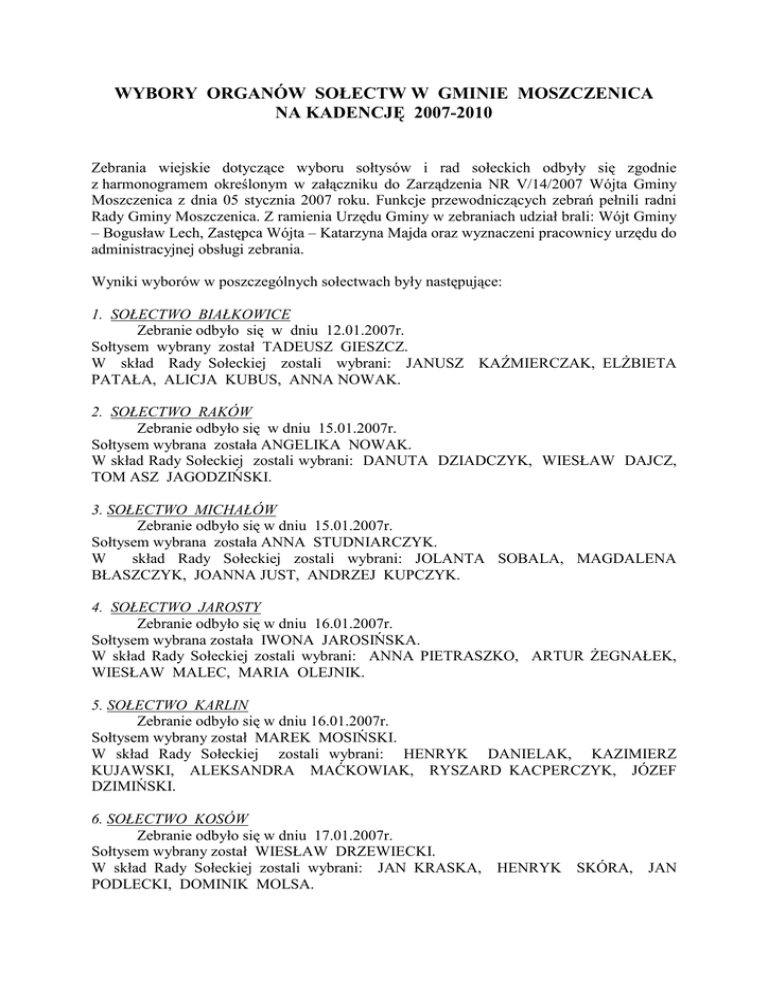 WYBORY ORGANÓW SOŁECTW W GMINIE MOSZCZENICA NA KADENCJĘ 2007-2010 Zebrania wiejskie dotyczące wyboru sołtysów i rad sołeckich odbyły się zgodnie z harmonogramem określonym w załączniku do Zarządzenia NR V/14/2007 Wójta Gminy Moszczenica z dnia 05 stycznia 2007 roku. Funkcje przewodniczących zebrań pełnili radni Rady Gminy Moszczenica. Z ramienia Urzędu Gminy w zebraniach udział brali: Wójt Gminy – Bogusław Lech, Zastępca Wójta – Katarzyna Majda oraz wyznaczeni pracownicy urzędu do administracyjnej obsługi zebrania. Wyniki wyborów w poszczególnych sołectwach były następujące: 1. SOŁECTWO BIAŁKOWICE Zebranie odbyło się w dniu 12.01.2007r. Sołtysem wybrany został TADEUSZ GIESZCZ. W skład Rady Sołeckiej zostali wybrani: JANUSZ KAŹMIERCZAK, ELśBIETA PATAŁA, ALICJA KUBUS, ANNA NOWAK. 2. SOŁECTWO RAKÓW Zebranie odbyło się w dniu 15.01.2007r. Sołtysem wybrana została ANGELIKA NOWAK. W skład Rady Sołeckiej zostali wybrani: DANUTA DZIADCZYK, WIESŁAW DAJCZ, TOM ASZ JAGODZIŃSKI. 3. SOŁECTWO MICHAŁÓW Zebranie odbyło się w dniu 15.01.2007r. Sołtysem wybrana została ANNA STUDNIARCZYK. W skład Rady Sołeckiej zostali wybrani: JOLANTA SOBALA, MAGDALENA BŁASZCZYK, JOANNA JUST, ANDRZEJ KUPCZYK. 4. SOŁECTWO JAROSTY Zebranie odbyło się w dniu 16.01.2007r. Sołtysem wybrana została IWONA JAROSIŃSKA. W skład Rady Sołeckiej zostali wybrani: ANNA PIETRASZKO, ARTUR śEGNAŁEK, WIESŁAW MALEC, MARIA OLEJNIK. 5. SOŁECTWO KARLIN Zebranie odbyło się w dniu 16.01.2007r. Sołtysem wybrany został MAREK MOSIŃSKI. W skład Rady Sołeckiej zostali wybrani: HENRYK DANIELAK, KAZIMIERZ KUJAWSKI, ALEKSANDRA MAĆKOWIAK, RYSZARD KACPERCZYK, JÓZEF DZIMIŃSKI. 6. SOŁECTWO KOSÓW Zebranie odbyło się w dniu 17.01.2007r. Sołtysem wybrany został WIESŁAW DRZEWIECKI. W skład Rady Sołeckiej zostali wybrani: JAN KRASKA, HENRYK SKÓRA, JAN PODLECKI, DOMINIK MOLSA. 7. SOŁECTWO RĘKORAJ Zebranie odbyło się w dniu 17.01.2007r. Sołtysem wybrana została HALINA KOWARA. W skład Rady Sołeckiej zostali wybrani: KRYSTYNA BARCELUK, LESZEK KRÓL, STANISŁAW KRASKA. SZYCHTA, ELśBIETA 8. SOŁECTWO POMYKÓW Zebranie odbyło się w dniu 19.01.2007r. Sołtysem wybrany został ZBIGNIEW DEKA. W skład Rady Sołeckiej zostali wybrani: WŁADYSŁAW GAZDA, MARIAN SOCHACKI, ADAM DERACH. 9. SOŁECTWO SIEROSŁAW Zebranie odbyło się w dniu 22.01.2007r. Sołtysem wybrany został SŁAWOMIR MICHALAK. W skład Rady Sołeckiej zostali wybrani: LESZEK MAKOWSKI, CZESŁAW LESIAK, MIROSŁAW ŚWIECH, ZYGMUNT JAMROśEK, JAN RUSZKIEWICZ. 10. SOŁECTWO SROCK Zebranie odbyło się w dniu 22.01.2007r. Sołtysem wybrana została ZOFIA KAWALEC. W skład Rady Sołeckiej zostali wybrani: JÓZEF TELUS, SYLWESTER PIERZCHAŁA, GRZEGORZ SIKORA. 11. SOŁECTWO KIEŁCZÓWKA Zebranie odbyło w dniu 23.01.2007r. Sołtysem wybrana została URSZULA PLUTA. W skład Rady Sołeckiej zostali wybrani: JACEK KRAWENTEK, JAN KRAWENTEK, TERESA PIELESIEK, HALINA DURSKA, JAN BERNER, JANINA KOZŁOWSKA. 12. SOŁECTWO BABY Zebranie odbyło się w dniu 23.01.2007r. Sołtysem wybrany został MIROSŁAW KAWNIK. W skład Rady Sołeckiej zostali wybrani: GRZEGORZ ŁUCZYŃSKI, WALDEMAR MOLSA, WALDEMAR DERENDARZ, JACEK DERENDARZ, BŁAśEJ ŁASKI. 13. SOŁECTWO GOŚCIMOWICE DRUGIE-POWĘZINY Zebranie odbyło się w dniu 24.01.2007r. Sołtysem wybrany został ZBIGNIEW ŚWINOGA. W skład Rady Sołeckiej zostali wybrani: KRZYSZTOF MICHALAK, PAWEŁ KRAŚ, WIESŁAWA BŁASZCZYK, WIOLETTA RUSZKIEWICZ. 14. SOŁECTWO GAJKOWICE Zebranie odbyło się w dniu 24.01.2007r. Sołtysem wybrany został BŁAśEJ WROŃSKI. W skład Rady Sołeckiej zostali wybrani: DOROTA KOWALCZYK, RYSZARD GÓRNISIEWICZ, EDWARD SZAFRAŃSKI, STANISŁAW MIKUSZEWSKI. 15. SOŁECTWO GOŚCIMOWICE PIERWSZE Zebranie odbyło się w dniu 25.01.2007r. Sołtysem wybrana została BOGUSŁAWA GLINKA. W skład Rady Sołeckiej zostali wybrani: JAN OLEKSIEWICZ, ADAM PODLECKI. SZANFEBER, SŁAWOMIR 16. SOŁECTWO GOŚCIMOWICE DRUGIE Zebranie odbyło się w dniu 25.01.2007r. Sołtysem wybrana została GRAśYNA ADAMUS. W skład Rady Sołeckiej zostali wybrani: JADWIGA KUCHTA, ZBIGNIEW GLINKA. IZABELA PIŁAT, 17. SOŁECTWO PODOLIN Zebranie odbyło się w dniu 29.01.2007r. Sołtysem wybrany został GRZEGORZ NOWICKI. W skład Rady Sołeckiej zostali wybrani: WŁODZIMIERZ DEREWENDA, WIESŁAW WÓJCIK, MAREK KUPKA. 18. SOŁECTWO RACIBOROWICE Zebranie odbyło się w dniu 29.01.2007r. Sołtysem wybrana została AGNIESZKA JANIEC. W skład Rady Sołeckiej zostali wybrani: LEOKADIA HEJDUK, CHRUSTOWSKA, MARIUSZ MAMEŁKA. AGNIESZKA 19. SOŁECTWO MOSZCZENICA OSIEDLE Zebranie odbyło się w dniu 30.01.2007r. Sołtysem wybrana została AGNIESZKA SOŃTA. W skład Rady Sołeckiej zostali wybrani: IRENEUSZ DYBAŁA, JAN JOŃCZYK, EWA KAWNIK, ALEKSANDER CIEŚLIK. 20. SOŁECTWO MOSZCZENICA WOLA Zebranie odbyło się w dniu 30.01.2007r. Sołtysem wybrany został JERZY GLISZCZYŃSKI. W skład Rady Sołeckiej zostali wybrani: MARIA MIROSŁAW WACHOWIEC, ANDRZEJ SITEK. ZASADA, CEZARY śEREK, 21. SOŁECTWO GAZOMIA STARA Zebranie odbyło się w dniu 01.02.2007r. Sołtysem wybrana została GRAśYNA WOJNA. W skład Rady Sołeckiej zostali wybrani: LEOKADIA SITARZ, MAREK KAWNIK, JERZY PRZYBYŁ, ZBIGNIEW MATERA, TADEUSZ KRUZ. 22. SOŁECTWO GAZOMIA NOWA Zebranie odbyło się w dniu 01.02.2007r. Sołtysem wybrana została HENRYKA WÓJCIK. W skład Rady Sołeckiej zostali wybrani: MIROSŁAW KAWNIK, WOJCIECH KACZOR, PAWEŁ SOŃTA, JAN śEREK, TOMASZ MIERZWA. 23. SOŁECTWO MOSZCZENICA Zebranie odbyło się w dniu 04.02.2007r. Sołtysem wybrany został JAN DĄBROWSKI. W skład Rady Sołeckiej zostali wybrani: JERZY HEJNIAK, STANISŁAW KAŹMIERCZAK, JAN KAŹMIERCZAK, BRONISŁAW GÓRA, GRZEGORZ MIDERA, ANNA STELMACH, EDWARD SARNOWIAK. W sołectwie tym nastąpił równieŜ wybór Komisji Rewizyjnej. W skład Komisji zostali wybrani: JAN KAŹMIERCZAK, URSZULA śAK-ŁASKA, TOMASZ KAŹMIERCZAK. Zmiana sołtysów nastąpiła w 1