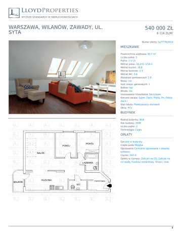 WARSZAWA, WILANÓW, ZAWADY, UL. SYTA 540 000 ZŁ 6 116 ZŁ/M2 Numer oferty: LL/7776/2014 MIESZKANIE Powierzchnia użytkowa: 83.7 m2 Liczba pokoi: 3 Piętro: 2 (z 2) Metraż pokoi: 18.2/11.1/10.2 Metraż kuchni: 16.6 Metraż łazienek: 4.3 Metraż WC: 3.6 Wysokość pomieszczeń: 2.8 Skosy: nie Ilość miejsc garażowych: 1 Balkon: tak Winda: nie Usytuowanie mieszkania: Szczytowe Kierunki świata: Salon: Zach./ Pokój: Pn./ Pokój: Zach./ Stan lokalu: Podwyższony standard Okna: PCV BUDYNEK Rodzaj budynku: Blok Rok budowy: 2006 Liczba pięter: 2 Technologia: Cegła OPŁATY Gaz Jest w budynku Ciepła woda Miejska Ogrzewanie Centralne ogrzewanie z własnej kotłowni Czynsz: 543 zł Opłaty w czynszu: Zaliczki na CO, Zaliczki na c/z wodę, Fundusz remontowy, Śmieci, inne 1 Katarzyna Łosińska Property Expert + 48 512 267 010 [email protected] OPIS Mieszkanie o powierzchni 83,7 m2 (po podłodze 88,3 m2), usytuowane jest na 2 piętrze w 3 kondygnacyjnym, kameralnym budynku. Wykończone zostało "pod klucz", wysokiej jakości materiałami, nigdy nie było zamieszkane. Na podłogach w salonie (18,2 m2), kuchni połączonej z jadalnią (16,6 m2) oraz sypialniach (11,1/10,2 m2) leży olejowany, egzotyczny parkiet marbau. Łazienkę (4,3 m2) oraz WC (3,6 m2) wyłożono glazurą i terakotą, która nawiązując charakterem do marmuru, nadaje pomieszczeniom elegancji. Zamontowano wysokiej jakości armaturę łazienkową Paffoni i biały montaż Villeroy & Boch. Meble kuchenne z frontami w kolorze kremowym - zrobiono na wymiar. Drzwi wewnętrzne fornirowane merbau, zaopatrzono w wygodne (bezpieczne dla dzieci) zamki magnetyczne. Zamontowano sufity podwieszane z energooszczędnym oświetleniem ledowym. Ciekawym bonusem do lokalu jest wyjątkowo duża piwnica o pow. 12,8 m2. Znajdzie się tam więc miejsce zarówno na rowery, mały składzik czy niewielki warsztat. Prezentowany lokal znajduje się na cichym osiedlu, w dwupiętrowym budynku z cegły, z 2006 roku. W budynku nie ma windy. Na osiedlu znajdują się ogólnodostępne miejsca parkingowe dla gości, a przed budynkiem - wyłącznie dla mieszkańców. Zielone i spokojne tereny nadwiślańskiej części Wilanowa, to obszar, który daje duże możliwości rekreacji i aktywnego wypoczynku. W pobliżu znajdują się liczne ścieżki spacerowe i rowerowe, pole golfowe, Pałac Wilanowski oraz ustronne miejsca z nietuzinkowym widokiem na Wisłę. Najbliższa okolica charakteryzuje się bogatą infrastrukturą. Niedawno powstało tutaj nowe centrum handlowe. Ważnym czynnikiem tej lokalizacji jest dobra komunikacja z centrum Warszawy. 2