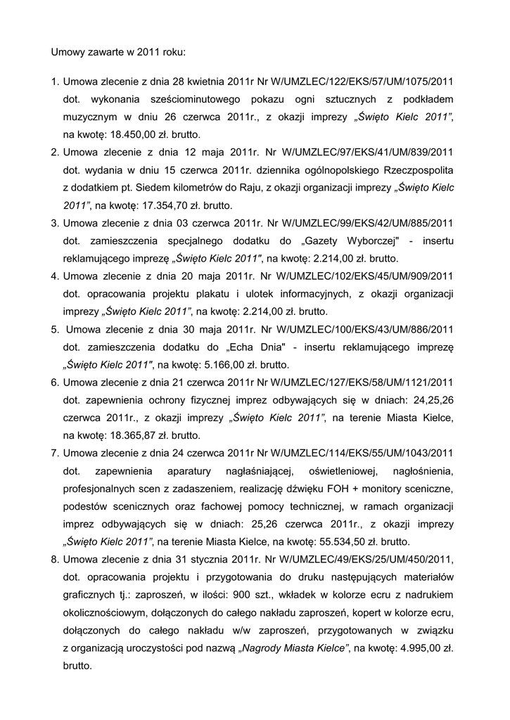 Umowy zawarte w 2011 roku: 1. Umowa zlecenie z dnia 28 kwietnia 2011r Nr W/UMZLEC/122/EKS/57/UM/1075/2011 dot. wykonania sześciominutowego pokazu ogni sztucznych z podkładem muzycznym w dniu 26 czerwca 2011r., z okazji imprezy „Święto Kielc 2011”, na kwotę: 18.450,00 zł. brutto. 2. Umowa zlecenie z dnia 12 maja 2011r. Nr W/UMZLEC/97/EKS/41/UM/839/2011 dot. wydania w dniu 15 czerwca 2011r. dziennika ogólnopolskiego Rzeczpospolita z dodatkiem pt. Siedem kilometrów do Raju, z okazji organizacji imprezy „Święto Kielc 2011”, na kwotę: 17.354,70 zł. brutto. 3. Umowa zlecenie z dnia 03 czerwca 2011r. Nr W/UMZLEC/99/EKS/42/UM/885/2011 dot. zamieszczenia specjalnego dodatku do „Gazety Wyborczej" - insertu reklamującego imprezę „Święto Kielc 2011", na kwotę: 2.214,00 zł. brutto. 4. Umowa zlecenie z dnia 20 maja 2011r. Nr W/UMZLEC/102/EKS/45/UM/909/2011 dot. opracowania projektu plakatu i ulotek informacyjnych, z okazji organizacji imprezy „Święto Kielc 2011”, na kwotę: 2.214,00 zł. brutto. 5. Umowa zlecenie z dnia 30 maja 2011r. Nr W/UMZLEC/100/EKS/43/UM/886/2011 dot. zamieszczenia dodatku do „Echa Dnia" - insertu reklamującego imprezę „Święto Kielc 2011", na kwotę: 5.166,00 zł. brutto. 6. Umowa zlecenie z dnia 21 czerwca 2011r Nr W/UMZLEC/127/EKS/58/UM/1121/2011 dot. zapewnienia ochrony fizycznej imprez odbywających się w dniach: 24,25,26 czerwca 2011r., z okazji imprezy „Święto Kielc 2011”, na terenie Miasta Kielce, na kwotę: 18.365,87 zł. brutto. 7. Umowa zlecenie z dnia 24 czerwca 2011r Nr W/UMZLEC/114/EKS/55/UM/1043/2011 dot. zapewnienia aparatury nagłaśniającej, oświetleniowej, nagłośnienia, profesjonalnych scen z zadaszeniem, realizację dźwięku FOH + monitory sceniczne, podestów scenicznych oraz fachowej pomocy technicznej, w ramach organizacji imprez odbywających się w dniach: 25,26 czerwca 2011r., z okazji imprezy „Święto Kielc 2011”, na terenie Miasta Kielce, na kwotę: 55.534,50 zł. brutto. 8. Umowa zlecenie z dnia 31 stycznia 2011r. Nr W/UMZLEC/49/EKS/25/UM/450/2011, dot. opracowania projektu i przygotowania do druku następujących materiałów graficznych tj.: zaproszeń, w ilości: 900 szt., wkładek w kolorze ecru z nadrukiem okolicznościowym, dołączonych do całego nakładu zaproszeń, kopert w kolorze ecru, dołączonych do całego nakładu w/w zaproszeń, przygotowanych w związku z organizacją uroczystości pod nazwą „Nagrody Miasta Kielce”, na kwotę: 4.995,00 zł. brutto. 9. Umowa o dzieło z dnia 08 lutego 2011r. Nr W/UMDZ/4/EKS/4/UM/403/2011 dot. wykonania 11 egzemplarzy mosiężnych statuetek pn. „Nagroda Miasta Kielce”, na kwotę: 5.610,00 zł. brutto. 10. Umowa o dzieło z dnia 02 lutego 2011r. Nr W/UMDZ/1/EKS/1/UM/315/2011, dot. przygotowania scenariusza, montażu i realizacji 11 filmów 30 sekundowych przedstawiających sylwetki laureatów oraz prowadzenie uroczystości z okazji wręczenia „Nagród Miasta Kielce”, na kwotę: 3.300,00 zł. brutto. 11. Umowa zlecenie z dnia 14 lutego 2011r. Nr W/UMZLEC/47/EKS/23/UM/440/2011 dot. zorganizowania koncertu zespołu "Raz, Dwa, Trzy" w ramach uroczystości pn. „Nagrody Miasta Kielce" w dniu 02.03.2011r. w Kieleckim Centrum Kultury w Kielcach, na kwotę: 27.615,00 zł. brutto. 12. Umowa zlecenie z dnia 21 lutego 2011r. Nr W/UMZLEC/52/EKS/28/UM/478/2011 dot. przygotowania i obsługi bankietu dla 200 osób po uroczystości wręczenia „Nagród Miasta Kielce”, w dniu 02 marca 2011 w Kieleckim Centrum Kultury w Kielcach, na kwotę: 11.820,00 zł. brutto. 13. dot. Umowa zlecenie z dnia 08 lutego 2011r. Nr W/UMZLEC/26/EKS/9/UM/178/2011 zorganizowania koncertu Kabaretu Skeczów Męczących, połączonego z nagraniem płyty DVD, organizowanego w dniu 12 lutego 2011r. w Kieleckim Centrum Kultury w Kielcach, na kwotę: 50.000,00 zł. brutto. 14. Umowy z dnia 07 stycznia 2011r. Nr W/WU/4/EKS/1/UM/25/2011, z dnia 01 kwietnia 2011r. Nr W/WU/38/EKS/10/UM/793/2011, z dnia 01 lipca 2011r. Nr W/WU/64/EKS/17/UM/1164/2011 Nr W/WU/100/EKS/26/UM/1871/2011 oraz z dnia dot. montażu 06 4 października filmów 2011r. informacyjnych pt. „Kielce - Nasza Duma” i wyemitowanie w Programie Telewizji w sieci kablowej Vectra S.A. w Kielcach, każdego z filmów w ilości po 14 odtworzeń na łączną kwotę: 47.970,00 zł. brutto. 15. Umowa zlecenie z dnia 21 stycznia 2011r Nr W/UMZLEC/25/EKS/8/UM/177/2011 dot. wykonania programu artystycznego – koncertu Mietka Szcześniaka z zespołem, w ramach organizacji kolęd pod hasłem „Prosto z serca", organizowanego w dniu 30 stycznia 2011r. w Rzymsko – Katolickiej Parafii p.w. Św. Wojciecha w Kielcach, na kwotę: 10.024,50 zł. brutto. 16. Umowa zlecenie z dnia 16 lutego 2011r Nr W/UMZLEC/50/EKS/26/UM/456/2011, dot. zapewnienia nagłośnienia, oświetlenia i obsługi muzycznej w ramach współorganizacji gali pn. „Lekarz Roku 2010", w dniu 25.02.2011r. w hotelu Łysogóry w Kielcach, na kwotę: 2.934,00 zł. brutto. 17. Umowa zlecenie z dnia 16 lutego 2011r. Nr W/UMDZ/7/EKS/5/UM/457/2011 dot. przygotowania scenariusza oraz prowadzenie gali finałowej pn. „Lekarz Roku 2010", w dniu 25.02.2011r. w hotelu Łysogóry w Kielcach na kwotę: 1.200,00 zł. brutto. 18. Umowa zlecenie z dnia 21 lutego 2011r. Nr W/UMZLEC/51/EKS/27/UM/477/2011 dot. zapewnienia dwóch 2-osobowych pokoi oraz zapewnienia Sali konferencyjnej w ramach współorganizacji w dniu 25 lutego 2011 roku w hotelu Łysogóry w Kielcach plebiscytu pn. „Lekarz Roku 2010", na kwotę: 4.900,00 zł. brutto. 19. Umowa zlecenie z dnia 28 lutego 2011r. Nr W/UMZLEC/55/EKS/30/UM/547/2011 dot. rezerwacji sali w hotelu Kongresowym w Kielcach, w ramach współorganizacji plebiscytu pn. „Kobieta Przedsiębiorcza 2010", w dniu 08 marca 2011r. w godz. 8:00-21:00, na kwotę: 12.000,00 zł. brutto. 20. Umowa zlecenie z dnia 07 marca 2011r. Nr W/UMZLEC/61/EKS/32/UM/631/2011 dot. zakupu bezpłatnego dodatku do Echa Dnia zawierającego zdjęcia wszystkich uczniów