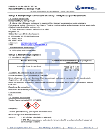 KARTA CHARAKTERYSTYKI Koncentrat Płynu Borygo Truck Sekcja