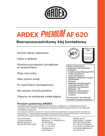 Bezropuszczalnikowy klej kontaktowy Szeroki zakres zastowania Łatwy w aplikacji Wysoka przyczepność początkowa po przeschnięciu Długi czas pracy Niski poziom emisji Po wyschnięciu bezzapachowy Nie zawiera rozcieńczalników Odporny na substancje zmiękczające Obszar zastosowania: dyspersyjny klej kontaktowy do klejenia: •Cokołów przypodłogowych PVC •Profili schodowych •Listew maskujących •Wykładzin tekstylnych, tkanych lub filcowych •Przegród •Wykładzin homogenicznych i heterogenicznych z PVC •Wykładzin kauczukowych •Wykładzin - CV •Wykładzin dekoracyjnych •Podkładów izolacyjnych •Linoleum Na chłonnych i nie chłonnych podłożach wewnątrz budynków Produkt systemowy ARDEX Szczególną pewność daje zastosowanie produktu w połączeniu z podkładowymi masami rozlewnymi firmy ARDEX. Zastosowanie rozwiązania systemowego zapewnia brak zbędnych i szkodliwych zapachów. Firma Ardex jest członkiem Instytutu GEV (Gemeinschaft Emissionskontrollierte Verlegewerkstoffe, Klebstoffe Und Bauprodukte e V.). Stowarzyszenia zajmującego się badaniem poziomu emisji substancji lotnych wśród preparatów do podłóg, klejów i innych materiałów powszechnie stosowanych w budownictwie. Wyprodukowane w systemie jakości QM/UM zgodnym z DIN EN ISO 9001/14001 ARDEX Polska Sp.z o.o. Stanowice, ul. Jarzębinowa 6 55-200 Oława tel.: 71 716 45 60 fax: 71 716 45 61 [email protected] www.ardex.pl ARDEX GmbH 58430 Witten · Postfach 6120 DEUTSCHLAND Tel.:+49 (0) 23 02/664-0 Fax:+49 (0) 23 02/664-240 [email protected] www.ardex.de Bezropuszczalnikowy klej kontaktowy Zakres stosowania: Wewnątrz, posadzki, ściany, sufity i schody. Dyspersyjny klej kontaktowy do klejenia: • Cokołów przypodłogowych z PVC • Profili schodowych • Listew maskujących • Wykładzin tekstylnych, tkanych lub filcowych • Przegród • Homogenicznych i hetrogenicznych wykładzin PCV • Wykładzin kauczukowych • Wykładzin z CV • Wykładzin dekoracyjnych • Podkładów izolacyjnych • Linoleum na chłonnych i niechłonnych podłożach wewnątrz budynków. ARDEX PREMIUM AF 620 charakteryzuje się uniwersalnym i szerokim obszarem stosowania, lepkością oraz dobrą wytrzymałością końcową. ARDEX PREMIUM AF 620 aplikować można przy pomocy pędzla lub wałka. Dopuszcza się także aplikację kleju przy pomocy pacy grzebieniowej TKB- A1/A2. Klej ARDEX PREMIUM AF 2200 cechuje się uniwersalno ścią i wszechstronnością zastosowań, dobrą wytrzymało ścią początkową i końcową oraz zwiększoną odpornością na wilgoć. Przy małych powierzchniach oraz obszarze krawędzi zaleca się stosowania pędzla. Dobrać ilość kleju tak, by powstała jednorodna, całopowierzchniowa warstwa. Po pełnym przeschnięciu filmu / warstwy kleju (kontrola lepkości palcem) ułożyć wykładzinę / profile a następnie docisnąć lub dobić. Układany materiał rozkładać dokładnie, gdyż siła wiążąca kleju jest niemalże natychmiastowa i wszelkiego rodzaju poprawki są mocno utrudnione. Możliwość natychmiastowego wejścia na klejoną podłogę / korzystania z klejonej posadzki. Wierzchnie zabezpieczenie powierzchni np. z korka naturalnego lub zamknięcie fug łączeniowych możliwe dopiero po upływie 24 godzin. Porada: W celu równomiernego nałożenia kleju i uniknięcia powstawania „kałuż” stosować kratki malarskie. Alternatywnie istnieje możliwość rozprowadzenia nadmiaru kleju z wałka na nieużywanej powierzchni. Dopuszcza się także zagruntowanie klejem powierzchni posadzek i profili w przeddzień planowanych prac. Jednak pamiętać należy o tym, by nie przekroczyć czasu schnięcia kleju wynoszącego 24 h. Wskazówki: Dyspersja polichloroprenowa, dyspersja poliakrylanowa, pochodne kalafonii żywicznych, wypełniacze mineralne, woda, dodatki i środki konserwujące: izotiazolin Przestrzegać instrukcji układania producentów okładzin podłogowych oraz obowiązujących norm i zasad! W przypadku jakichkolwiek wątpliwości przeprowadzić próby klejenia. Powstały na masie klejącej „kożuch“ (np. przez nieprawidłowe składowanie lub otwarte opakowanie) usunąć. Nie starać się go rozmieszać. Przygotowanie podłoża: Zalecane ilości nanoszonego kleju: Opis materiału: Podłoże musi spełniać wymogi normy DIN 18 365 „Pokrycia podłogowe”. W szczególności musi być równe, stale suche, twarde, nośne, czyste, bez pęknięć, jak również musi być wytrzymałe na rozciąganie i ściskanie; w razie konieczności musi zostać właściwie przygotowane. Stare posadzki oraz wszelkiego rodzaju nałożone na podłogi powłoki farb należy przed nałożeniem kleju zmatowić. Stare warstwy kleju należy usunąć. Prace szpachlowe wykonać przy pomocy odpowiednich mas szpachlowych ARDEX oraz substancji gruntujących ARDEX. System firmy ARDEX: W połączeniu z innymi niskoemisyjnymi produktami ARDEX – możliwość tworzenia optymalnej, niskoemisyjnej i bezwonnej konstrukcji. ARDEX PREMIUM AF 620 jest po wyschnięciu fizjologiczne i ekologiczne nieszkodliwy. Zastosowanie: Klej nakładać grubym wałkiem strukturalnym (piankowy gruby, żółty) lub krótkowłosym standardowym wałkiem welurowym (7-9 mm wysokości włosa) na podłożu oraz na wykładzinie podłogowej. Unikać tworzenia się gniazd z kleju / nagromadzania się kleju. Alternatywnie używać można także pacy grzebieniowej TKB- A1. Z uwagi na większą ilość materiału (wysokość nakładania) wydłuża się także czas schnięcia. Możliwość skrócenia czasu schnięcia poprzez zastosowanie suszarek. Zastosowanie suszarek poprawia plastyczność okładziny podłogowej a co za tym idzie ułatwia jej układanie i dopasowanie w obszarze krawędzi. Klej nakładać przy pomocy wałka lub pędzla. Grubość warstwy kleju tak dobrać, by powstała jednolita i wystarczająca warstwa sczepna. W przypadku struktury mocno porowatej (zarówno w materiale posadzki jak i podłożu) zastosować grubszą