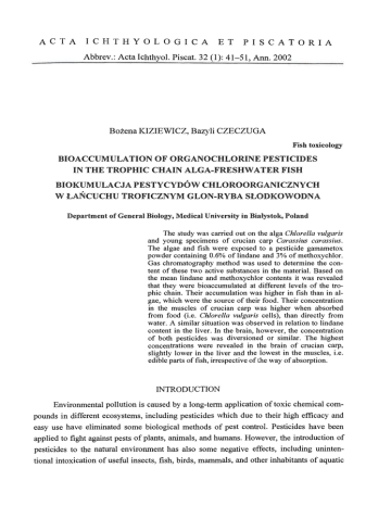 ACTA ICHTHYOLOGICA ET PISCATORIA Abbrev.: Acta Ichthyol. Piscat. 32 (1): 41-51, Ann.. 2002 Bozena KIZIEWICZ, BazyliCZECZUGA Fish toxicology BIOACCUMULATION OF ORGANOCHLORINE PESTICIDES IN THE TROPHIC CHAIN ALGA-FRESHWATER FISH BIOKUMULACJA PESTYCYDOW CHLOROORGANICZNYCH W LANCUCHU TROFICZNYM GLON-RYBA SLODKOWODNA Department of General Biology, Medical University in Bialystok, Poland The study was carried out on the alga Chlorella vulgaris and young specimens of crucian carp Carassius carassius. The algae and fish were exposed to a pesticide gamametox powder containing 0.6% of lindane and 3% of methoxychlor. Gas chromatography method was used to determine the con tent of these two active substances in the material. Based on the mean lindane and methoxychlor contents it was revealed that they were bioaccumulated at different levels of the tro phic chain. Their accumulation was higher in fish than in al gae, which were the source of their food. Their concentration in the muscles of crucian carp was higher when absorbed from food (i.e. Chlorella vulgaris cells), than directly from water. A similar situation was observed in relation to lindane content in the liver. In the brain, however, the concentration of both pesticides was diversioned or similar. The highest concentrations were revealed in the brain of crucian carp, slightly lower in the liver and the lowest in the muscles, i.e. edible parts of fish, irrespective of the way of absorption. INTRODUCTION Environmental pollution is caused by a long-term application of toxic chemical com pounds in different ecosystems, including pesticides which due to their high efficacy and easy use have eliminated some biological methods of pest control. Pesticides have been applied to fight against pests of plants, animals, and humans. However, the introduction of pesticides to the natural environment has also some negative effects, including uninten tional intoxication of useful insects, fish, birds, mammals, and other inhabitants of aquatic 42 Boi:ena Kiziewicz, Bazyli Czeczuga and terrestrial biocenoses (Luczak et al. 1982; Senthilkumar et al. 2001). Some pesticides, particularly those which show high persistence undergo bioconcentration in the respective links of trophic chains. Accumulation of poisons in plants and animals poses a threat to man, considered the top level ofthe trophic pyramid. The humans accumulate considerable amounts of various toxins, including organochlorine pesticides (Mazur et al. 1987; G6ralczyk and Struciiiski 1996). Therefore, the aim ofthis study was to determine the bioaccumulation oflindane and methoxychlor in algae and fish which absorbed the pesticides via th:: absorption from the lower link of the trophic chain, i.e. algae and from water. MATERIAL AND METHODS Toxicological studies were conducted on Chlorella vulgaris Beijer and on young specimens ofcrucian carp Carassius carassius L. The initial breeding material ofpure cul tures of Chlorella vulgaris was obtained from the Laboratory of Radiation Genetics, the Institute ofBiophysics in Moscow. Fish specimens were collected from breeding ponds in Knyszyn. The study used gamametox powder, containing active substances: 0.6% of lin dane, (gamma isomer 1,2,3,4,5,6 hexachlorcyclohexane) and 3% ofmethoxychlor DMDT (1,1,1 of trichloro-2 bis 4 methoxyfenyloetan). Algae were cultured on K.nop's medium. Gamametox powder was introduced to pure alga cultures, in a dose of 10-2 (lindane 6 x 10- 5 mg·dm- 3, methoxychlor 3 x 10--4 mg·dm-3), 10--4 (lindane 6 x 10- 7 mg·dm-3, methoxy chlor 3 x 10-6 mg·dm-3), 10-6 mg·dm-3 (lindane 6 x 10- 9 mg·dm-3, methoxychlor 3 x 10- 8 mg·dm-3). After 10 days, the algae were collected, filtered and then divided into parts, of which one (pesticide-intoxicated algae) was given as food to fish. The remaining algae were subjected to chemical analysis for the pesticide content. Toxicological analysis using fish was repeated eight times (n = 8), with several specimens of the species in each of the following groups: Control group I -crucian carp kept in pesticide-free water and given non-intoxicated algae as food. Group II - crucian carp in the water containing gamametox powder in a dose of 0.5 mg·dm-3 (lindane 3 x 10- 3 mg·dm-3, methoxychlor 1.5 -10-2 mg·dm-3). Group III -crucian carp which received the food of Chlorella vulgaris contaminated with gamametox powder in a dose of 10-2 mg·dm- 3 (lindane 6 x 10- 5 mg·dm- 3, methoxychlor 3 x 10--4 mg·dm-3). The fish were kept in aquaria for 30 days and then underwent pesticide estimation with the method ofgas chromatography. Two-stage column chromatography with Celit 545 and Florisil was used for the extraction of lindane and methoxychlor. Quantitative and qualitative measurements were taken using a gas chromatograph, Pye Unicam 104 type, Bioaccumulation of organochlorine pesticides in the trophic chain alga-freshwater fish 43 with an electron capture detector ECD, glass column aeropack 30, 100/120 mesh, liquid phase 1.5% OV-210, carrier gas argon. The chemical compounds were identified by com paring peak retention times between sample and standard chromatograms (Stec and Jusz kiewicz 1972; Amarowicz et al. 1986). The results were subjected to statistical analysis using t-test and mediana test. T-test was used to determine the significance of differences in mean concentrations of the parameters in the respective groups (Lomnicki 1995). Dry weight of algae and wet weight of fish were chosen as the criterium of randomness. The samples met the criterium at a = 0.05. In view of this, results of the analyses can be trans ferred to the population of the organisms examined (algae, fish) with error probability < 0.05. All the results concerning the pesticide content have been presented as means x and standard deviation SD. Pesticide determinations in algae were performed in a similar way. Basic differences referred to the phase of extraction, using acetonitril, 5% sodium chloride solution and n-hexane (Vavrova