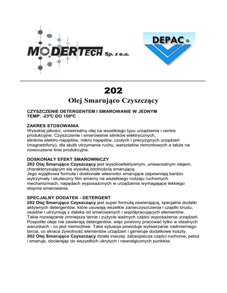 202 Olej Smarująco Czyszczący CZYSZCZENIE DETERGENTEM I SMAROWANIE W JEDNYM TEMP. -23ºC DO 150ºC ZAKRES STOSOWANIA Wysokiej jakości, uniwersalny olej na wszelkiego typu urządzenia i centra produkcyjne. Czyszczenie i smarowanie silników elektrycznych, silników elektro-napędów, mikro napędów, czułych i precyzyjnych urządzeń (magnetofony), dla słuŜb utrzymania ruchu, warsztatów remontowych a takŜe na nowoczesne linie produkcyjne. DOSKONAŁY EFEKT SMAROWNICZY 202 Olej Smarująco Czyszczący jest wysokoefektywnym, uniwersalnym olejem, charakteryzującym się wysoką zdolnością smarującą. Jego wyjątkowa formuła i doskonałe własności smarujące zapewniają bardzo wytrzymały i skuteczny film smarny na wszelkiego rodzaju ruchomych mechanizmach, napędach wyposaŜonych w urządzenia wymagające lekkiego stopnia smarowania. SPECJALNY DODATEK - DETERGENT 202 Olej Smarująco Czyszczący jest super formułą zawierającą, specjalne dodatki aktywnych detergentów, które usuwają wszelkie zanieczyszczenia i cząstki brudu, osadów i utrzymują z daleka od smarowanych i współpracujących elementów. Takie rozwiązanie zmniejsza tarcie i zuŜycie waŜnych części wyposaŜenia urządzeń. Pospolite oleje nie zawierają detergentów, więc powinny pracować tylko w idealnych warunkach - co jest niemoŜliwe. Taka sytuacja powoduje wytwarzanie nadmiernego tarcia, co skraca Ŝywotność elementów urządzeń i generuje dodatkowe koszty. 202 Olej Smarująco Czyszczący działa inaczej: zabezpiecza części ruchome, pełza i smaruje, docierając do wszystkich ukrytych i newralgicznych punktów. SMARNOŚĆ I PENETRACJA 202 Olej Smarująco Czyszczący jest wysokiej jakości olejem lekkim z doskonałą wytrzymałością na wysokie obciąŜenia. Nie dochodzi do zaniku filmu smarnego jak w przypadku zwykłych olejów. Bardzo szybko penetruje w ciasne tolerancje i pozostawia ładunek warstwy smarnej, który jest bardziej efektywny od wszelkich zwykłych olejów. CHARAKTERYSTYKA FIZYKOCHEMICZNA Kolor Dodatki Zakres temp. Punkt zapłonu Punkt płynięcia Lepkość w temp. 50ºC Na bazie ropy naftowej Wodoodporność śółty Czynnik czyszczący - detergent - 23ºC do 150ºC 144 ºC - 30ºC 10 cSt. tak dobra ZALETY Dodatek detergentów dla lepszego efektu czyszczenia Specjalny mechanizm przenikania Z inhibitorem korozji dla lepszej ochrony antykorozyjnej Trwały film smarny Rozluźnianie skorodowanych elementów Uniwersalne zastosowanie Redukowanie hałasu WSKAZÓWKI Stosować przez szczotkowanie, rozpylenie (puszka aerozolu) lub urządzeniem ciśnieniowym i pozwolić przez 1-ną minutę na głębokie wniknięcie. W razie konieczności czynność powtórzyć. Trzymać w bezpiecznej odległości od smarowanych urządzeń w czasie eksploatacji. PRZYKŁADY ZASTOSOWAŃ czułe przyrządy mikro napędy przyrządy elektryczne silniki elektryczne łańcuchy łoŜyska wrzecion maszyny transportowe przyrządy pneumatyczne narzędzia pneumatyczne pompy dozujące przekładnie zawiesia linie produkcyjne łańcuchy napędowe pneumatyczne zawory regulacyjne DANE BEZPIECZEŃSTWA Smar na bazie oleju mineralnego, bez FCKW Aerozol: Ten produkt nie jest sklasyfikowany jako zagroŜenie dla uŜytkownika według ArbStoffV., Niemieckiej Federalnej Republiki. Płyn: Wdychanie nadmierne oparów i spoŜywanie produktu jest szkodliwe. Chronić oczy przed kontaktem. Przechowywać w miejscu niedostępnym dla dzieci. OPAKOWANIA Aerozol 400 ml Pojemniki 10, 30, 60, 200 litrów Dane techniczne ustalone zostały w warunkach laboratoryjnych. Dane te powinny być uznawane jedynie jako ogólne informacje. Depac nie moŜe dać gwarancji bezpośrednich lub pośrednich dla konkretnych uŜyć danego produktu. JeŜeli zastosowanie nie jest zgodne z przeznaczeniem nie moŜe to być warunkiem do wymiany zakupionego produktu. Dystrybucja w Polsce: MODERTECH Sp. z o.o. 44-100 Gliwice ul. Biegusa 39 tel/fax 032 – 305 02 78