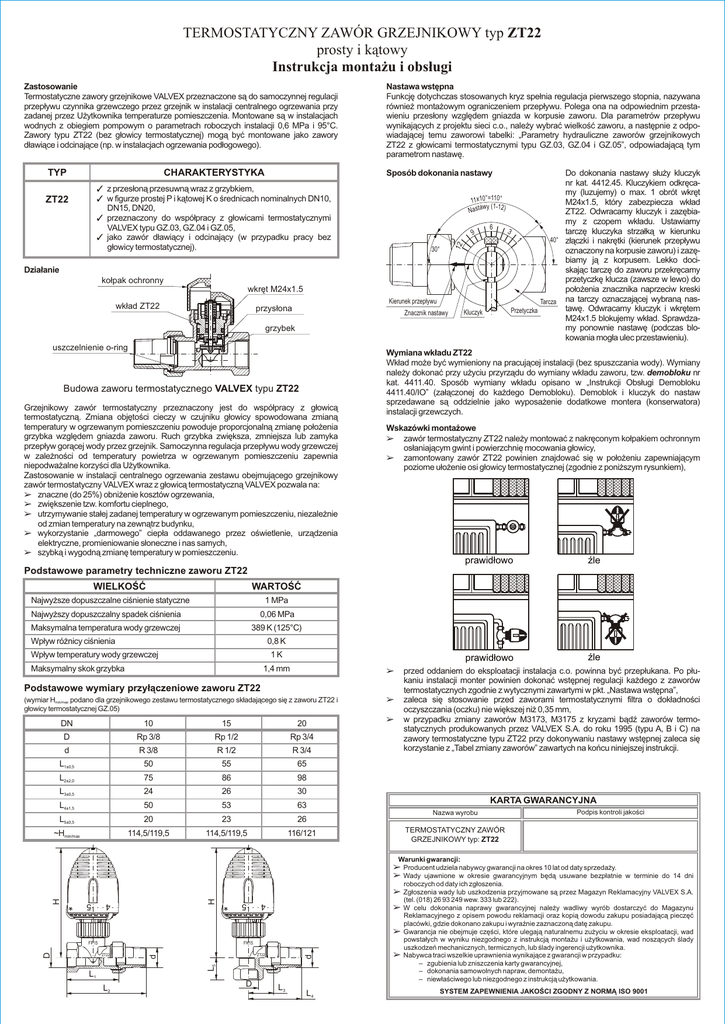 TERMOSTATYCZNY ZAWÓR GRZEJNIKOWY typ ZT22 prosty i k¹towy Instrukcja monta¿u i obs³ugi Zastosowanie Termostatyczne zawory grzejnikowe VALVEX przeznaczone s¹ do samoczynnej regulacji przep³ywu czynnika grzewczego przez grzejnik w instalacji centralnego ogrzewania przy zadanej przez U¿ytkownika temperaturze pomieszczenia. Montowane s¹ w instalacjach wodnych z obiegiem pompowym o parametrach roboczych instalacji 0,6 MPa i 95°C. Zawory typu ZT22 (bez g³owicy termostatycznej) mog¹ byæ montowane jako zawory d³awi¹ce i odcinaj¹ce (np. w instalacjach ogrzewania pod³ogowego). CHARAKTERYSTYKA Sposób dokonania nastawy ZT22 30° Dzia³anie kołpak ochronny wkręt M24x1.5 wkład ZT22 Kierunek przepływu przysłona Znacznik nastawy grzybek uszczelnienie o-ring Budowa zaworu termostatycznego VALVEX typu ZT22 Grzejnikowy zawór termostatyczny przeznaczony jest do wspó³pracy z g³owic¹ termostatyczn¹. Zmiana objêtoœci cieczy w czujniku g³owicy spowodowana zmian¹ temperatury w ogrzewanym pomieszczeniu powoduje proporcjonaln¹ zmianê po³o¿enia grzybka wzglêdem gniazda zaworu. Ruch grzybka zwiêksza, zmniejsza lub zamyka przep³yw gor¹cej wody przez grzejnik. Samoczynna regulacja przep³ywu wody grzewczej w zale¿noœci od temperatury powietrza w ogrzewanym pomieszczeniu zapewnia niepodwa¿alne korzyœci dla U¿ytkownika. Zastosowanie w instalacji centralnego ogrzewania zestawu obejmuj¹cego grzejnikowy zawór termostatyczny VALVEX wraz z g³owic¹ termostatyczn¹ VALVEX pozwala na: % znaczne (do 25%) obni¿enie kosztów ogrzewania, % zwiêkszenie tzw. komfortu cieplnego, % utrzymywanie sta³ej zadanej temperatury w ogrzewanym pomieszczeniu, niezale¿nie od zmian temperatury na zewn¹trz budynku, % wykorzystanie „darmowego” ciep³a oddawanego przez oœwietlenie, urz¹dzenia elektryczne, promieniowanie s³oneczne i nas samych, % szybk¹ i wygodn¹ zmianê temperatury w pomieszczeniu. Do dokonania nastawy s³u¿y kluczyk nr kat. 4412.45. Kluczykiem odkrêcamy (luzujemy) o max. 1 obrót wkrêt 11x10°=110° M24x1.5, który zabezpiecza wk³ad wy (1-12) Nasta ZT22. Odwracamy kluczyk i zazêbiamy z czopem wk³adu. Ustawiamy 6 3 tarczê kluczyka strza³k¹ w kierunku 9 40° z³¹czki i nakrêtki (kierunek przep³ywu oznaczony na korpusie zaworu) i zazêbiamy j¹ z korpusem. Lekko dociskaj¹c tarczê do zaworu przekrêcamy przetyczkê klucza (zawsze w lewo) do po³o¿enia znacznika naprzeciw kreski Tarcza na tarczy oznaczaj¹cej wybran¹ nastawê. Odwracamy kluczyk i wkrêtem Przetyczka Kluczyk M24x1.5 blokujemy wk³ad. Sprawdzamy ponownie nastawê (podczas blokowania mog³a ulec przestawieniu). 1 T z przes³on¹ przesuwn¹ wraz z grzybkiem, T w figurze prostej P i k¹towej K o œrednicach nominalnych DN10, DN15, DN20, T przeznaczony do wspó³pracy z g³owicami termostatycznymi VALVEX typu GZ.03, GZ.04 i GZ.05, T jako zawór d³awi¹cy i odcinaj¹cy (w przypadku pracy bez g³owicy termostatycznej). 12 TYP Nastawa wstêpna Funkcjê dotychczas stosowanych kryz spe³nia regulacja pierwszego stopnia, nazywana równie¿ monta¿owym ograniczeniem przep³ywu. Polega ona na odpowiednim przestawieniu przes³ony wzglêdem gniazda w korpusie zaworu. Dla parametrów przep³ywu wynikaj¹cych z projektu sieci c.o., nale¿y wybraæ wielkoœæ zaworu, a nastêpnie z odpowiadaj¹cej temu zaworowi tabelki: „Parametry hydrauliczne zaworów grzejnikowych ZT22 z g³owicami termostatycznymi typu GZ.03, GZ.04 i GZ.05”, odpowiadaj¹c¹ tym parametrom nastawê. Wymiana wk³adu ZT22 Wk³ad może byæ wymieniony na pracuj¹cej instalacji (bez spuszczania wody). Wymiany nale¿y dokonaæ przy u¿yciu przyrz¹du do wymiany wk³adu zaworu, tzw. demobloku nr kat. 4411.40. Sposób wymiany wk³adu opisano w „Instrukcji Obs³ugi Demobloku 4411.40/IO” (za³¹czonej do ka¿dego Demobloku). Demoblok i kluczyk do nastaw sprzedawane s¹ oddzielnie jako wyposa¿enie dodatkowe montera (konserwatora) instalacji grzewczych. Wskazówki monta¿owe % zawór termostatyczny ZT22 nale¿y montowaæ z nakrêconym ko³pakiem ochronnym os³aniaj¹cym gwint i powierzchniê mocowania g³owicy, % zamontowany zawór ZT22 powinien znajdowaæ siê w po³o¿eniu zapewniaj¹cym poziome u³o¿enie osi g³owicy termostatycznej (zgodnie z poni¿szym rysunkiem), prawidłowo źle prawidłowo źle Podstawowe parametry techniczne zaworu ZT22 WIELKOŚĆ WARTOŚĆ Najwy¿sze dopuszczalne ciœnienie statyczne 1 MPa Najwy¿szy dopuszczalny spadek ciœnienia 0,06 MPa Maksymalna temperatura wody grzewczej 389 K (125°C) Wp³yw ró¿nicy ciœnienia 0,8 K Wp³yw temperatury wody grzewczej 1K Maksymalny skok grzybka 1,4 mm % przed oddaniem do eksploatacji instalacja c.o. powinna byæ przep³ukana. Po p³ukaniu instalacji monter powinien dokonaæ wstêpnej regulacji ka¿dego z zaworów termostatycznych zgodnie z wytycznymi zawartymi w pkt. „Nastawa wstêpna”, zaleca siê stosowanie przed zaworami termostatycznymi filtra o dok³adnoœci oczyszczania (oczku) nie wiêkszej ni¿ 0,35 mm, w przypadku zmiany zaworów M3173, M3175 z kryzami b¹dŸ zaworów termostatycznych produkowanych przez VALVEX S.A. do roku 1995 (typu A, B i C) na zawory termostatyczne typu ZT22 przy dokonywaniu nastawy wstêpnej zaleca siê korzystanie z „Tabel zmiany zaworów” zawartych na koñcu niniejszej instrukcji. Podstawowe wymiary przy³¹czeniowe zaworu ZT22 (wymiar Hmin/max podano dla grzejnikowego zestawu termostatycznego sk³adaj¹cego siê z zaworu ZT22 i g³owicy termostatycznej GZ.05) DN 10 15 20 D Rp 3/8 Rp 1/2 Rp 3/4 d R 3/8 R 1/2 R 3/4 L1±0,5 50 55 65 L2±2,0 75 86 98 L3±0,5 24 26 30 L4±1,5 50 53 63 L5±0,5 20 23 26 ~Hmin/max 114,5/119,5 114,5/119,5 116/121 % % KARTA GWARANCYJNA Nazwa wyrobu Podpis kontroli jakości TERMOSTATYCZNY ZAWÓR GRZEJNIKOWY typ: ZT22 Warunki gwarancji: % Producent udziela nabywcy gwarancji na okres 10 lat od daty sprzedaży. % Wady ujawnione w okresie gwarancyjnym będą usuwane bezpłatnie w terminie do 14 dni roboczych od daty i