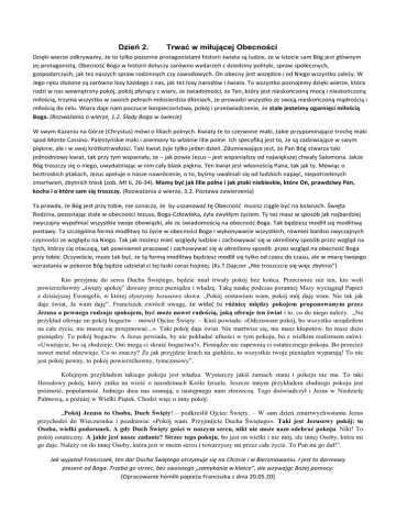 Dzień 2. Trwać w miłującej Obecności Dzięki wierze odkrywamy, że to tylko pozornie protagonistami historii świata są ludzie, że w istocie sam Bóg jest głównym jej protagonistą. Obecność Boga w historii dotyczy zarówno wydarzeń z dziedziny polityki, spraw społecznych, gospodarczych, jak też naszych spraw rodzinnych czy zawodowych. On obecny jest wszędzie i od Niego wszystko zależy. W Jego ręku złożone są zarówno losy każdego z nas, jak też losy narodów i świata. To wszystko poznajemy dzięki wierze, która rodzi w nas wewnętrzny pokój, pokój płynący z wiary, ze świadomości, że Ten, który jest nieskończoną mocą i nieskończoną miłością, trzyma wszystko w swoich pełnych miłosierdzia dłoniach, że prowadzi wszystko ze swoją nieskończoną mądrością i miłością do celu. Wiara daje nam poczucie bezpieczeństwa, pokój i przeświadczenie, że stale jesteśmy ogarnięci miłością Boga. (Rozważania o wierze, 1.2. Ślady Boga w świecie) W swym Kazaniu na Górze [Chrystus] mówi o liliach polnych. Kwiaty te to czerwone maki, takie przypominające trochę maki spod Monte Cassino. Palestyńskie maki i anemony to właśnie lilie polne. Ich specyfiką jest to, że są zadziwiające w swym pięknie, ale i w swej krótkotrwałości. Taki kwiat żyje tylko jeden dzień. Zdumiewające jest, że Pan Bóg stwarza taki jednodniowy kwiat, tak przy tym wspaniały, że – jak powie Jezus – jest wspanialszy od największej chwały Salomona. Jakże Bóg troszczy się o niego, uwydatniając w nim cały blask piękna. Ten kwiat jest własnością Pana, tak jak ty. Mówiąc o beztroskich ptakach, Jezus apeluje o nasze nawrócenie, o to, byśmy uwalniali się od ludzkich napięć, niepotrzebnych zmartwień, zbytnich trosk (zob. Mt 6, 26-34). Mamy być jak lilie polne i jak ptaki niebieskie, które On, prawdziwy Pan, kocha i o które sam się troszczy. (Rozważania o wierze, 3.2. Postawa zawierzenia) Ta prawda, że Bóg jest przy tobie, nie oznacza, że by uszanować tę Obecność musisz ciągle być na kolanach. Święta Rodzina, pozostając stale w obecności Jezusa, Boga-Człowieka, żyła zwykłym życiem. Ty też masz w sposób jak najbardziej zwyczajny wypełniać wszystkie swoje obowiązki, ale ze świadomością na obecność Boga. Tak będziesz modlił się modlitwą postawy. Ta szczególna forma modlitwy to życie w obecności Boga i wykonywanie wszystkich, również bardzo zwyczajnych czynności ze względu na Niego. Tak jak możesz mieć względy ludzkie i zachowywać się w określony sposób przez wzgląd na tych, którzy cię otaczają, tak powinieneś pracować i zachowywać się w określony sposób przez wzgląd na obecność Boga przy tobie. Oczywiście, może tak być, że tą formą modlitwy będziesz modlił się tylko od czasu do czasu, ale w miarę twojego wzrastania w pokorze Bóg będzie udzielał ci tej łaski coraz hojniej. (Ks.T.Dajczer „Nie troszczcie się więc zbytnio”) Kto przyjmie do serca Ducha Świętego, będzie miał trwały pokój bez końca. Przeciwnie niż ten, kto woli powierzchowny „święty spokój” dawany przez pieniądze i władzę. Taką naukę podczas porannej Mszy wyciągnął Papież z dzisiejszej Ewangelii, w której słyszymy Jezusowe słowa: „Pokój zostawiam wam, pokój mój daję wam. Nie tak jak daje świat, Ja wam daję”. Franciszek zwrócił uwagę, że widać tu różnicę między pokojem proponowanym przez Jezusa a pewnego rodzaju spokojem, być może nawet radością, jaką oferuje ten świat i to, co do niego należy. „Na przykład oferuje on pokój bogactw – mówił Ojciec Święty. – Ktoś powiada: «Odczuwam pokój, bo wszystko urządziłem na całe życie, nie muszę się przejmować...». Taki pokój daje świat. Nie martwisz się, nie masz kłopotów, bo masz dużo pieniędzy. To pokój bogactw. A Jezus powiada, by nie pokładać ufności w tym pokoju, bo z wielkim realizmem mówi: «Uważajcie, bo są złodzieje. Oni mogą ci skraść bogactwa!». Pieniądze nie zapewnią ci ostatecznego pokoju. Bo przecież nawet metal rdzewieje. Co to znaczy? Że jak przyjdzie krach na giełdzie, to wszystkie twoje pieniądze wyparują! To nie jest pokój pewny, to pokój powierzchowny, tymczasowy”. Kolejnym przykładem takiego pokoju jest władza. Wystarczy jakiś zamach stanu i pokoju nie ma. To taki Herodowy pokój, który znika na wieść o narodzinach Króla Izraela. Jeszcze innym przykładem złudnego pokoju jest próżność, popularność. Jednego dnia nas szanują, a następnego nam złorzeczą. Tego doświadczył i Jezus w Niedzielę Palmową, a później w Wielki Piątek. Chodzi więc o inny pokój: „Pokój Jezusa to Osoba, Duch Święty! – podkreślił Ojciec Święty. – W sam dzień zmartwychwstania Jezus przychodzi do Wieczernika i pozdrawia: «Pokój wam. Przyjmijcie Ducha Świętego». Taki jest Jezusowy pokój: to Osoba, wielki podarunek. A gdy Duch Święty gości w naszym sercu, nikt nie może nam odebrać pokoju. Nikt! To pokój ostateczny. A jakie jest nasze zadanie? Strzec tego pokoju, bo jest on wielki i nie mój, ale innej Osoby, która mi go daje. Należy on do innej Osoby, która jest w moim sercu i towarzyszy mi przez całe życie. To Pan mi go dał!”. Jak wyjaśnił Franciszek, ten dar Ducha Świętego otrzymuje się na Chrzcie i w Bierzmowaniu. I jest to darmowy prezent od Boga. Trzeba go strzec, bez swoistego „zamykania w klatce”, ale wzywając Bożej pomocy: (Opracowanie homilii papieża Franciszka z dnia 20.05.20]