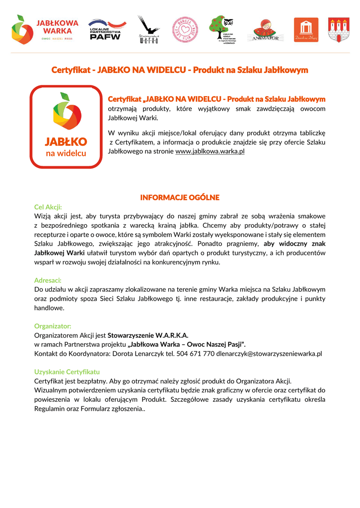 Certyfikat - JABŁKO NA WIDELCU - Produkt na Szlaku Jabłkowym Certyfikat „JABŁKO NA WIDELCU - Produkt na Szlaku Jabłkowym otrzymają produkty, które wyjątkowy smak zawdzięczają owocom Jabłkowej Warki. JABŁKO na widelcu W wyniku akcji miejsce/lokal oferujący dany produkt otrzyma tabliczkę z Certyfikatem, a informacja o produkcie znajdzie się przy ofercie Szlaku Jabłkowego na stronie www.jablkowa.warka.pl INFORMACJE OGÓLNE Cel Akcji: Wizją akcji jest, aby turysta przybywający do naszej gminy zabrał ze sobą wrażenia smakowe z bezpośredniego spotkania z warecką krainą jabłka. Chcemy aby produkty/potrawy o stałej recepturze i oparte o owoce, które są symbolem Warki zostały wyeksponowane i stały się elementem Szlaku Jabłkowego, zwiększając jego atrakcyjność. Ponadto pragniemy, aby widoczny znak Jabłkowej Warki ułatwił turystom wybór dań opartych o produkt turystyczny, a ich producentów wsparł w rozwoju swojej działalności na konkurencyjnym rynku. Adresaci: Do udziału w akcji zapraszamy zlokalizowane na terenie gminy Warka miejsca na Szlaku Jabłkowym oraz podmioty spoza Sieci Szlaku Jabłkowego tj. inne restauracje, zakłady produkcyjne i punkty handlowe. Organizator: Organizatorem Akcji jest Stowarzyszenie W.A.R.K.A. w ramach Partnerstwa projektu „Jabłkowa Warka – Owoc Naszej Pasji”. Kontakt do Koordynatora: Dorota Lenarczyk tel. 504 671 770 [email protected] Uzyskanie Certyfikatu Certyfikat jest bezpłatny. Aby go otrzymać należy zgłosić produkt do Organizatora Akcji. Wizualnym potwierdzeniem uzyskania certyfikatu będzie znak graficzny w ofercie oraz certyfikat do powieszenia w lokalu oferującym Produkt. Szczegółowe zasady uzyskania certyfikatu określa Regulamin oraz Formularz zgłoszenia.. REGULAMIN UZYSKIWANIA CERTYFIKATU „PRODUKT NA SZLAKU JABŁKOWYM” DOKONANIE ZGŁOSZENIA 1. Warunki podstawowe: A. Aby zgłosić produkt należy posiadać go w bieżącej ofercie detalicznej na terenie Gminy Warka. B. Produkt w swoim składzie powinien mieć wśród głównych składników jabłka a jego receptura powinna być określona tj. stała. C. W ofercie właściciela produktu, opisującej produkt, powinna znaleźć się informacja, że w jego składzie są jabłka z wareckich sadów. 2. Przesłanie zgłoszenia A. Zgłoszenia należy dokonać na formularzu stanowiącym załącznik nr 2 B. Wypełniony formularz należy przesłać na adres Organizatora Akcji [email protected] C. Terminy nadsyłania zgłoszeń: - do 20 lutego 2017r. - do 20 marca 2017r. 1. 2. 3. 4. KWALIFIKACJA DO CERTYFIKATU Po otrzymaniu zgłoszeń Organizator Akcji potwierdza zgodę na uzyskanie certyfikatu Organizator przesyła – w formie pliku, znak graficzny jakim powinien być opatrzony produkt w karcie dań/ofercie sprzedaży oraz identyfikację wizualną jaką należy posługiwać się przy promowaniu produktu oraz uzgadnia z właścicielem produktu, sposób wykorzystania znaku. Organizator przekaże w formie dyplomu - do powieszenia w lokalu, Certyfikat „Produkt Szlaku Jabłkowego” Certyfikat obowiązuje dopóki spełnione są jego zasady. OBOWIĄZKI WŁAŚCICIELA PRODUKTU 1. Znak graficzny „Jabłkowa Warka” należy zamieścić w informacji dla klientów np.: w karcie dań - w przypadku produktu restauracji/kawiarni, w informacji o produkcie umieszczonej w widocznym miejscu punktu sprzedaży – w przypadku punktów handlowych lub zakładów produkcyjnych Informacja powinna być tak sformułowana, aby turysta rozpoznawał znak graficzny Jabłkowej Warki oraz uzyskał informację, że produkt jest elementem Szlaku Jabłkowego. W przypadku karty dań może to być np. przypis wyjaśniający, a w przypadku produktu w sklepie czy punkcie produkcyjnym może to być informacja powieszona np. na ścianie wewnątrz lokalu. Organizatorom akcji zależy, aby znak Jabłkowej Warki stał się widocznym elementem w miejscach, gdzie można nabyć produkt i stanowił przez to znak rozpoznawczy. 2. Na potwierdzenie należy poinformować Organizatora w terminie 7 dni od otrzymania znaku graficznego o sposobie jego wyeksponowania. ZGŁOSZENIE PRODUKTU DO CERTYFIKATU DANE PODSTAWOWE Zgłaszający: Nazwa Imię i nazwisko osoby dokonującej zgłoszenia e-mail kontaktowy Telefon kontaktowy INFORMACJA O PRODUKCIE Nazwa produktu Nazwa ta będzie umieszczona na certyfikacie Krótka informacja o produkcie, z którą będzie mógł się zapoznać turysta. Powinna zawierać informacje, że produkt zawiera wareckie jabłka oraz że jest elementem Szlaku Jabłkowego. Gdzie turysta będzie mógł znaleźć w lokalu informację o produkcie? Proszę podać czy będzie to np. karta dań, ulotka ofertowa wyłożona w widocznym miejscu, informacja tekstowa na ścianie itp. Oświadczam, że w promocji JABŁKO NA WIDELCU - Produktu na Szlaku Jabłkowym stosować będę identyfikację wizualną dostarczoną w wersji elektornicznej przez Organizatora Akcji Oświadczam, że jestem upoważniony/a do przekazania informacji dotyczących produktu (jeśli zgłoszenie podpisuje osoba nie będąca Właścicielem) Imię i nazwisko ………………………………………… Formularz prosimy przesłać na adres [email protected]