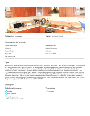 Kategorie: Na sprzedaż Cena: 165,000.00PLN, Zł Podstawowe informacje Dodane: 19/07/2016 Powierzchnia: 65 Działka: 0 Rodzaj: Mieszkania Status: Aktualne Pokoje: 2 Piętro: 2.0 Cena za m²: 2687 Pow. Uż: 65,12m² Opis: Numer oferty : 395 Biuro Nieruchomości Optima oferuje Państwu przestronne mieszkanie. Lokal znajduje się w budynku wielorodzinnym na 2 piętrze. Powierzchnia wynosi 65,12m2 a w jej skład wchodzą : przedpokój z garderobą, kolejny przestronny korytarz, łazienka z wanną i WC, sypialnia oraz salon z aneksem kuchennym. Istnieje możliwość wydzielenia dodatkowej sypialni bez okna. Z okien rozpościera się widok na Panoramę Karkonoszy. Mieszkanie nie wymaga nakładów finansowych, jest gotowe do wprowadzenia. Okna PCV, na podłogach położone są panele oraz w łazience i pierwszym przedpokoju płytki. Miesięczny czynsz w wysokości 460 zł i zawiera opłaty za : ogrzewanie, ciepłą wodę, fundusz remontowy oraz koszty eksploatacyjne! Niskie koszty utrzymania, rocznie zwrot zaliczki za ogrzewanie w wysokości 1000 zł. W cenie pozostają meble kuchenne, łazienkowe oraz szafa w zabudowie. Do mieszkania przynależy piwnica (1,68m2). Budynek zadbany, zarządzany przez wspólnotę, teren wokół budynku jest ogrodzony oraz monitorowany. cena 165 000 zł zapraszam na prezentacje Klaudia Zakrzewska tel 667 418 979 Szczegóły: Dodatkowe informacje: Piwnica pełna własność ogrodzona posesja Gotowe do wprowadzenia! Powered by TCPDF (www.tcpdf.org) Wyposażenie: Okna PCV
