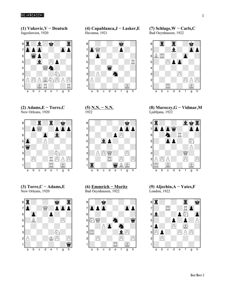 Dejascacchi 1 (1) Vukovic,V Deutsch Jugoslawien, 1920 + (4) Capablanca,J Lasker,E Havanna, 1921 + + (7) Schlage,W Carls,C Bad Oeynhausen, 1922 + + + !"#$%&'()* + + + Q+ + + + + + + + + + + + + + + + + + + + + + + + !"#$%&'()* + + !"#$%&'()* (2) Adams,E Torre,C (5) N.N. N.N. (8) Maroczy,G + + + + + + + + + + + + + Q + + + + + + New Orleans, 1920 + + + + + + + + + Ljubljana, 1922 + + + Vidmar,M (3) Torre,C (6) Emmrich Moritz (9) Aljechin,A + + + Adams,E New Orleans, 1920 + + +Q+ + + + + + + + + + + + + + + + + + + + + !"#$%&'()* + + + + + + + + + + !"#$%&'()* + + + + + + + + + + + + + + + + + + !"#$%&'()* Q + + + + + + + + + + + + + + + + + + +Q+ + + !"#$%&'()* + + 1922 + + + + + + + + Q+ Bad Oeynhausen, 1922 + + + London, 1922 + + + + + + Q+ + + + + + + + + + + !"#$%&'()* + + Yates,F + + + + + + + + + + + + + + + + + + + !"#$%&'()* Best Move 3 Dejascacchi (10) N.N. 2 N.N. (13) Gutu 1922 Wechsler (16) Wolf,H Bukarest, 1923 + + + + + + + + + + + + + + + + + + + + + + + + + !"#$%&'()* (11) Aljechin,A N.N. Antwerpen, 1923 + + + + + + + + + + + + + + + + + + + + + + + + + + + + + + + + + + + Q + + + + !"#$%&'()* + + Q + + + !"#$%&'()* (14) Aljechin,A Rubinstein,A (17) Nenarokov,V Grigoriev,N Karlsbad, 1923 + Spielmann,R Mährisch Ostrau, 1923 Moskau, 1923 + + + + + + + + + + + + + +Q+ + + + + + + + !"#$%&'()* + + Q+ + + + + + + + + + + + + + + + + !"#$%&'()* + + + + + + + + + + + !"#$%&'()* (12) Aljechin,A (15) Bogoljubow,E (18) Sherbashin Menzel Boston, 1923 + +Q+ + + + + + + + + + + + + + + + + + + + + + !"#$%&'()* + Reti,R Karlsbad, 1923 + + + + + + + + + + Q + + + + + + + + + + + + + + !"#$%&'()* + + + + + + + + + + + + + + + + Sozin Novgorod, 1923 + + + + +Q+ + + + + + + + + + + + + + + !"#$%&'()* Best Move 3 Dejascacchi (19) Gilg,K 3 Lamprecht,K Karbitz, 1924 (22) Torré,C N.N. (25) Reti,R + New York, 1924 + + + + + + + + + + + + + + + + + + + + + + + + + + +Q !"#$%&'()* (20) Löwenfisch,G Gotthilf,S Bogoljubow,E + New York, 1924 + + + + + + + + + + + + + + + + + !"#$%&'()* (23) Yates,F (26) N.N. + New York, 1924 + + + Reti,R + + + + + +Q+ + + + + + + + + + + + + + !"#$%&'()* + + + N.N. 1925 Leningrad, 1924 + + + + + + + Q + + + + + + + + + + + + + + + !"#$%&'()* (21) Capablanca,J Tartakower,S + + + + + + + + + + + + + + + + + + + + + + + + + + + + + + + + + + +Q + + !"#$%&'()* + + + + !"#$%&'()* (24) Aljechin,A (27) Euwe,M Freeman New York, 1924 + + + + + + Amsterdam, 1925 + + Davidson,J New York, 1924 + + + + + + + + + + + + + + + + + + + + + + + + !"#$%&'()* + + + + + + + + + + + Q + + + + + + + + + + + + !"#$%&'()* + + + + + + + + + + + + + + + + + + + + + + +Q+ !"#$%&'()* Best Move 3 Dejascacchi 4 (28) Mattison,H Vukovic,V (31) Ilyin Zhenevsky,A Kubbel Debrecen, 1925 + (34) Janowski,D Sämisch,F Leningrad, 1925 + + + + + + + + + + + + + + + +Q + + + + + + + + + !"#$%&'()* + + + + + + + + + Q + + + + + !"#$%&'()* (29) Aljechin,A Lommer,H (32) Löwenfisch,G Freiman,S Genf, 1925 + + + + Marienbad, 1925 + + + + + + + + + + + + + + Q + + + + + + !"#$%&'()* (35) Tartakower,S Marienbad, 1925 Yates,F Leningrad, 1925 + + + + + + + +Q + + + !"#$%&'()* (30) Verlinsky,B Rabinovich,I (33) Janowski,D Grünfeld,E (36) Torre Repetto,C Lasker,E Leningrad, 1925 Marienbad, 1925 Moskau, 1925 + + + + + + + + + + + + Q + + + + + + + + + + + + + + !"#$%&'()* + + + + + + + + + + + + + + + + + + + + + !"#$%&'()* + Q + + + + + + + + +Q + + + + + + + + + + + + + + + + !"#$%&'()* + + + + + + + + + + + + + + + + + + + + + + + + + + + + + + + + + !"#$%&'()* + + + + + + + + + + + + + + + + Q + + + + !"#$%&'()* Best Move 3 Dejascacchi 5 (37) Bohatirchuk,F Capablanca,J (40) Aljechin,A Colle,E Paris, 1925 (43) N.N. N.N. 1926 Moskau, 1925 + + + + + + + + + + + + + + + + + + + Q + + + + !"#$%&'()* (38) Popov Rjumin,N Moskau, 1925 + + + + + + + + Q+ + + + + + + + + + + + + + + + !"#$%&'()* + + + + + + + + + + + + Q + + + + + + + + !"#$%&'()* (41) Opocensky,K Aljechin,A (44) Aljechin,A Molina,J Buenos Aires, 1926 Paris, 1925 + + + + + + + + + + + + + + + + + + + + + + + + + + + + + + + +Q + + + + Q+ + + + + + + + + + + + + Q + + !"#$%&'()* + + + !"#$%&'()* + + + !"#$%&'()* (39) Torre,C Dus Chotimirsky,F (42) Marshall,F Grünfeld,E (45) Oraevsky Moskau, 1925 Moskau, 1925 + + + + + + + + + + + + + + + Q+ + + + + + !"#$%&'()* + + + + Q + + + + + + + + + + + + + + + + !"#$%&'()* + Bubnov Fernpartie, 1926 + + + + + + + + + + + + + + + Q + + + + + + + + !"#$%&'()* Best Move 3 Dejascacchi 6 (46) Mattison Millers Karalauci, 1926 (49) Balk Barnes (52) N.N. + Neuseeland, 1926 + + + !"#$%&'()* + + + + + + + + + + + + + + + + +Q + !"#$%&'()* (47) Spencer,E Borovsky,E (50) Kmoch,H Rubinstein,A + + + + + + + + + + + + + + + Znosko Liverpool, 1926 + + + + + + + + + + + + + + + + + + + + + + + + + + + + + + + + + + !"#$%&'()* (53) N.N. N.N. 1927 Semmering, 1926 + + + + + + + N.N. 1927 + + + + Q + + !"#$%&'()* (48) Piotrowski Tannenbaum + + + + + + + + + + + Q + + + + + + + + + + + + !"#$%&'()* + + + + + !"#$%&'()* (51) Spielmann,R (54) Szekely,J Wahle,V Wien, 1926 + + + + + + + + + + + + + + + + + Becs, 1927 Jungwirth Lvov, 1926 + Q + + + + + + + + + + + + + + + + + + + + + !"#$%&'()* + + + + + + + + + + + Q+ + + + + + + + + + + + !"#$%&'()* + + + + + + + + + + + + + + +Q+ + + + + + + + !"#$%&'()* Best Move 3 Dejascacchi 7 (55) Sämisch,F Reimann Bremen, 1927 (58) Przepiorka,D Ahues,C (61) Schonmann,W Schmitt,L Kecskemet, 1927 + + + + + + + + + + + + + + + + + +Q+ + + !"#$%&'()* (56) Capablanca,J Aljechin,A Magdeburg, 1927 + + + + + + + + Q + + + + + + + + + + + + + + + + + + + + + + !"#$%&'()* + + + + + + + + + + !"#$%&'()* (59) Yates,F (62) Gudin Aljechin,A Kecskemet, 1927 + + + + + Bogdanovsky Paris, 1927 Buenos Aires, 1927 + + + + + + + + + + + + + + + + +Q+ + + + + + + + + + !"#$%&'()* (57) Aljechin,A Kecskemet, 1927 Asztalos,L + + + + + + + + + + + + + + + + + + Q + + + + + + + + + + !"#$%&'()* (60) Rubinstein,A Hirschbein + + + + + + + + + + + + + + + +Q+ !"#$%&'()* (63) Euwe,M Yates,F + + Bad Kissingen, 1928 Lodz, 1927 + + + + 