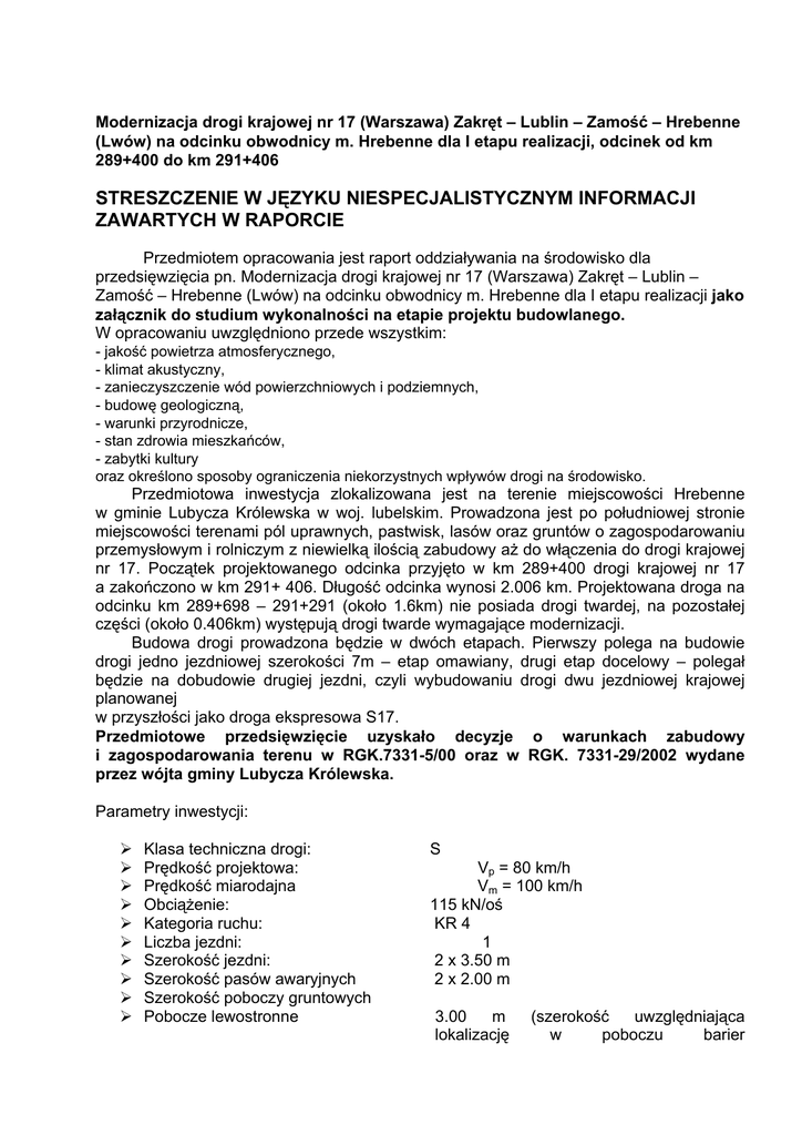 Modernizacja drogi krajowej nr 17 (Warszawa) Zakręt – Lublin – Zamość – Hrebenne (Lwów) na odcinku obwodnicy m. Hrebenne dla I etapu realizacji, odcinek od km 289+400 do km 291+406 STRESZCZENIE W JĘZYKU NIESPECJALISTYCZNYM INFORMACJI ZAWARTYCH W RAPORCIE Przedmiotem opracowania jest raport oddziaływania na środowisko dla przedsięwzięcia pn. Modernizacja drogi krajowej nr 17 (Warszawa) Zakręt – Lublin – Zamość – Hrebenne (Lwów) na odcinku obwodnicy m. Hrebenne dla I etapu realizacji jako załącznik do studium wykonalności na etapie projektu budowlanego. W opracowaniu uwzględniono przede wszystkim: - jakość powietrza atmosferycznego, - klimat akustyczny, - zanieczyszczenie wód powierzchniowych i podziemnych, - budowę geologiczną, - warunki przyrodnicze, - stan zdrowia mieszkańców, - zabytki kultury oraz określono sposoby ograniczenia niekorzystnych wpływów drogi na środowisko. Przedmiotowa inwestycja zlokalizowana jest na terenie miejscowości Hrebenne w gminie Lubycza Królewska w woj. lubelskim. Prowadzona jest po południowej stronie miejscowości terenami pól uprawnych, pastwisk, lasów oraz gruntów o zagospodarowaniu przemysłowym i rolniczym z niewielką ilością zabudowy aż do włączenia do drogi krajowej nr 17. Początek projektowanego odcinka przyjęto w km 289+400 drogi krajowej nr 17 a zakończono w km 291+ 406. Długość odcinka wynosi 2.006 km. Projektowana droga na odcinku km 289+698 – 291+291 (około 1.6km) nie posiada drogi twardej, na pozostałej części (około 0.406km) występują drogi twarde wymagające modernizacji. Budowa drogi prowadzona będzie w dwóch etapach. Pierwszy polega na budowie drogi jedno jezdniowej szerokości 7m – etap omawiany, drugi etap docelowy – polegał będzie na dobudowie drugiej jezdni, czyli wybudowaniu drogi dwu jezdniowej krajowej planowanej w przyszłości jako droga ekspresowa S17. Przedmiotowe przedsięwzięcie uzyskało decyzje o warunkach zabudowy i zagospodarowania terenu w RGK.7331-5/00 oraz w RGK. 7331-29/2002 wydane przez wójta gminy Lubycza Królewska. Parametry inwestycji: Klasa techniczna drogi: Prędkość projektowa: Prędkość miarodajna Obciążenie: Kategoria ruchu: Liczba jezdni: Szerokość jezdni: Szerokość pasów awaryjnych Szerokość poboczy gruntowych Pobocze lewostronne S Vp = 80 km/h Vm = 100 km/h 115 kN/oś KR 4 1 2 x 3.50 m 2 x 2.00 m 3.00 m lokalizację (szerokość uwzględniająca w poboczu barier 2 Pobocze prawostronne Szerokość pasa postojowego • • Szerokość korony drogi Szerokość bez pasa postojowego Szerokość z pasem postojowym Skrajnia pionowa Nawierzchnia energochłonnych oraz słupów oświetleniowych), 1.25 m (szerokość uwzględniająca lokalizację w poboczu barier energochłonnych), 3.00 m (pas na odcinku od km 291+065 do km 291+406) zmienna następująco: 15.25 m 16.25 m 4.70 m beton asfaltowy Planowana inwestycja ma przyczynić się do: - zmniejszenia obciążenia ruchem centrum miejscowości – uspokojenie ruchu (zwiększenie przepustowości), - możliwości skoncentrowania ruchu ciężkich pojazdów z centrum na drogę przebiegającą przez mniej wrażliwe tereny (obwodnica, przejście graniczne), - skrócenia czasu podróży, poprawę płynności ruchu i zmniejszenia strat czasu, - zmniejszenia zużycia energii, kosztów ruchu i kosztów utrzymania drogi, - podwyższenia komfortu jazdy, - poprawy bezpieczeństwa ruchu użytkowników drogi – zmniejszenia wypadkowości przy optymalnych prędkościach i większej płynności, wykonanie barier energochłonnych, - zmniejszenia natężenia hałasu drogowego, zanieczyszczenia powietrza, gleb, wód w centrum m. Hrebenne, - lepszego eksponowania walorów przyrodniczych i historycznych obszaru, - stworzenie możliwości przypadkowych odkryć archeologicznych. W ramach realizacji inwestycji zostaną wykonane, zainstalowane i będą stosowane środki zapobiegające ponadnormatywnemu oddziaływaniu na środowisko. W ramach realizacji inwestycji przewidziano w szczególności: • W budynkach nr 76, 62, 67 i 2 wymianę okien na okna o zwiększonej izolacyjności • W nowowybudowanym budynku w km 290+850 (strona L) wymianę okien na okna o zwiększonej izolacyjności po wybudowaniu drogi i ustabilizowaniu się warunków ruchowych obiektu, jeśli analiza porealizacyjna wykaże przekroczenia wewnątrz budynku • W budynku nr 1 właściciel nie wyraził zgody na wymianę okien. W przypadku tego budynku po przeprowadzeniu analizy porealizacyjnej i stwierdzeniu przekroczeń natężeń hałasu komunikacyjnego należy ponownie zaproponować właścicielowi wymianę okien. • Odprowadzenie całości wód opadowych spływających z drogi do obustronnych szczelnych rowów (lub kanalizacji), skąd wody te po podczyszczeniu w separatorach typu SuperPEK zintegrowanych z piaskownikiem typu HEK-EN (6 sztuk) będą odprowadzane do istniejących cieków poprzecznych. • Odwodnienie drogi zaprojektowano w sposób umożliwiający przejęcie i usunięcie w bezpieczny sposób substancji toksycznych, które mogą się wydostać na jezdnię w wyniku katastrofy pojazdów wiozących niebezpieczne ładunki. • Dla zapewnienia migracji zwierząt z jednej strony drogi na drugą zaprojektowano przepust na początkowym odcinku przedmiotowej drogi (km 289+636) zespolony z przejściem dla małych i średnich zwierząt (4.09 x 2.57m). • Teren pod wiaduktem nad drogą nr 867 po obu stronach drogi pozostawiono w stanie istniejącym, przez co będzie pełnić funkcję przejścia dla zwierząt. 3 • Przełożenia cieków będą odzwierciedlały naturalne środowiska wodne. Skarpy cieków odarniono pasem szerokości 0.5m. Natomiast wyżej planuje się dokonać obsiewu skarp mieszankami nasion traw. • • • • • Zastosowano rozwiązania projektowe umożliwiające, aby dolina rzeki Prutnik po przeniesieniu kolizyjnego odcinka i wykonaniu wiaduktu (nad linią kolejową i drogą serwisową), mogła pełnić funkcj