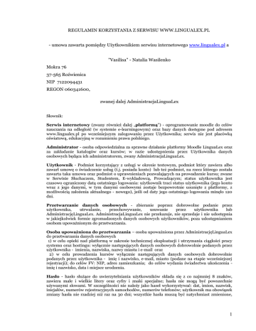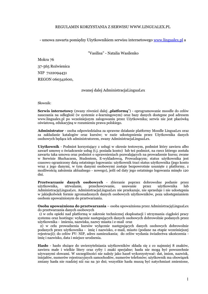 REGULAMIN KORZYSTANIA Z SERWISU WWW.LINGUALEX.PL - umowa zawarta pomiędzy Użytkownikiem serwisu internetowego www.lingualex.pl a ”Vasilisa” - Natalia Wasilenko Mokra 76 37-565 Roźwienica NIP 7122094431 REGON 060341600, zwanej dalej AdministracjaLinguaLex Słownik: Serwis internetowy (zwany również dalej „platformą”) - oprogramowanie moodle do celów nauczania na odległość (w systemie e-learningowym) oraz bazy danych dostępne pod adresem www.lingualex.pl po wcześniejszym zalogowaniu przez Użytkownika; serwis nie jest placówką oświatową, edukacyjną w rozumieniu prawa polskiego. Administrator - osoba odpowiedzialna za sprawne działanie platformy Moodle LinguaLex oraz za zakładanie katalogów oraz kursów; w razie udostępnienia przez Użytkownika danych osobowych będąca ich administratorem, zwany AdministracjaLinguaLex. Użytkownik - Podmiot korzystający z usługi w okresie testowym, podmiot który zawiera albo zawarł umowę o świadczenie usług (t.j. posiada konto) lub też podmiot, na rzecz którego została zawarta taka umowa oraz podmiot o uprawnieniach pozwalających na prowadzenie kursu; zwane w Serwisie Słuchaczem, Studentem, E-wykladowcą, Prowadzącym; status użytkownika jest czasowo ograniczony datą ostatniego logowania: użytkownik traci status użytkownika (jego konto wraz z jego danymi, w tym danymi osobowymi zostaje bezpowrotnie usunięte z platformy, z możliwością założenia aktualnego - nowego), jeśli od daty jego ostatniego logowania minęło 120 dni. Przetwarzanie danych osobowych - zbieranie poprzez dobrowolne podanie przez użytkownika, utrwalanie, przechowywanie, usuwanie przez użytkownika lub AdministracjęLinguaLex. AdministracjaLinguaLex nie przekazuje, nie sprzedaje i nie udostępnia w jakiejkolwiek formie zgromadzonych danych osobowych użytkowników, poza udostępnianiem osobom upoważnionym do przetwarzania. Osoba upoważniona do przetwarzania – osoba upoważniona przez AdministracjęLinguaLex do przetwarzania danych osobowych 1) w celu opieki nad platformą w zakresie technicznej eksploatacji i utrzymania ciągłości pracy systemu oraz hostingu: wyłącznie następujących danych osobowych dobrowolnie podanych przez użytkownika - imienia, nazwiska, nazwy miasta i e-mail oraz 2) w celu prowadzenia kursów wyłącznie następujących danych osobowych dobrowolnie podanych przez użytkownika - imię i nazwisko, e-mail, miasto (podane na etapie wcześniejszej rejestracji); do celów FV: NIP, adres zamieszkania; do celów wydania świadectwa ukończenia imię i nazwisko, data i miejsce urodzenia. Hasło - hasło służące do uwierzytelniania użytkowników składa się z co najmniej 8 znaków, zawiera małe i wielkie litery oraz cyfry i znaki specjalne; hasła nie mogą być powszechnie używanymi słowami. W szczególności nie należy jako haseł wykorzystywać: dat, imion, nazwisk, inicjałów, numerów rejestracyjnych samochodów, numerów telefonów; użytkownik ma obowiązek zmiany hasła nie rzadziej niż raz na 30 dni; wszystkie hasła muszą być natychmiast zmienione, 1 jeśli istnieje podejrzenie, że zostały odkryte lub wiadomo, że znajdują się w posiadaniu osoby innej niż autoryzowani użytkownicy. AdministracjaLinguaLex nie ponosi odpowiedzialności za skutki wynikłe z ujawnienia hasła do konta osobom trzecim, niezależnie od przyczyny jego ujawnienia. Regulamin wydany został na podstawie art. 8 ust. 1 ustawy z dnia 18 lipca 2002 r. o świadczeniu usług drogą elektroniczną. 1. Zakładając konto i dokonując logowania do serwisu internetowego Użytkownik w pełni akceptuje niniejsze warunki bez jakichkolwiek zastrzeżeń. W szczególności, Użytkownik wyraża zgodę na zamieszczenie danych osobowych w bazie www.lingualex.pl i przetwarzanie ich w celu nauczania na platformie. Administratorem danych osobowych w rozumieniu ustawy z dnia 29 sierpnia 1997 r. o ochronie danych osobowych (tj. Dz.U. z 2002 roku, nr 101, poz. 926 z późn. zm.) jest Natalia Wasilenko „Vasilisa” Mokra 76 37-565 Roźwienica. Dane osobowe mogą być udostępnione osobom upoważnionym w celu technicznej opieki nad platforma lub prowadzenia kursów. Podanie danych osobowych jest dobrowolne. 2. Zawarcie umowy o świadczenie usług (założenie konta) poprzedzone jest rejestracją. 3. Rozpoczęcie świadczenia usługi na rzecz Użytkownika następuje niezwłocznie: w przypadku kursów bezpłatnych i testowych– po akceptacji formularza rejestracyjnego, o czym Użytkownik zostanie poinformowany na adres e-mail wskazany w formularzu rejestracyjnym; - w przypadku kursów płatnych – po wpłacie; w przypadku Prowadzących – zgodnie z pkt. 12 Regulaminu. 4. Uzyskanie konta jest jednoznaczne ze zgodą na przetwarzanie danych osobowych Użytkownika w zakresie koniecznym do obsługi platformy Moodle przez AdministracjęLinguaLex oraz Osobę upoważnioną do przetwarzania w celu informatycznej opieki nad platformą, hostingu lub prowadzenia kursów, którzy są uprawnieni do przetwarzania danych osobowych w rozumieniu ustawy z dnia 29 sierpnia 1997 roku o ochronie danych osobowych (Dz. U. z 2002 roku Nr 101, poz. 926 z późn. zm.) w związku ze świadczeniem usług i w tym zakresie ich obowiązki i prawa kształtowane będą przez tę ustawę z zastrzeżeniem modyfikacji zawartych w ustawie z dnia 18 lipca 2002 roku o świadczeniu usług drogą elektroniczną (Dz. U. z 2002 roku Nr 144 poz. 1204). Zakres przetwarzanych danych osobowych w przypadku rejestracji na platformie bez podjęcia nauki na kursach lub w razie podjęcia bezpłatnej nauki (test próbny) oraz w razie prowadzenia kursów, w tym jako osoba prawna lub przedsiębiorca: imię i nazwisko, e-mail, miasto. Zakres przetwarzanych danych osobowych w przypadku podjęcia odpłatnej nauki na kursach po rejestracji: imię i nazwisko, e-mail, miasto (podane na etapie wcześniejszej rejestracji); do celów FV: NIP, adres zamieszkania. Zakres przetwarzanych danych osobowych w 