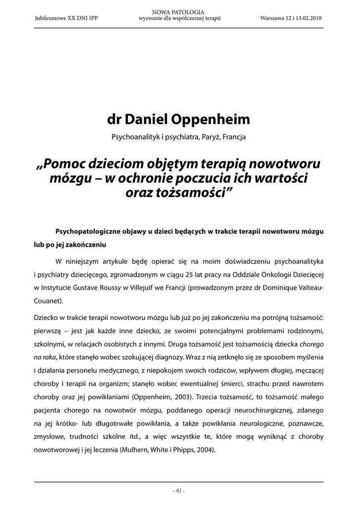 Jubileuszowe XX DNI IPP NOWA PATOLOGIA wyzwanie dla współczesnej terapii Warszawa 12 i 13.02.2010 dr Daniel Oppenheim Psychoanalityk i psychiatra, Paryż, Francja „Pomoc dzieciom objętym terapią nowotworu mózgu – w ochronie poczucia ich wartości oraz tożsamości” Psychopatologiczne objawy u dzieci będących w trakcie terapii nowotworu mózgu lub po jej zakończeniu W niniejszym artykule będę opierać się na moim doświadczeniu psychoanalityka i psychiatry dziecięcego, zgromadzonym w ciągu 25 lat pracy na Oddziale Onkologii Dziecięcej w Instytucie Gustave Roussy w Villejuif we Francji (prowadzonym przez dr Dominique ValteauCouanet). Dziecko w trakcie terapii nowotworu mózgu lub już po jej zakończeniu ma potrójną tożsamość: pierwszą – jest jak każde inne dziecko, ze swoimi potencjalnymi problemami rodzinnymi, szkolnymi, w relacjach osobistych z innymi. Druga tożsamość jest tożsamością dziecka chorego na raka, które stanęło wobec szokującej diagnozy. Wraz z nią zetknęło się ze sposobem myślenia i działania personelu medycznego, z niepokojem swoich rodziców, wpływem długiej, męczącej choroby i terapii na organizm; stanęło wobec ewentualnej śmierci, strachu przed nawrotem choroby oraz jej powikłaniami (Oppenheim, 2003). Trzecia tożsamość, to tożsamość małego pacjenta chorego na nowotwór mózgu, poddanego operacji neurochirurgicznej, zdanego na jej krótko- lub długotrwałe powikłania, a także powikłania neurologiczne, poznawcze, zmysłowe, trudności szkolne itd., a więc wszystkie te, które mogą wyniknąć z choroby nowotworowej i jej leczenia (Mulhern, White i Phipps, 2004). - 81 - Jubileuszowe XX DNI IPP NOWA PATOLOGIA wyzwanie dla współczesnej terapii Warszawa 12 i 13.02.2010 W mojej pracy interesuje mnie obraz siebie samego u dziecka, obraz jego ciała, poziom narcyzmu, relacje z członkami rodziny oraz innymi ważnymi osobami, jego miejsce w rodzinie w relacji do rodziców, rodzeństwa i często dziadków. Interesuje mnie także percepcja własnej choroby i przeprowadzonej terapii: dobre oraz złe wspomnienia, oszacowanie kosztów, jakie poniosło i nadal ponosi w związku z tą sytuacją. Obserwuję również sposób, w jaki dziecko włącza okres choroby w historię swojego życia, na przykład natrętne i usztywnione wspomnienia, pragnienie zapomnienia, jego stopniowe włączanie tej traumy pomiędzy inne wydarzenia swojego życia itd.; a także powikłania: poznawcze, fizyczne, estetyczne, psychopatologiczne, społeczne i w relacjach z innymi. Interesują mnie również zapatrywania rodziców na te kwestie oraz ich percepcja zarówno dziecka, jak i przemian, jakim ono podlega. Analizuję ich postawy i ewentualne cechy psychopatologiczne, takie jak: fobie, depresje, pozycja ofiary (my zostaliśmy najbardziej pokrzywdzeni przez los), pokusa samotności, utrata zaufania do samego siebie, rodziców oraz przyjaciół, zaniepokojenie, bunt, wysiłki woluntarystyczne w celu znalezienia rozwiązania, poczucie dumy i siły (my, heroiczni rodzice). Zwracam też uwagę na ich plany na przyszłość. Uważnie obserwuję sposób patrzenia dziecka na historię swojej choroby, a także wspomnienia, jakie o niej zachowało: spójną lub niespójna historię, dobre i złe wspomnienia, które wywołują cierpienie lub je prześladują, zdolność włączenia tego okresu w historię swojego życia bądź przeciwnie, chęć odrzucenia go lub usunięcia. Interesuje mnie znaczenie, jakie dziecko nadaje tej historii, czy traktuje ją jako wielką niesprawiedliwość, stracony czas, okropny okres lub przeciwnie – intensywny i bogaty moment życia. Staram się ocenić skutki tego wydarzenia: czy dziecko stało się silniejsze lub słabsze niż przed chorobą, niż inne dzieci w jego wieku itd. Ciekawi mnie jego tożsamość: czy uważa siebie za ofiarę niesprawiedliwości, przedmiot kpin lub upokorzenia, czy też zwycięzcę w próbie dojrzałości większej niż ta, którą przechodzą inni, itp. Analizuję sposób patrzenia na jego miejsce w rodzinie: czy zawiodło ono nadzieje, jakie rodzice w nim pokładali, czy rodzice podziwiają jego odwagę, a może istnieje ryzyko, że młodszy brat go prześcignie, że będzie zazdrosny o niego, gdyż skupia ono na sobie całą uwagę rodziców itd. Analizuję także pozycjonowanie się dziecka w swojej grupie wiekowej, wśród kolegów i koleżanek: czy zostało odsunięte na margines, stało się obiektem zainteresowań, jest odrzucone albo przeciwnie otoczone nadmierną opieką, czy jest obiektem kpin, politowania, niezrozumienia albo podziwu i szacunku itd. Obserwuję jego narcyzm: czy jest dumne z tego, że odważnie przeszło przez ciężką próbę, czy też zamyka się w poczuciu - 82 - Jubileuszowe XX DNI IPP NOWA PATOLOGIA wyzwanie dla współczesnej terapii Warszawa 12 i 13.02.2010 własnej chorowitości oraz pozycji ofiary itd.; zadaję pytanie o to, jak mały pacjent odnosi się do swoich planów: czy chce trzymać się ich za wszelką cenę, czy też zamyka się w żalu i skargach, że nie będzie mógł ich zrealizować lub też akceptuje swoje ograniczenia, nie w bierny sposób, lecz szuka akceptowalnych kompromisów, rekompensat, ekwiwalentów albo innych źródeł zainteresowania. Rozmowa ze specjalistą pomaga dziecku rozróżnić rzeczywistość, wyobraźnię i wytwory fantazji, odróżnić jego punkt widzenia od punktu widzenia swoich rodziców, lekarza lub przyjaciół. Pomaga mu ona lepiej zrozumieć miejsce swojej choroby w ciągłości życia, zdać sobie sprawę, że mogą się pojawić powikłania – jednak dzięki takiej rozmowie dziecko uczy się, że nie powinno przypisywać im odpowiedzialności za zaistniałą sytuację, ani też pozwalać, by one określały jego życiowe wybory. Taka rozmowa sprawia również, że lepiej rozumie ono swoje relacje z rodzicami, rodzeństwem i innymi osobami, zaś bliskim dziecka pomaga lepiej zrozumieć jego przeżycia i pr