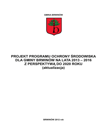 GMINA BRWINÓW PROJEKT PROGRAMU OCHRONY ŚRODOWISKA DLA GMINY BRWINÓW NA LATA 2013 – 2016 Z PERSPEKTYWĄ DO 2020 ROKU (aktualizacja) BRWINÓW 2012 rok Zamawiający: Gmina Brwinów Wykonawca: Ekolog Sp. z o.o. ul. Mścibora 8 61 – 062 Poznań Autorzy opracowania: inż. Katarzyna Walkowiak mgr Anna Grabowska – Szaniec mgr Jakub Smakulski Spis treści: Spis Tabel........................................................................................................................................................... 4 Spis Rysunków .................................................................................................................................................. 4 STRESZCZENIE ............................................................................................................................................... 5 CZĘŚĆ I – WPROWADZENIE .......................................................................................................................... 6 1. WSTĘP .......................................................................................................................................................... 6 1.1. Podstawa prawna opracowania i forma realizacji zamówienia .............................................................. 6 1.2. Zmiana uwarunkowań prawnych............................................................................................................ 6 1.3. Struktura Programu i metodyka prac...................................................................................................... 7 1.4. Zawartość dokumentu Programu ........................................................................................................... 7 2. ZAŁOŻENIA WYJŚCIOWE PROGRAMU ..................................................................................................... 8 2.1. Wprowadzenie........................................................................................................................................ 8 2.2. Uwarunkowania zewnętrzne .................................................................................................................. 8 2.2.1. Polityka Ekologiczna Państwa ........................................................................................................ 8 2.2.2. Program Ochrony Środowiska dla Województwa Mazowieckiego na lata 2011-2014 z uwzględnieniem perspektywy do 2018 r ................................................................................................... 9 2.2.3. Program Ochrony Środowiska Powiatu Pruszkowskiego............................................................. 12 2.3. Uwarunkowania wewnętrzne - Strategia rozwoju Gminy Brwinów ...................................................... 13 2.4. Racjonalne wykorzystanie zasobów naturalnych i poprawy stanu środowiska ................................... 15 2.5. Priorytety ochrony środowiska Gminy Brwinów ................................................................................... 15 2.6. Nadrzędny cel „Programu...” ................................................................................................................ 16 CZĘŚĆ II – STAN AKTUALNY ........................................................................................................................ 16 3. OGÓLNA CHARAKTERYSTYKA GMINY BRWINÓW ................................................................................ 16 3.1. Położenie i podział administracyjny ..................................................................................................... 16 3.2. Ludność i struktura osadnicza.............................................................................................................. 19 3.3. Infrastruktura ........................................................................................................................................ 19 3.4. Geologia ............................................................................................................................................... 23 5. Rzeźba terenu, geomorfologia ................................................................................................................ 23 3.6. Klimat.................................................................................................................................................... 23 4. OCHRONA ZASOBÓW NATURALNYCH ................................................................................................... 24 4.1. Ochrona przyrody................................................................................................................................. 24 4.2. Ochrona i zrównoważony rozwój lasów ............................................................................................... 35 4.3. Racjonalne gospodarowanie zasobami wodnymi ................................................................................ 35 4.4. Ochrona powierzchni ziemi .................................................................................................................. 37 4.5. Gospodarowanie zasobami geologicznymi.......................................................................................... 38 5. POPRAWA JAKOŚCI ŚRODOWISKA ........................................................................................................ 38 5.1. Ochrona powietrza ............................................................................................................................... 38 5.2. Ochrona wód ........................................................................................................................................ 43 5.3. Racjonalna gospodarka odpadami....................................................................................................... 46 5.4. Oddziaływanie hałasu i pól elektromagnetycznych.............................................................................. 47 5.5. 