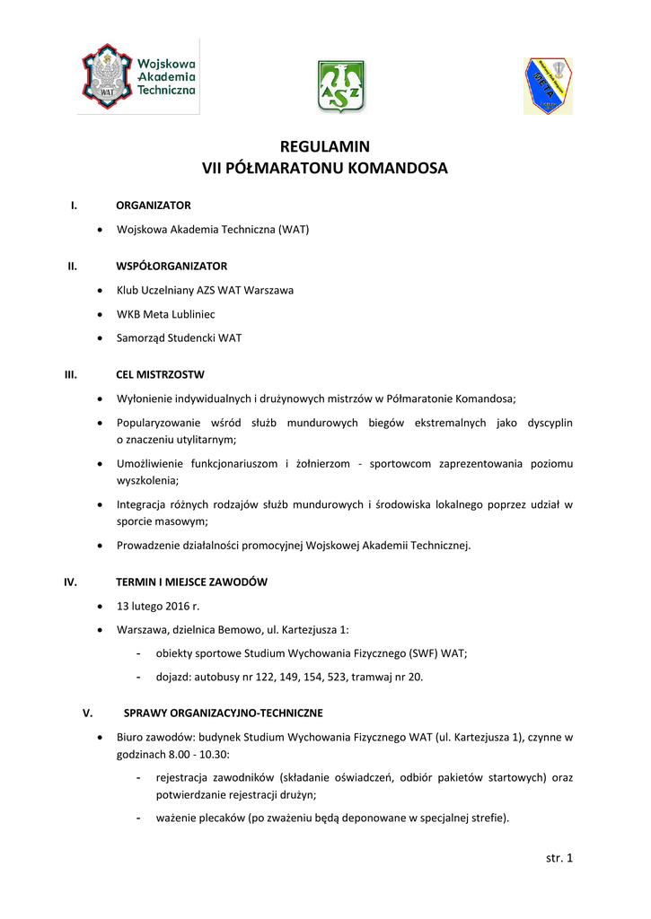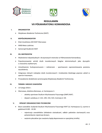 REGULAMIN VII PÓŁMARATONU KOMANDOSA I. ORGANIZATOR II. Wojskowa Akademia Techniczna (WAT) WSPÓŁORGANIZATOR Klub Uczelniany AZS WAT Warszawa WKB Meta Lubliniec Samorząd Studencki WAT III. CEL MISTRZOSTW Wyłonienie indywidualnych i drużynowych mistrzów w Półmaratonie Komandosa; Popularyzowanie wśród służb mundurowych biegów ekstremalnych jako dyscyplin o znaczeniu utylitarnym; Umożliwienie funkcjonariuszom i żołnierzom - sportowcom zaprezentowania poziomu wyszkolenia; Integracja różnych rodzajów służb mundurowych i środowiska lokalnego poprzez udział w sporcie masowym; Prowadzenie działalności promocyjnej Wojskowej Akademii Technicznej. IV. TERMIN I MIEJSCE ZAWODÓW 13 lutego 2016 r. Warszawa, dzielnica Bemowo, ul. Kartezjusza 1: V. - obiekty sportowe Studium Wychowania Fizycznego (SWF) WAT; - dojazd: autobusy nr 122, 149, 154, 523, tramwaj nr 20. SPRAWY ORGANIZACYJNO-TECHNICZNE Biuro zawodów: budynek Studium Wychowania Fizycznego WAT (ul. Kartezjusza 1), czynne w godzinach 8.00 - 10.30: - rejestracja zawodników (składanie oświadczeń, odbiór pakietów startowych) oraz potwierdzanie rejestracji drużyn; - ważenie plecaków (po zważeniu będą deponowane w specjalnej strefie). str. 1 Wydawane w trakcie rejestracji zawodników numery startowe należy umieścić: - mniejszy - na prawej nodze zawodnika; - większy - na plecaku. Zawodnicy pobierają plecaki ok. godz. 10.40 (po ogłoszeniu przez kierownika zawodów); Start o godz. 11:00: - linia startu i mety znajduje się przed wejściem głównym do budynku SWF; Długość trasy biegu: 21 kilometrów i 97,5 metra: - bieg po ścieżkach placu ćwiczeń taktycznych WAT (4 okrążenia); - limit na pokonanie trasy to 4 godz. Na wyznaczonych punktach kontrolnych oraz po ukończeniu biegu przewidziane jest ważenie plecaków; Trasa biegu nie posiada atestu PZLA; Napoje dostępne będą w okolicach startu-mety; Nie zezwala się na podawanie picia i odżywek przez osoby trzecie na trasie biegu (z wyjątkiem miejsca wyznaczonego przez organizatorów); Zabroniona jest jakakolwiek pomoc, w tym towarzyszenie osób trzecich na trasie biegu (z wyjątkiem punktu kontrolnego); Dekoracja zwycięzców poszczególnych klasyfikacji oraz wręczenie pucharów i wyróżnień przewidziane jest w budynku SWF ok. godz. 14.00. VI. ZASADY UCZESTNICTWA Limit startujących: 250 osób. Prawo startu mają osoby, które: - są pełnoletnie; - okażą dokument tożsamości; - będą przestrzegać zasad określonych w niniejszym Komunikacie Organizacyjnym; - występują w pełnym umundurowaniu polowym lub ćwiczebnym (mundur z długim rękawem, beret lub czapka połowa, buty krój wojskowy - wys. cholewki min. 8 cali = 20,24cm) z plecakiem (min. wymiary 45x30cm) w kolorze odpowiadającym umundurowaniu o wadze min. 10 kg na całej trasie biegu; str. 2 - zezwala się na zastosowanie dodatkowych cywilnych przedmiotów jeśli ich kształt i kolor są typu wojskowego oraz na start w mundurach polowych wojsk innych państw. O dopuszczeniu decyduje sędzia zawodów. Zawodnicy podczas rejestracji podpisują oświadczenie o braku przeciwwskazań zdrowotnych do udziału w biegach długodystansowych i własnej odpowiedzialności za wszelkie konsekwencje zdrowotne związane z udziałem w tym biegu. Wskazane jest wcześniejsze wykonania badań lekarskich; W oświadczeniu zawodnicy wyrażają również zgodę na publikację ich wyników i wizerunku (np. imienna tabela wyników, publikacja zdjęcia, itp.). Zawodnicy nie spełniający w/w warunków nie zostaną dopuszczeni do startu w zawodach VII. ZGŁOSZENIA Zgłoszenie do biegu przyjmowane są poprzez formularz zgłoszeniowy dostępny na stronie: http://www.polmaratonkomandosa.wat.edu.pl w zakładce Rejestracja. W zgłoszeniu należy podać swoje dane: stopień, imię, nazwisko, nazwę reprezentowanej jednostki lub instytucji (ew. przynależność klubową), rocznik, adres e-mailowy (do kontaktu). Zgłoszenia można dokonywać od 4.01.2016 r. do 31.01.2016 r. (lub wyczerpania limitu miejsc). Przyjęcie zgłoszenia będzie potwierdzone droga mailową. Nie jest to równoznaczne z zatwierdzeniem kandydata do startu w zawodach. W celu ukończenia rejestracji należy w ciągu 7 dni od zgłoszenia uiścić opłatę startową. Po zaksięgowaniu wpłaty nastąpi rejestracja zawodnika na liście startowej. Pełna lista osób startujących zostanie opublikowana http://www.polmaratonkomandosa.wat.edu.pl do 1 lutego 2016 r. VIII. na stronie ZASADY FINANSOWANIA Zawodnicy wnoszą opłatę startową w wysokości 95 zł na konto: KU AZS WAT ul. Kartezjusza 1, 00-908 Warszawa PKO BP S A. 78 1020 1185 0000 4802 0200 5601 tytuł wpłaty: VII Półmaraton Komandosa, imię i nazwisko, rok urodzenia Wpłaty, które zostaną zaksięgowane po terminie zostaną zwrócone; W wypadku wniesienia opłaty startowej i rezygnacji zawodnika z udziału w zawodach, wpłaty nie będą zwracane. Nie ma też możliwości przenoszenia opłaty na inną osobę. str. 3 Zawodnicy przyjeżdżają na koszt własny lub jednostki (organizacji) delegującej; Organizatorzy nie zapewniają noclegów dla uczestników zawodów; W opłacie startowej uwzględniony jest ciepły posiłek regeneracyjny (wydawany po biegu) oraz koszulka okolicznościowa. IX. KLASYFIKACJA KOŃCOWA Indywidualna: kobiety i mężczyźni bez podziału na kategorie wiekowe; Drużynowa: zwycięża drużyna z najlepszym czasem (trzy najlepsze wyniki zawodników z drużyn o jednobrzmiącej nazwie). Indywidualna i drużynowa: podchorążych i szkół wojskowych. X. NAGRODY Dla zwycięzców poszczególnych klasyfikacji przewidziano puchary. Wszyscy, którzy ukończą bieg otrzymają pamiątkowe medale oraz koszulki. XI. XII. POSTANOWIENIA KOŃCOWE Bieg odbędzie się bez względu na warunki atmosferyczne; Organizatorzy zapewniają opiekę lekarską (związaną z biegiem) w trakcie trwania imprezy biegowej; Organizatorzy zapewniają szatnie, natryski i toalety w trakcie trwania imprezy; Organ