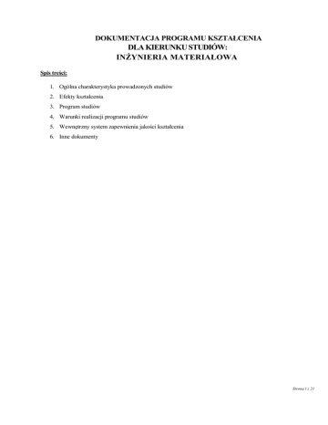 DOKUMENTACJA PROGRAMU KSZTAŁCENIA DLA KIERUNKU STUDIÓW: INŻYNIERIA MATERIAŁOWA Spis treści: 1. Ogólna charakterystyka prowadzonych studiów 2. Efekty kształcenia 3. Program studiów 4. Warunki realizacji programu studiów 5. Wewnętrzny system zapewnienia jakości kształcenia 6. Inne dokumenty Strona l z 21 1. OGÓLNA CHARAKTERYSTYKA PROWADZONYCH STUDIÓW a) Nazwa kierunku studiów: Inżynieria Materiałowa. b) Poziom kształcenia: studia II stopnia. c) Profil kształcenia: ogólnoakademicki. d) Forma studiów: studia stacjonarne/niestacjonarne e) Tytuł zawodowy uzyskiwany przez absolwenta, oraz ogólne informacje związane z programem kształcenia: magister inżynier. f) Przyporządkowanie do obszaru lub obszarów kształcenia: obszar nauk technicznych g) Wskazanie dziedzin nauki i dyscyplin naukowych, do których odnoszą się efekty kształcenia: dziedzina nauk technicznych w zakresie dyscyplin naukowych: inżynieria materiałowa, inżynieria produkcji h) Wskazanie związku z misją Uczelni i strategią jej rozwoju: Podstawowym zadaniem Politechniki Lubelskiej jest kształcenie młodzieży studenckiej na kompetentnych specjalistów oraz światłych i odpowiedzialnych obywateli naszej Ojczyzny. Zapewnienie najwyższego poziomu pracy dydaktycznej, naukowej i wychowawczej jest główną społeczną rolą Uczelni, a udział w tworzeniu europejskiej przestrzeni edukacyjnej - obowiązkiem wobec przyszłych pokoleń. Inżynieria Materiałowa, w tym specjalności Inżynieria Kompozytów i Inżynieria Powierzchni, jest nowoczesnym kierunkiem studiów obejmującym wiedzę z dziedziny nauk technicznych. Kształcenie na kierunku Inżynieria Materiałowa Ukazana zapewnia uzyskanie jedności edukacji i nauki, co służy wspieraniu środowiska gospodarczego i technicznego, szczególnie z regionu lubelskiego, poprzez kształcenie inżynierów posiadających kompetencje niezbędne do zadań inżynierskich związanych z technologią kompozytów i inżynierią powierzchni. i) Ogólne cele kształcenia oraz możliwości zatrudnienia (typowe miejsca pracy) i kontynuacji kształcenia przez absolwentów studiów: Celem kształcenia jest uzyskanie przez absolwenta umiejętności posługiwania się zaawansowaną wiedzą z zakresu inżynierii materiałowej oraz nauki o materiałach inżynierskich metalowych, ceramicznych, polimerowych i kompozytowych oraz komputerowego wspomagania prac inżynierskich i komputerowej nauki o materiałach jako narzędzi projektowania materiałowego produktów i elementów a także technologii wytwarzania i przetwórstwa materiałów inżynierskich oraz metod kształtowania i badania struktury i właściwości materiałów. W oparciu o znajomość kryteriów doboru materiałów oraz technologii wytwarzania i kształtowania ich właściwości, absolwent dysponuje zaawansowaną wiedzą z zakresu projektowania materiałowego różnych produktów, a także technologii ich wytwarzania, przetwórstwa i recyklingu. Posiada znajomość metodyki badawczej oraz zarządzania zespołami ludzkimi w środowiskach przemysłowych oraz małych i średnich przedsiębiorstwach związanych z wytwarzaniem i przetwórstwem materiałów inżynierskich. Absolwent jest przygotowany do: podejmowania aktywności badawczej w zakresie inżynierii materiałowej, w tym: obsługi specjalistycznej aparatury do badania struktury i właściwości materiałów inżynierskich, kierowania zespołami działalności badawczej, obsługi systemów informatycznych oraz systemów komputerowego wspomagania prac inżynierskich w zakresie inżynierii materiałowej i technologii materiałowych, projektowania procesów technologicznych w zakresie inżynierii materiałowej i technologii materiałowych, podejmowania twórczych inicjatyw i decyzji dotyczących inżynierii i technologii materiałowych, samodzielnego prowadzenia działalności gospodarczej, a także działalności w małych i średnich przedsiębiorstwach. Absolwent jest przygotowany do pracy w: przedsiębiorstwach przemysłowych wytwarzających, przetwarzających lub stosujących materiały inżynierskie; małych i średnich jednostkach gospodarczych, w tym przedsiębiorstwach obrotu materiałami inżynierskimi i aparaturą do ich badania; instytutach naukowo-badawczych i ośrodkach badawczo-rozwoj owych; instytucjach zajmujących się poradnictwem i upowszechnianiem wiedzy z zakresu inżynierii materiałowej i technologii materiałowych oraz Strona 2 z 21 komputerowego wspomagania w technice; biurach projektowych i doradczych oraz instytucjach tworzących i eksploatujących komputerowe systemy informatyczne stosowane w inżynierii materiałowej. Absolwent powinien znać język obcy na poziomie biegłości B2+ Europejskiego Systemu Opisu Kształcenia Językowego Rady Europy oraz posiadać umiejętności posługiwania się językiem specjalistycznym z zakresu kierunku kształcenia. Absolwent jest przygotowany do podjęcia studiów trzeciego stopnia w dziedzinie nauk technicznych. j) Wymagania wstępne (oczekiwane kompetencje kandydata) - w przypadku studiów drugiego stopnia: Osoba ubiegająca się o przyjęcie na studia drugiego stopnia na kierunku inżynieria materiałowa musi posiadać kwalifikacje pierwszego stopnia oraz kompetencje niezbędne do kontynuowania kształcenia na tym kierunku na studiach drugiego stopnia. Kompetencje te obejmują w szczególności: - wiedzę z zakresu matematyki wyższej niezbędną do formułowania i rozwiązywania zagadnień o średnim poziomie złożoności, - umiejętności analizowania problemów oraz znajdowania rozwiązań przy wykorzystaniu podstawowych twierdzeń i metod, w tym metod wykorzystujących odpowiednie pakiety oprogramowania, - umiejętności planowania i wykonywania prostych badań doświadczalnych lub obserwacji procesów oraz analizowania ich przebiegu i wyników, - umiejętności przygotowania i zaprezentowania opracowania, przedstawiającego analizowany problem, popartego informacjami pozyskanymi z w